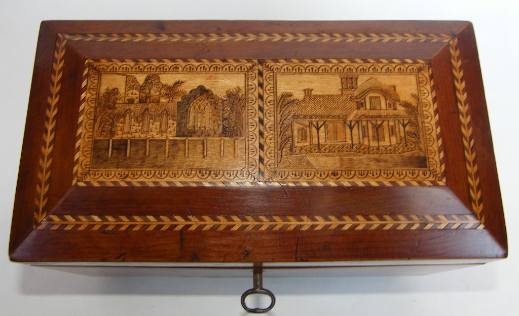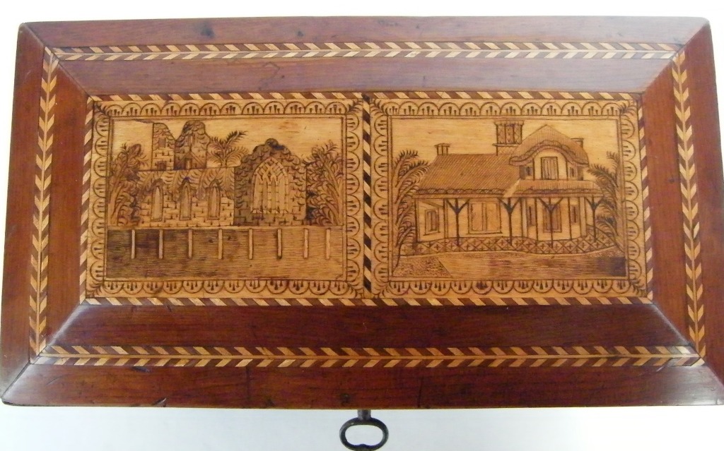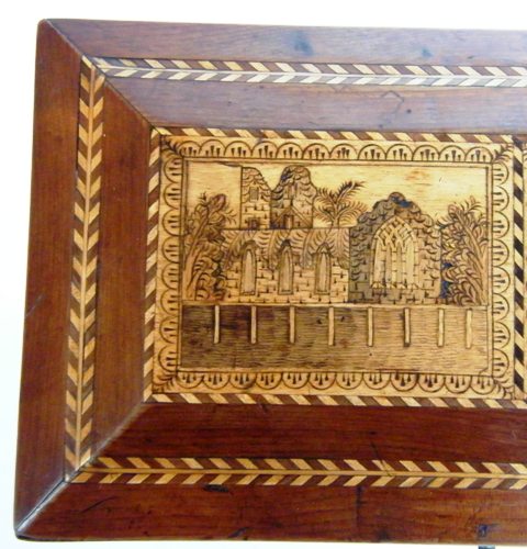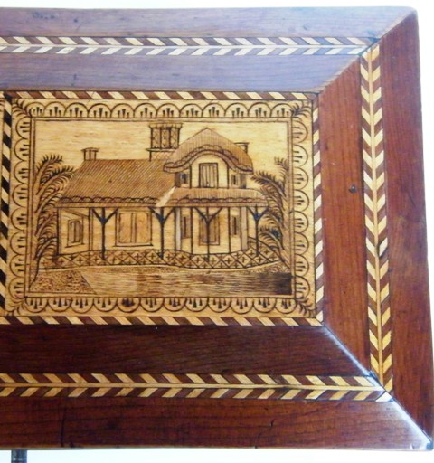 The domed top with views of Muckross and Glena Cottage executed in pyrography within a chevron inlaid banding with a further outer herringbone inlay.