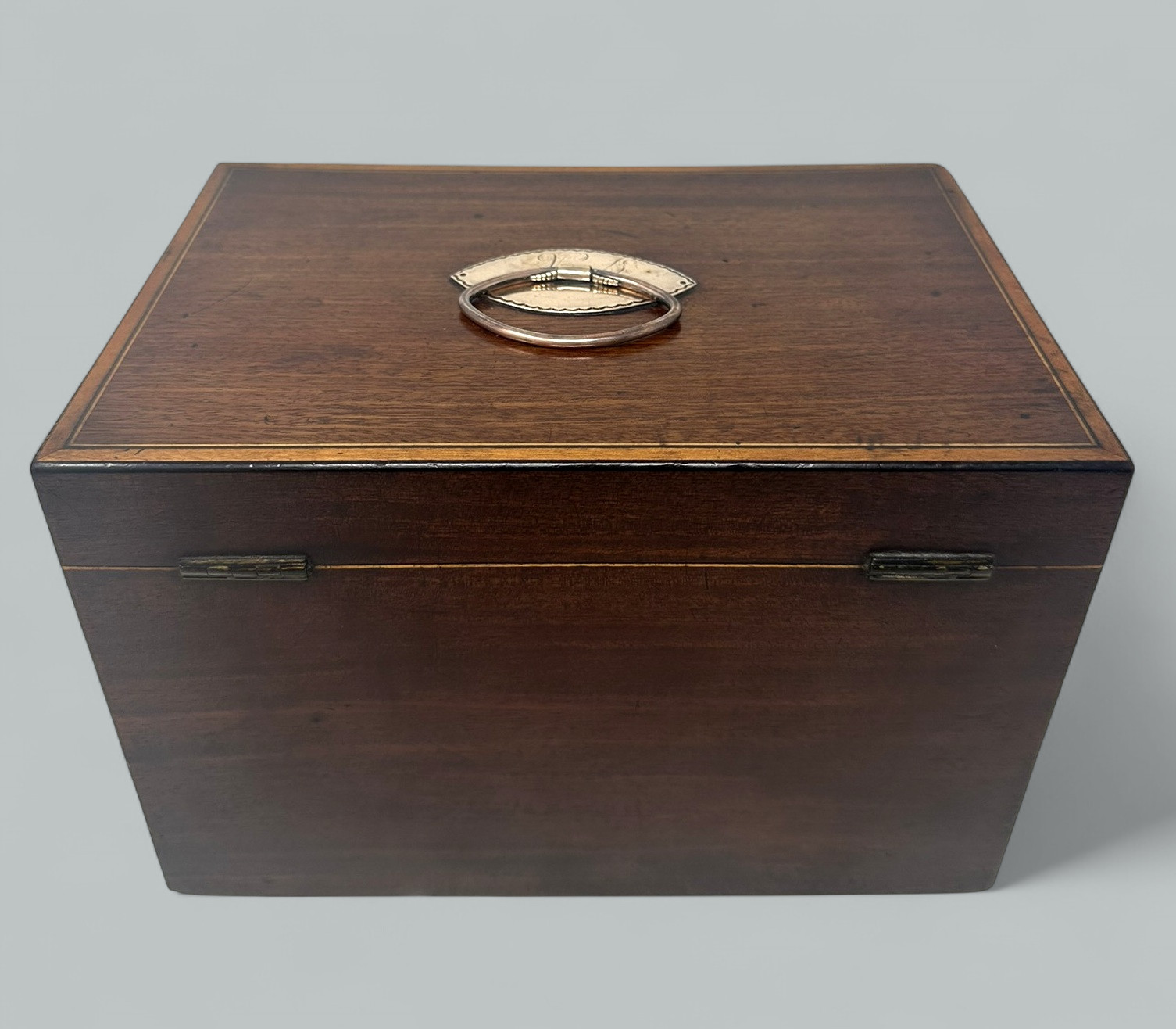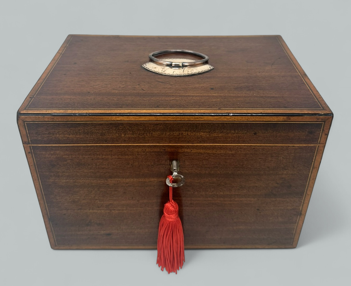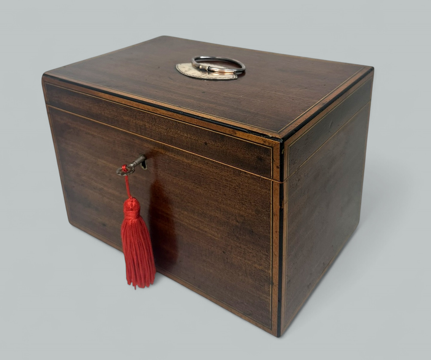 A Superb Example of an English Georgian Period Well figured Mahogany Double Interior Section Tea Caddy of flat rectangular outline, generous proportions and outstanding quality, all areas are edged with Satinwood and Ebony string inlays, firmly attributed to renowned Cabinet Maker Gillows of Lancaster and London. Last quarter of the Eighteenth Century.