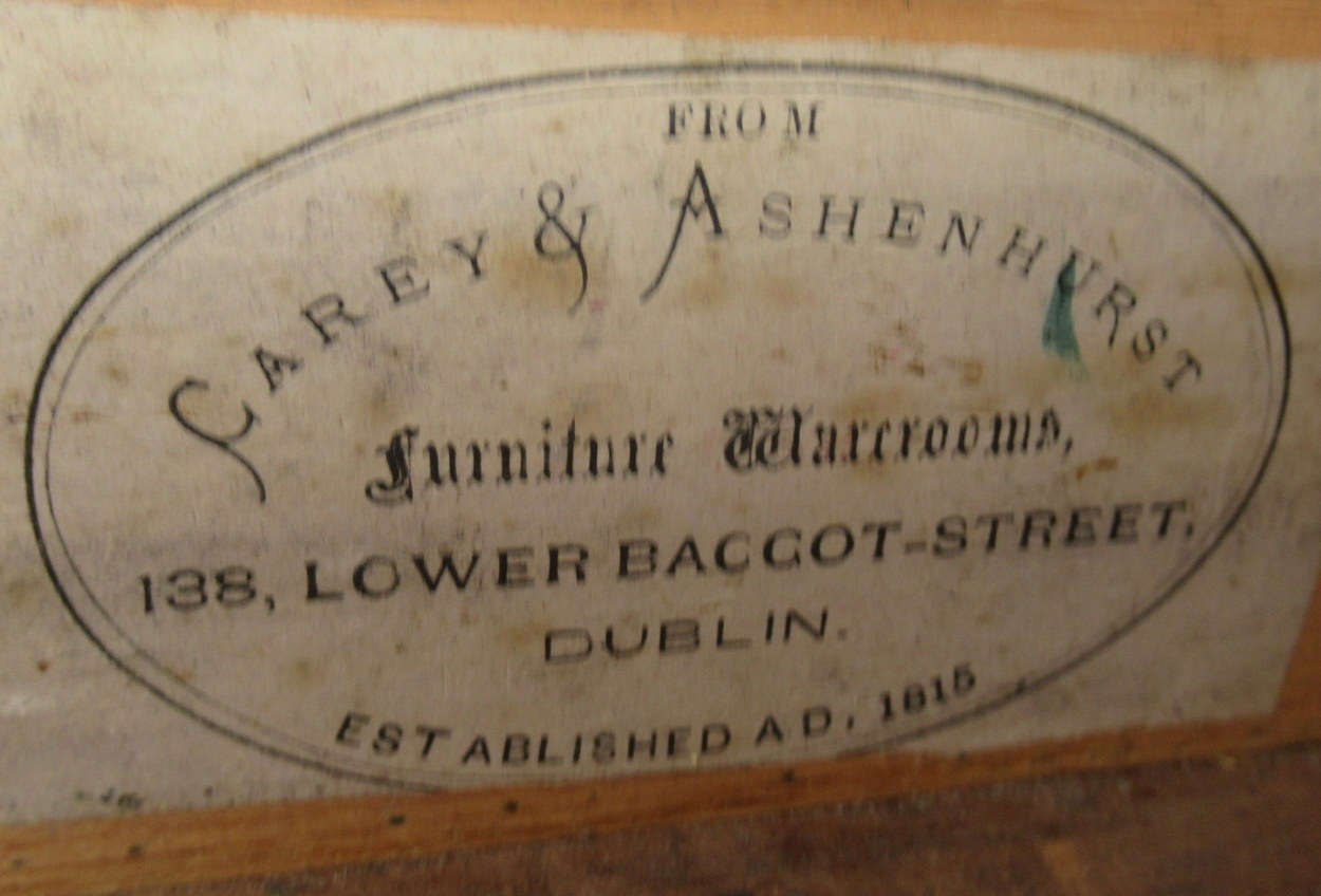 Carey & Ashenhurst began making furniture in 1815 from workshops at 54 York Street, later in the Nineteenth Century moved to 138 Lower Baggot Street where they traded as Cabinetmakers, Upholsterers and Undertakers.