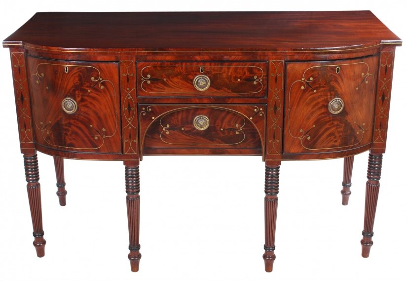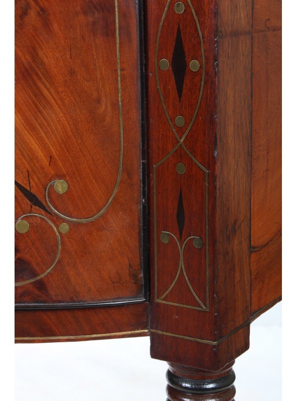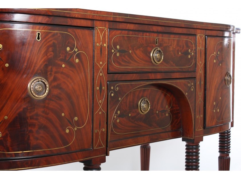 An Exceptionally Fine Quality English Regency Well Figured Flame Grained Cuban Mahogany Bow-Fronted Sideboard, with lavish Ebony and Brass strung inlays, in the manner of Gillows.