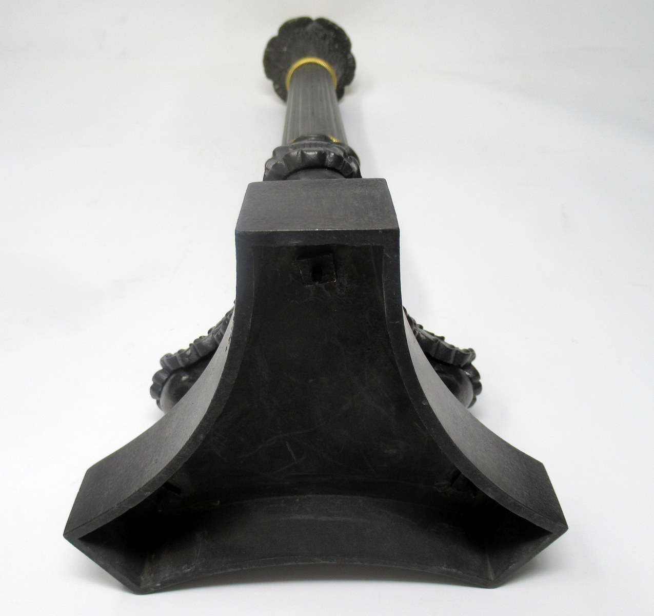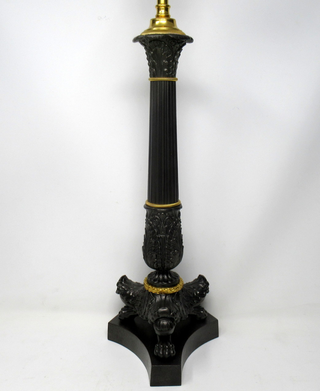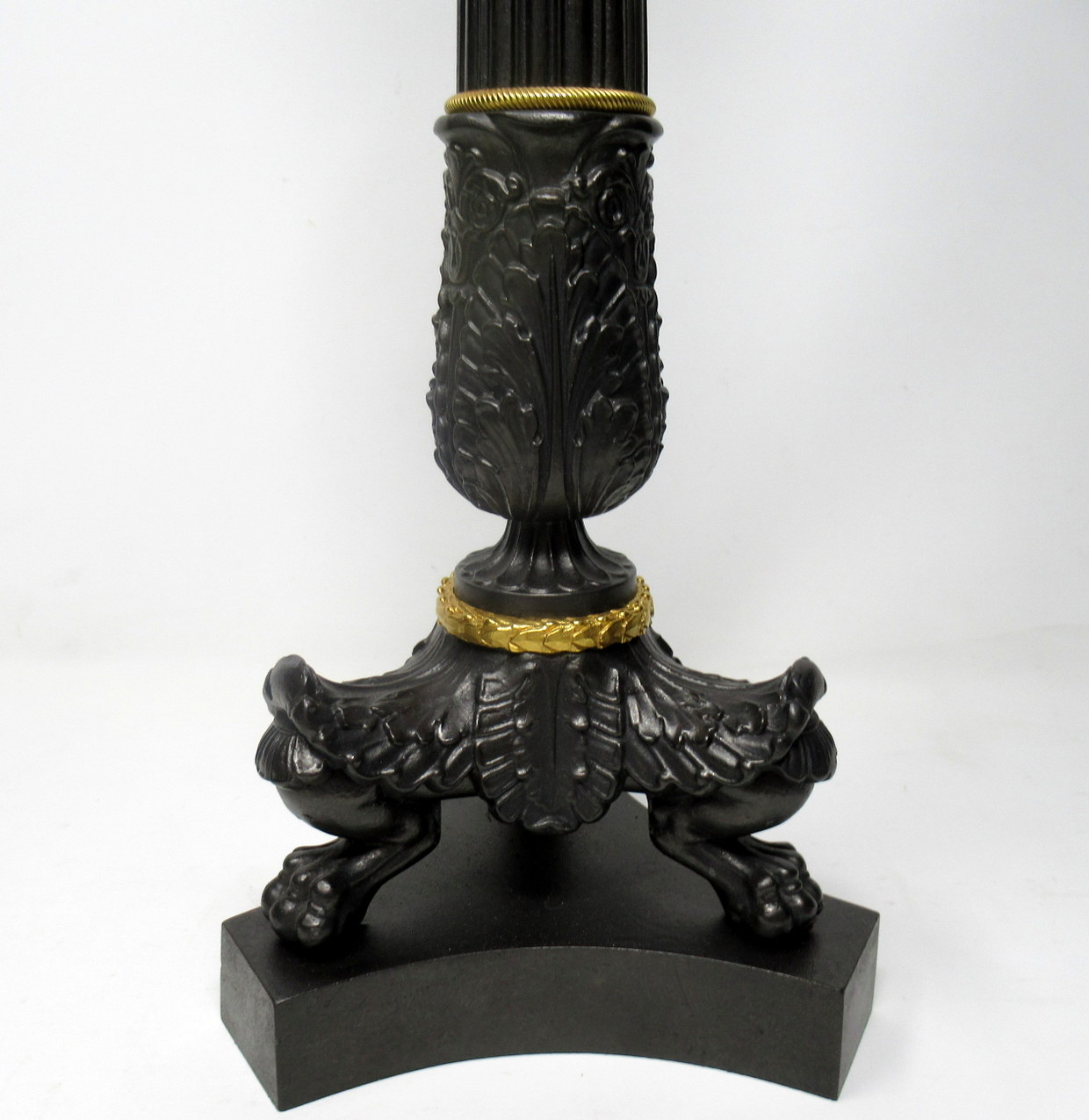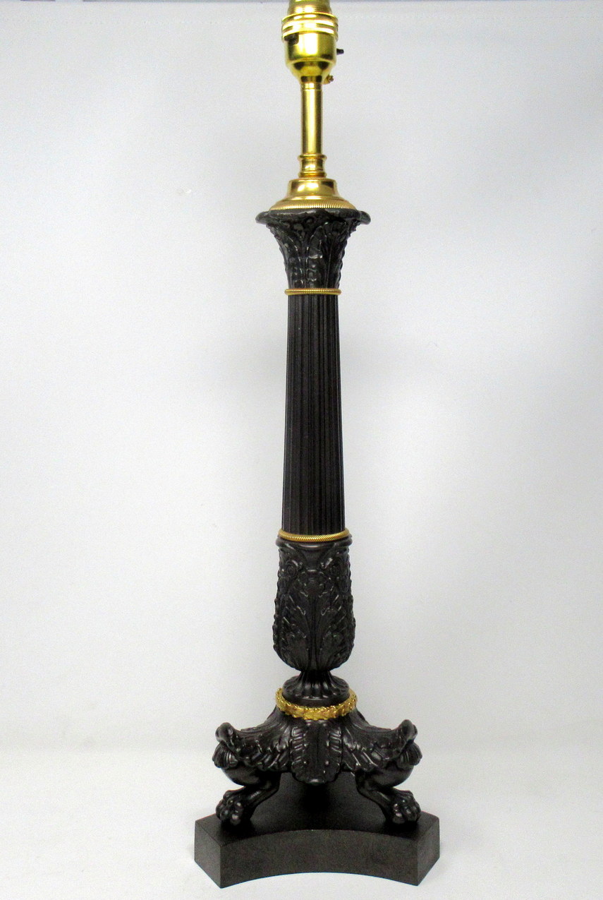 Stunning French Heavy Gauge Ormolu and Bronzed Single Light Candlestick of good size proportions, now converted to a Single Electric Table Lamp, of nice tall proportions, with tapering reeded central bronzed column, ending with three very ornate monopodia supports modelled as leaves with a central shell and claw feet on tri-form inverted plain platform base. Mid to late Nineteenth Century.