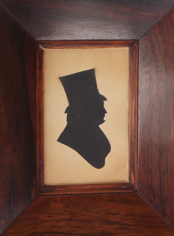 An Exceptionally Fine Pair of Georgian Male Silhouettes (black ink on card) enclosed within their original figured Rosewood Frames, by Anglo American Silhouettist William James Huband 1801-1862.