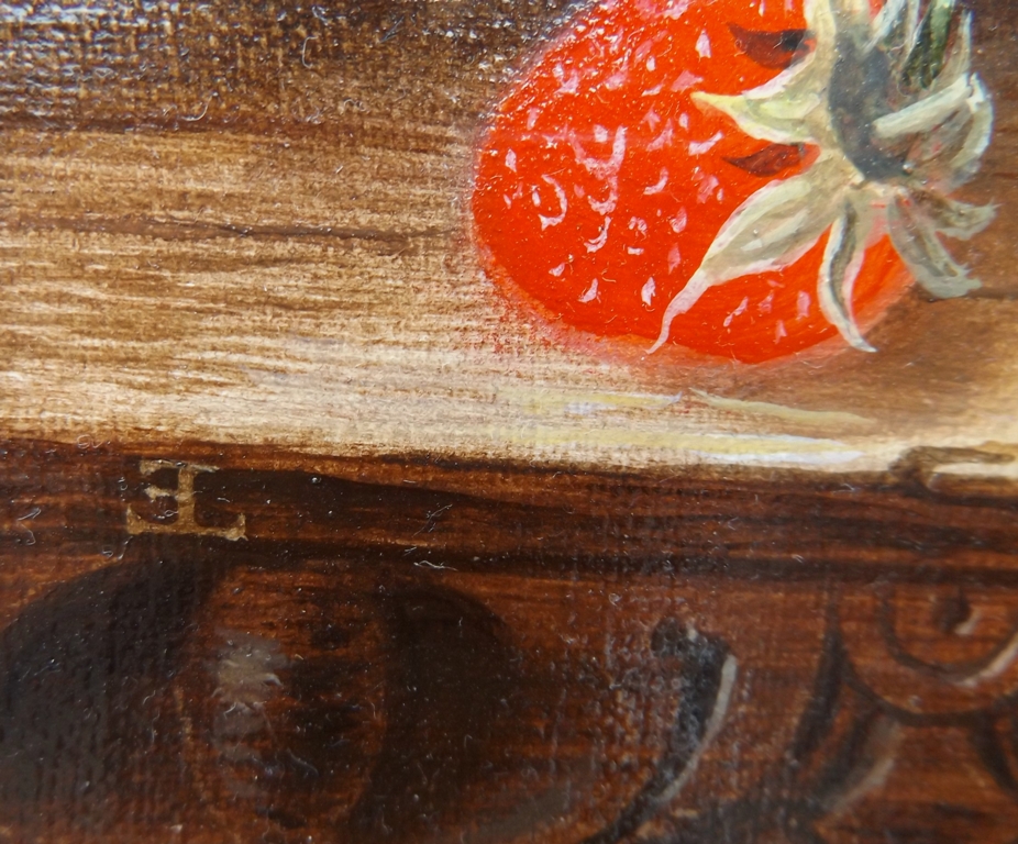 Ladell specialised in still lifes composed of fruit, flowers and a variety of objects including glass, tankards, china vases and bird’s nests. His technique achieved an astonishing degree of realism. Ladell’s paintings are always easily recognisable as he used to use the same articles over and over again on a marble ledge draped with an oriental rug. His work was much sought after and they often ensured flattering notices from the leading representative journals. His biographer Frank Lewis writes: ‘he paints with the fidelity of an old Dutchman and with the brilliancy of colour all of his own. A dead duck lying upon a board, as represented by Mr. Ladell, is a duck indeed…maybe it’s a branch from a raspberry bush laid carefully down, and while the fruit is round and luscious, over-ripe or scarcely ripe, the leaves whether fresh or fading, are represented with a verisimilitude that is marvellous.’