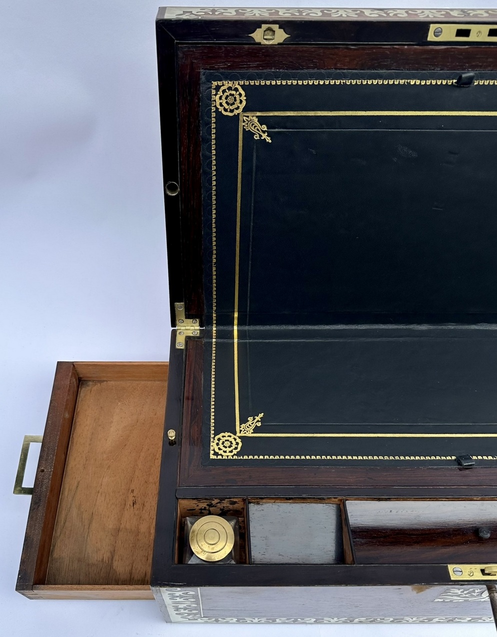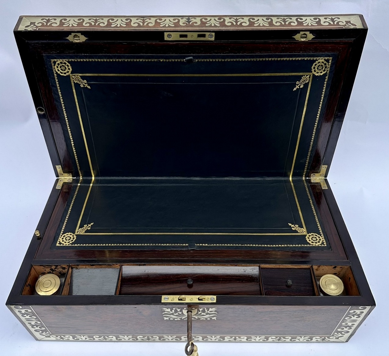 An Exceptionally Fine Quality English Well Figured Rosewood Ladies or Gents English Georgian Travelling Writing Slope of outstanding quality and unusually large proportions, with lavish brass inlay decoration, twin polished brass carry handles, early 19th Century, complete with original fitted interior, to include three secret drawers.