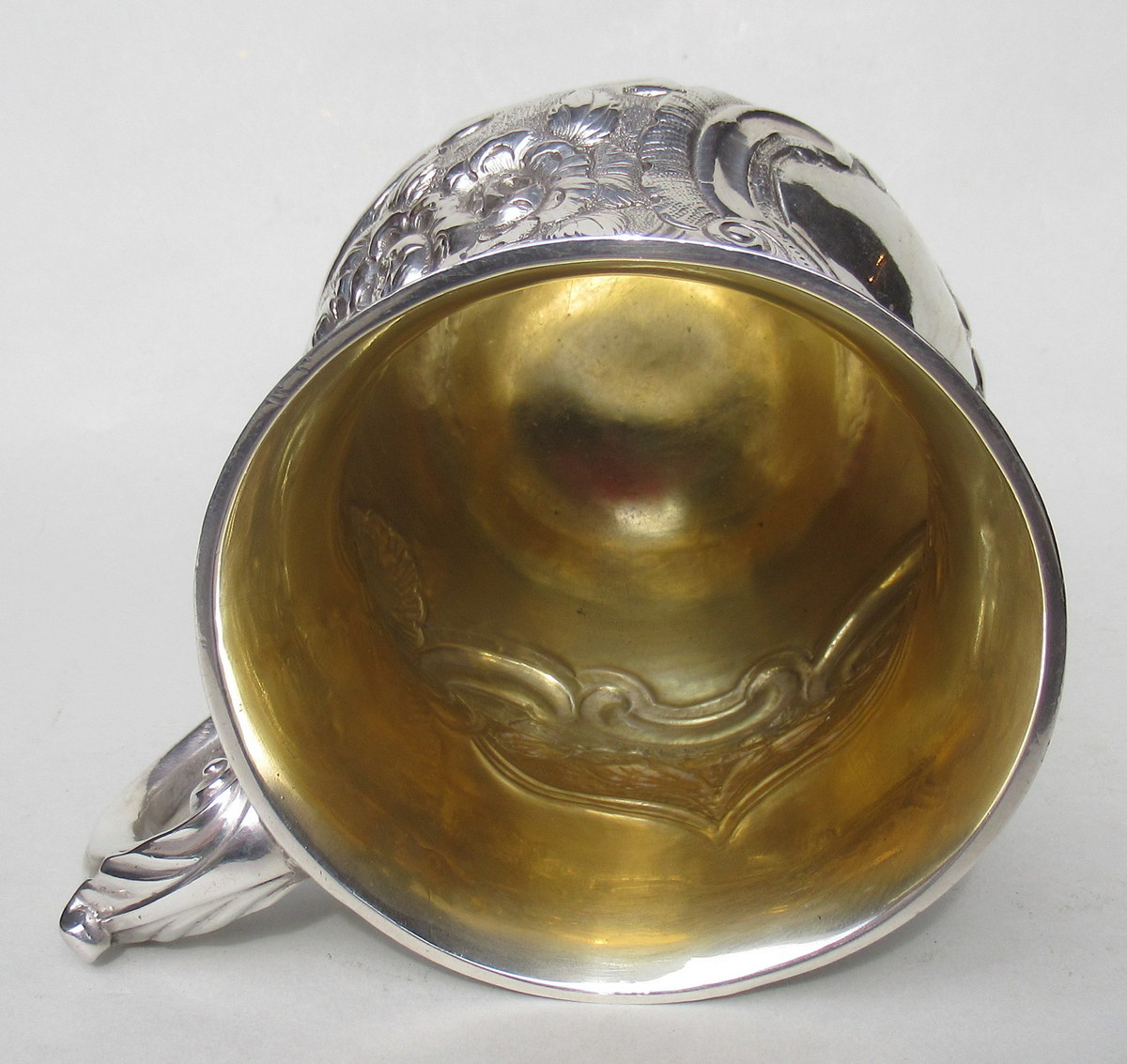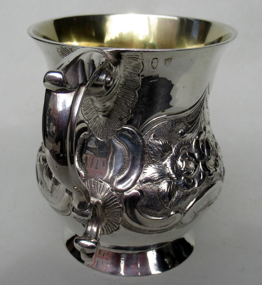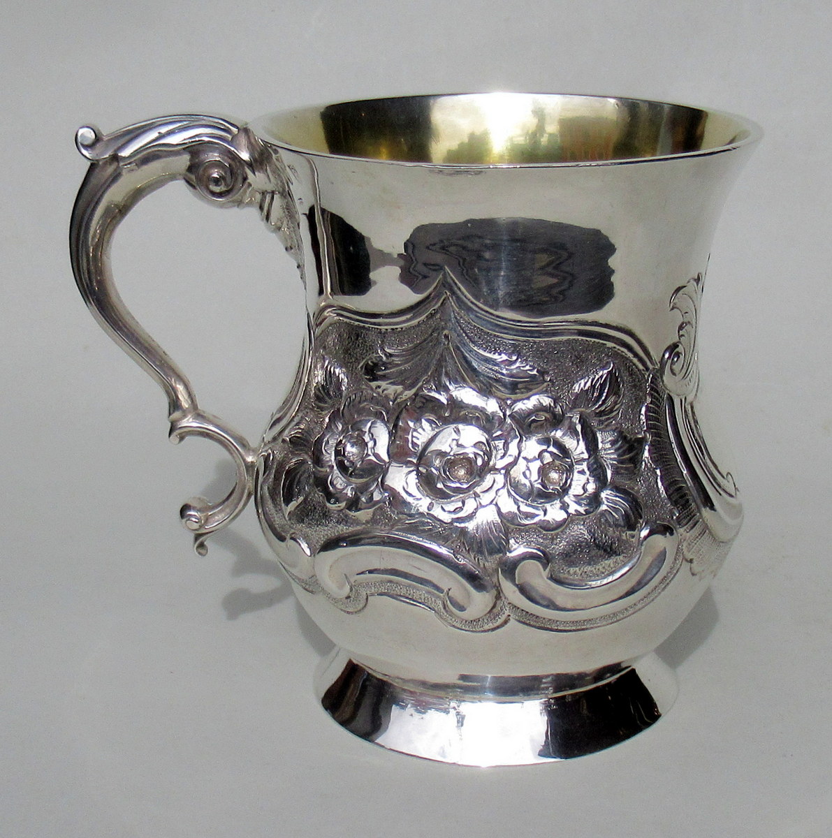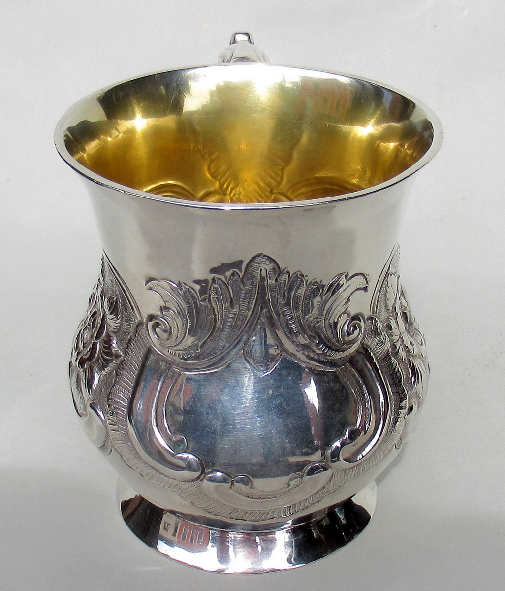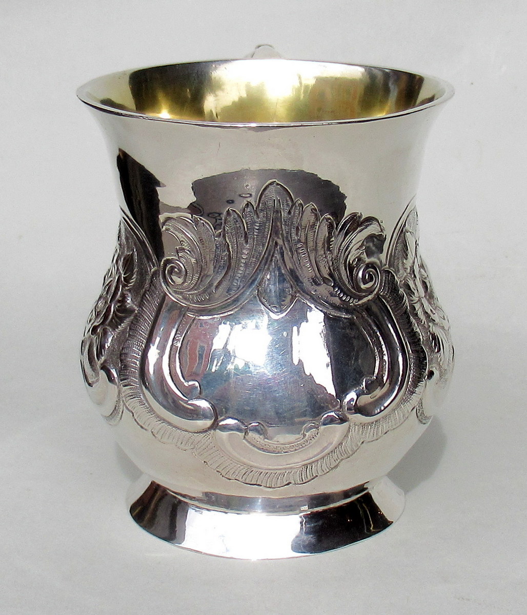 Superb Heavy Gauge Irish Georgian Eighteenth Century Silver Mug of baluster outline, with interior gilt and leaf capped double scroll handle on circular domed footed base, of outstanding quality and exceptional condition for such an early piece.