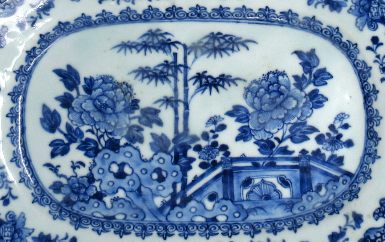 The central rectangular reserve painted with large Peony Floweres and a palm tree, the outer rim with unusual foliate scrolls and Chrysanthemums.