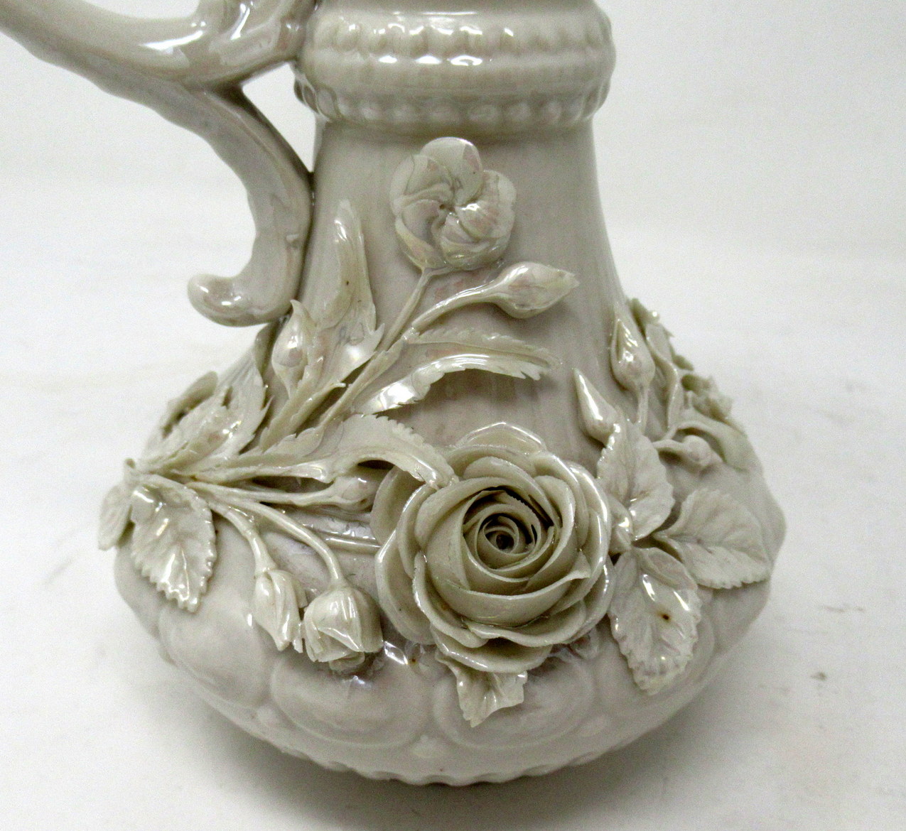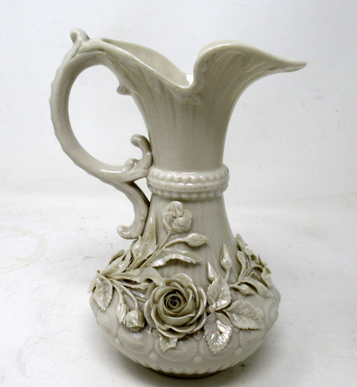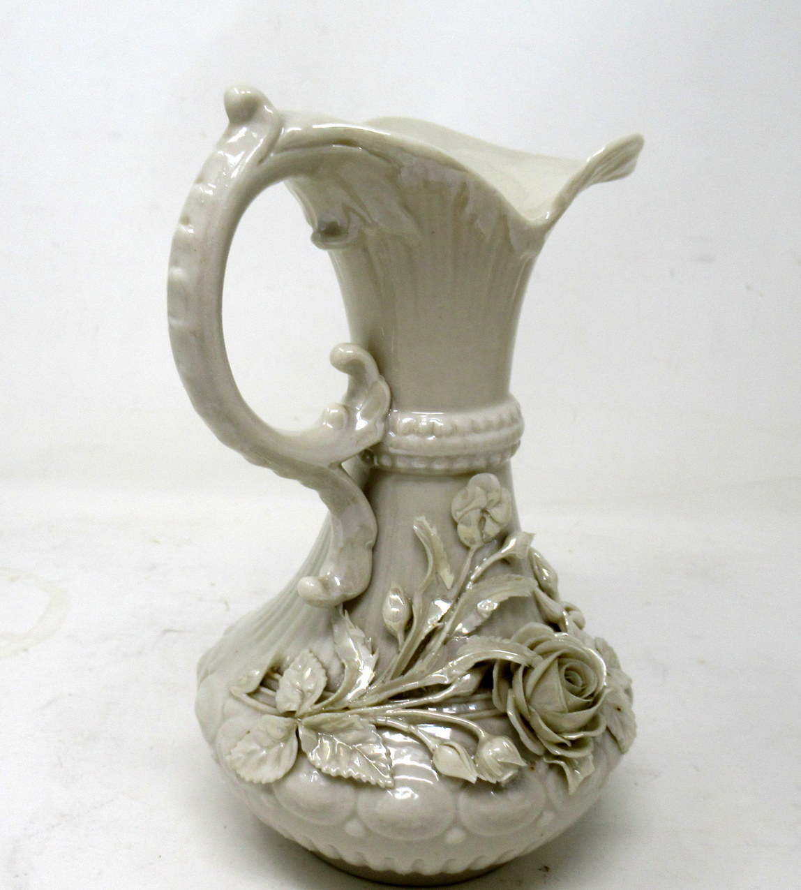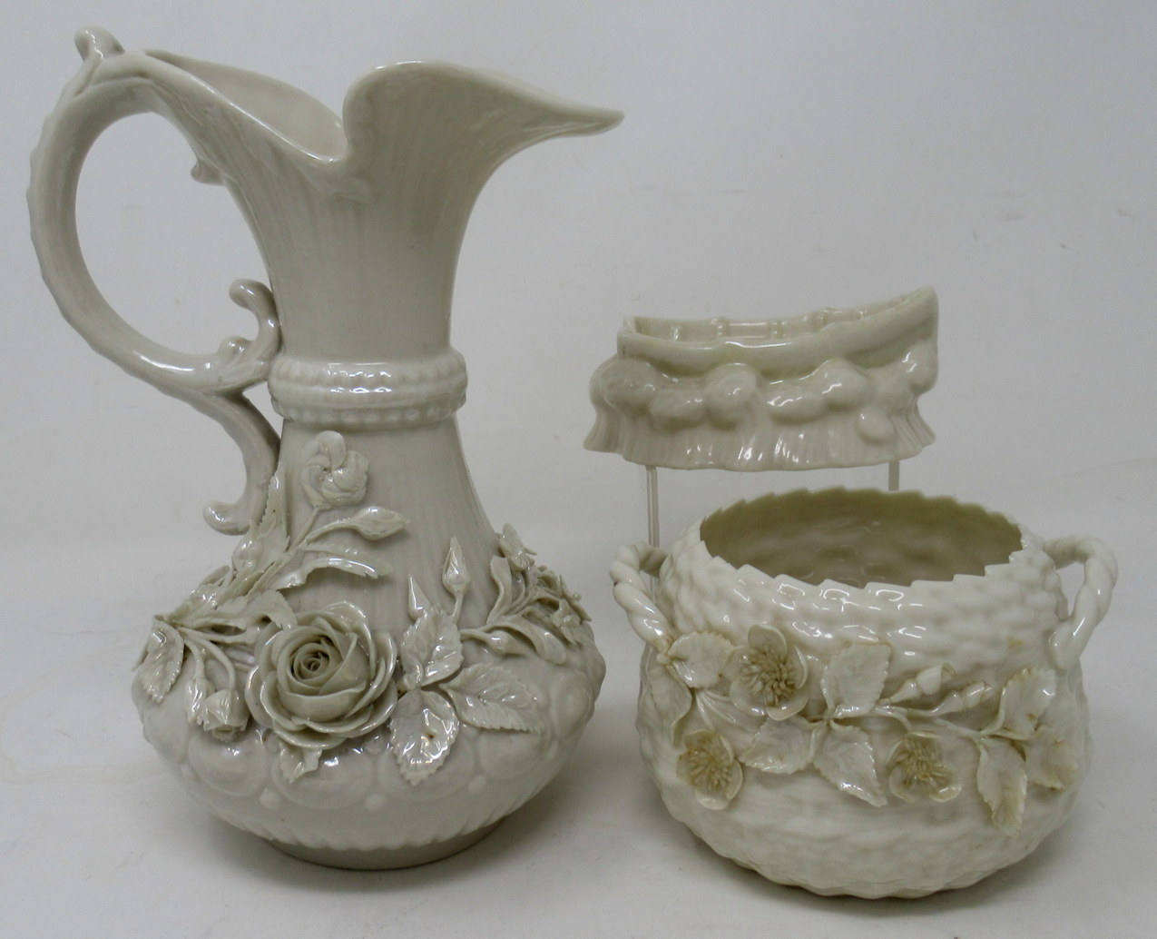 141. Antique Irish Belleek Porcelain Aberdeen Pitcher Ewer Salt Centerpiece Ireland