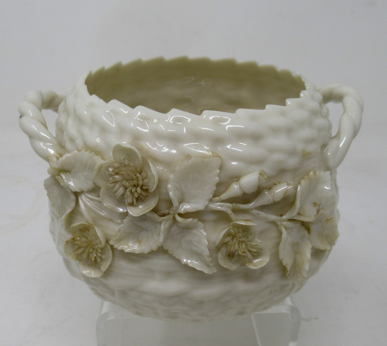 Rare Basker weave twin handle bowl or centerpiece with lavish applied decoration of flowers and leaves.