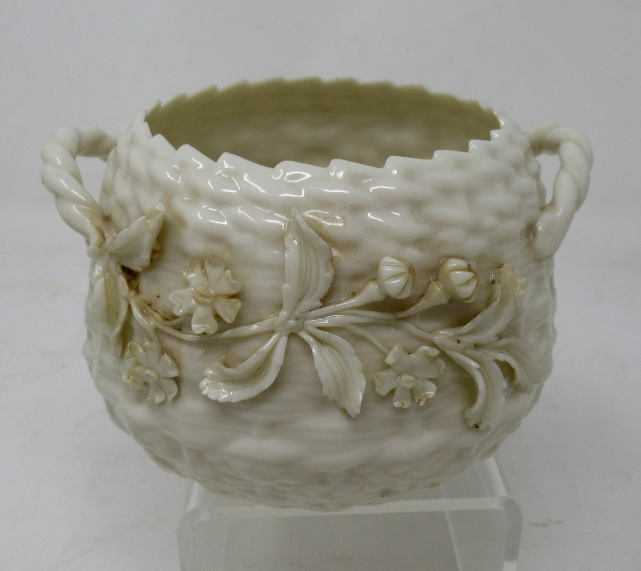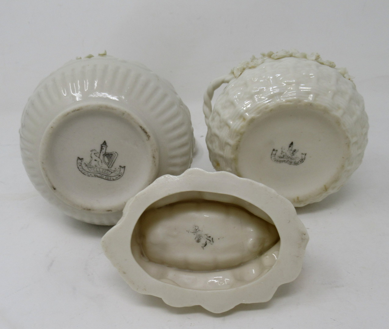Stunning assembled Collection of three wonderful early Irish Black Mark Belleek Items to include a quite rare seldom seen rope handled small bowl.