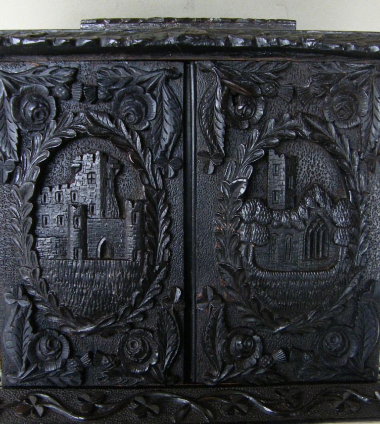 Irish Bog Oak wood is a rare timber which is excavated from deep underground, usually as a by-product of turf cutting, or when bogland is drained for agricultural use. The wood varies in age, usually ranging between 2,000 and 6,000 years old, The wood has been preserved due to the unique conditions of the Turf bogs in Ireland which waterlog the wood and keep it free from oxygen and sunlight which would cause it to decay. The chemistry of the Bog also reacts with the wood and transforms it’s colour. Bog Oak is usually jet black, but occasionally a very dark brown. Throughout the Nineteenth Century and later many decorative items such as small furniture, Writing Slopes Book Slides and Ladies Jewellery, always with distinctive hand carved Irish subjects. This is a very nice item in superb condition.