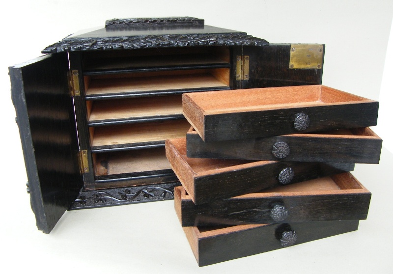 Very Fine Hand Carved Irish Bog Oak Twin Door Table Casket – Jewellery Cabinet, with domed shaped top and central rectangular tablet, mid Nineteenth Century.