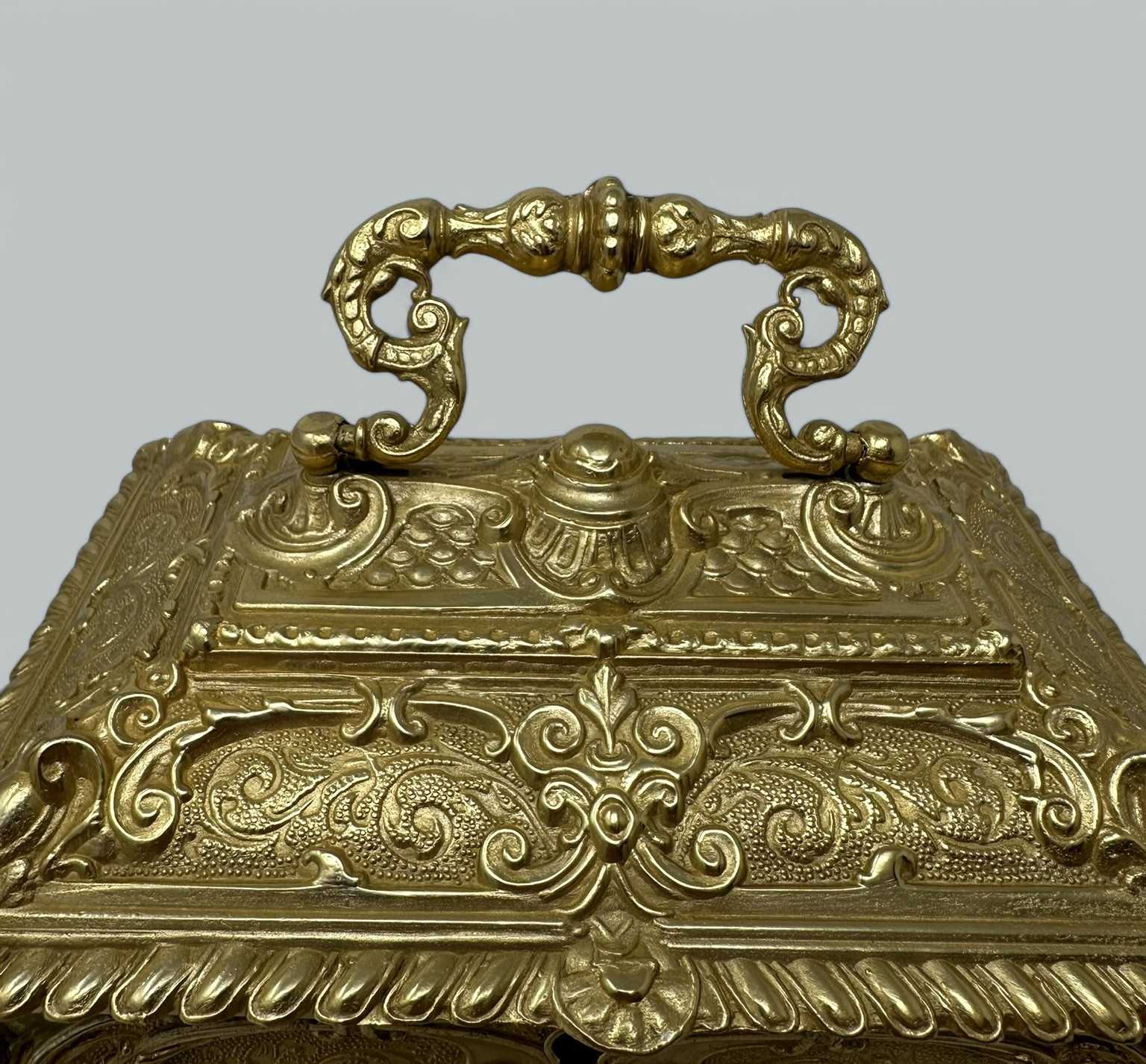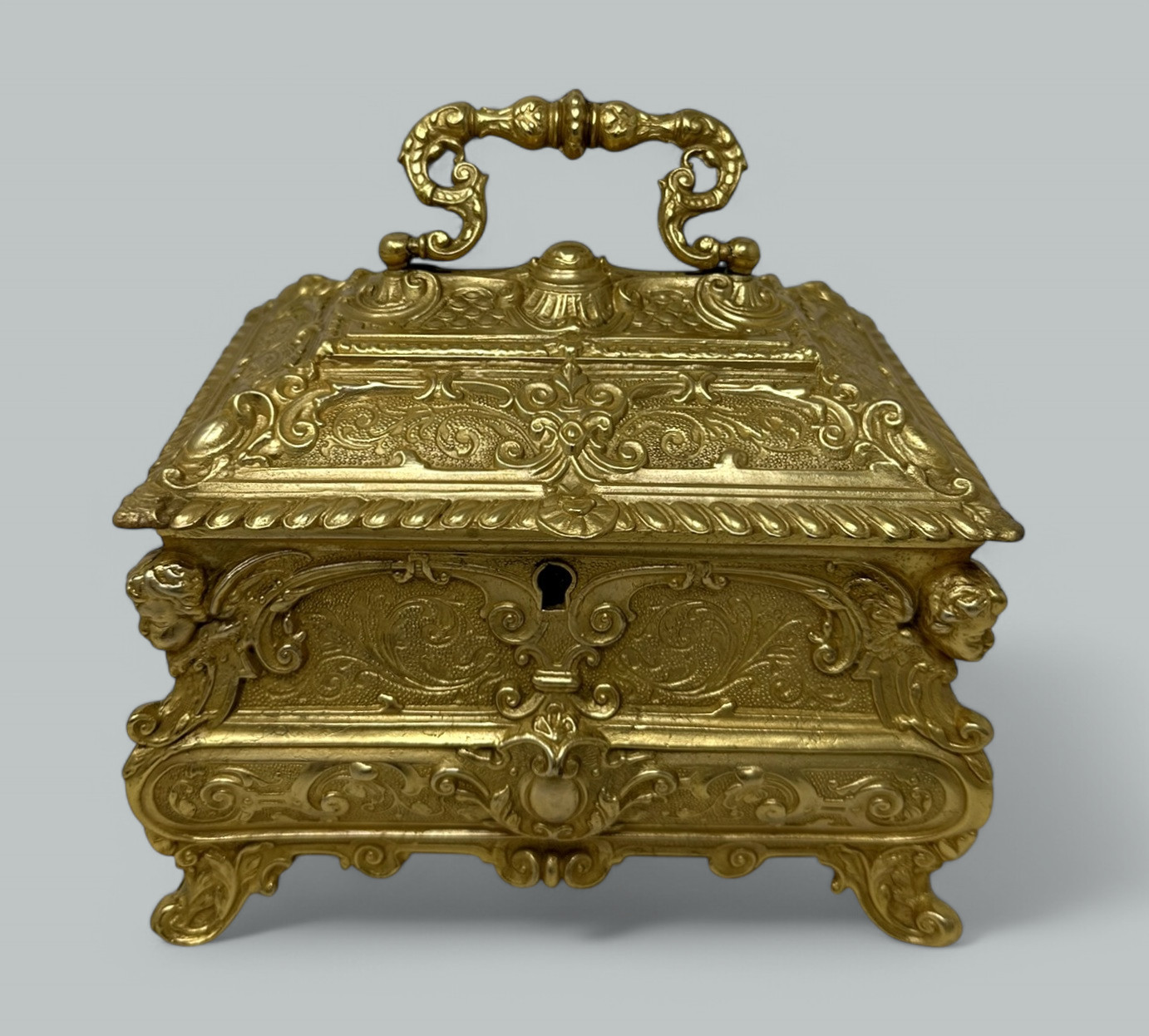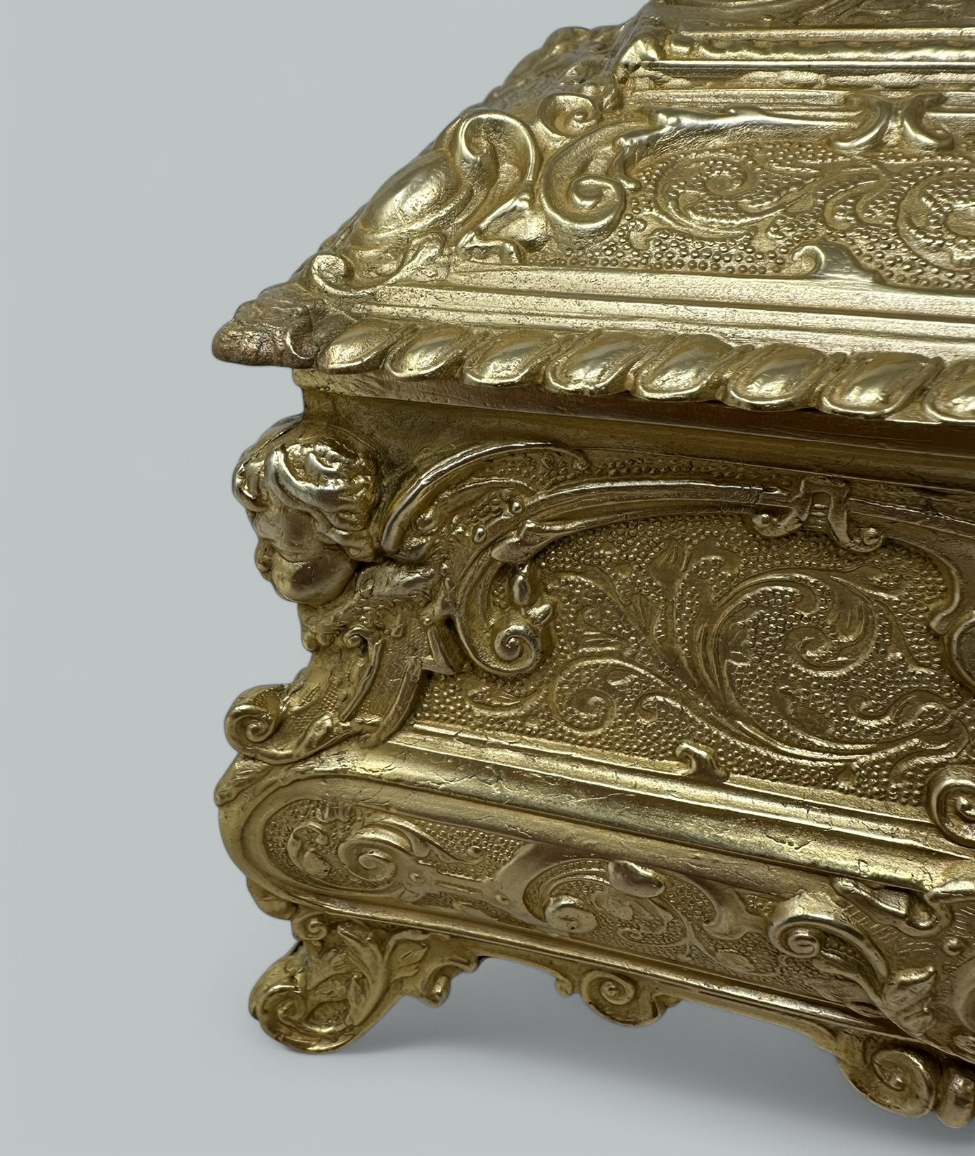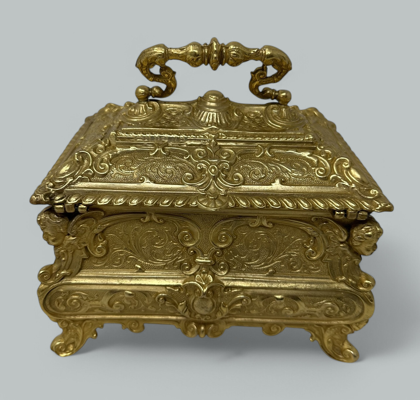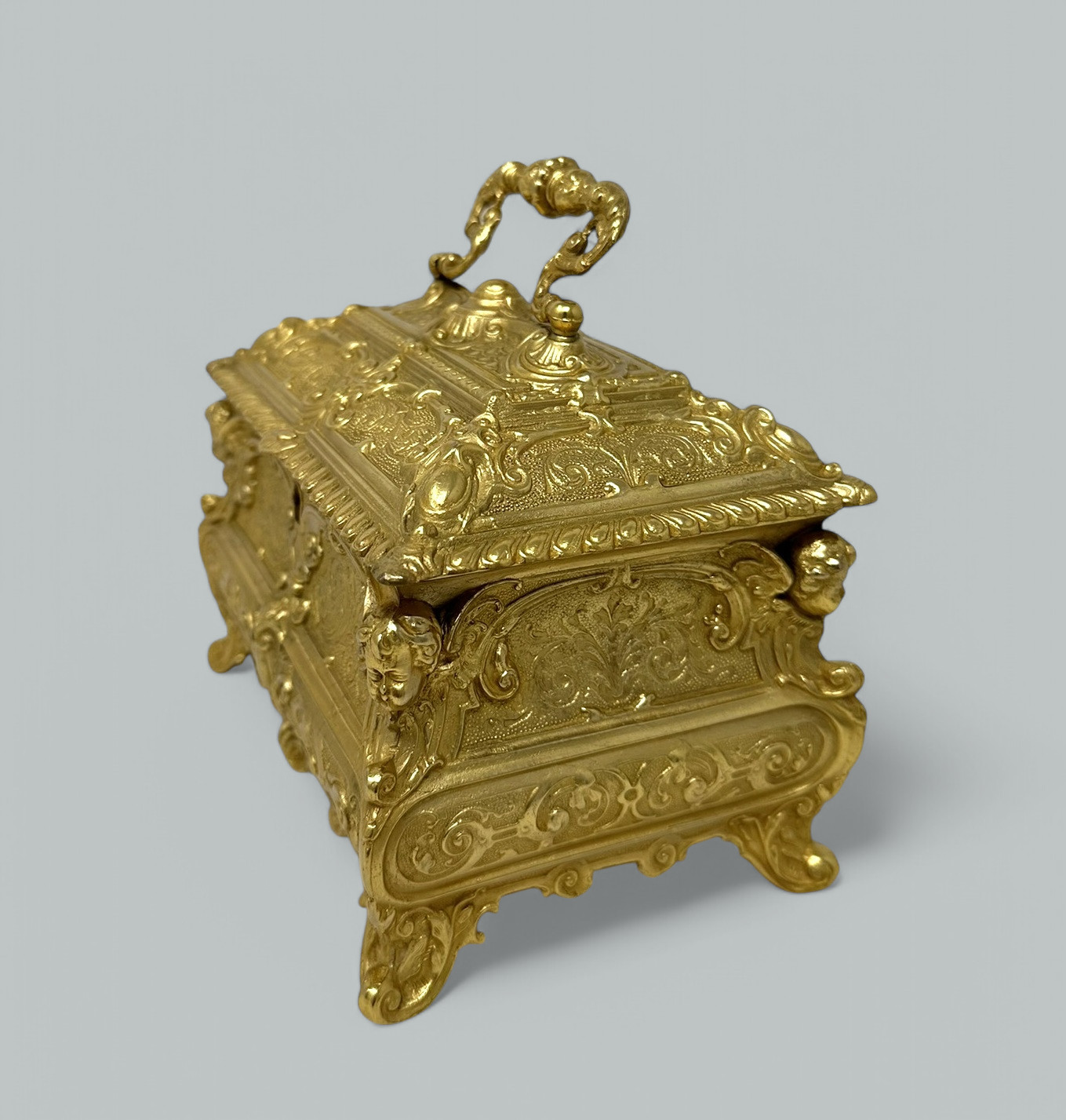 The slightly dome shaped hinged lid is lavishly decorated depicting scrolling details, each corner with oval cartouche detail, on all four sides with similar cast decoration and four winged cherubs at each corner. The casket is raised on its original very ornate acanthus leaf supports.