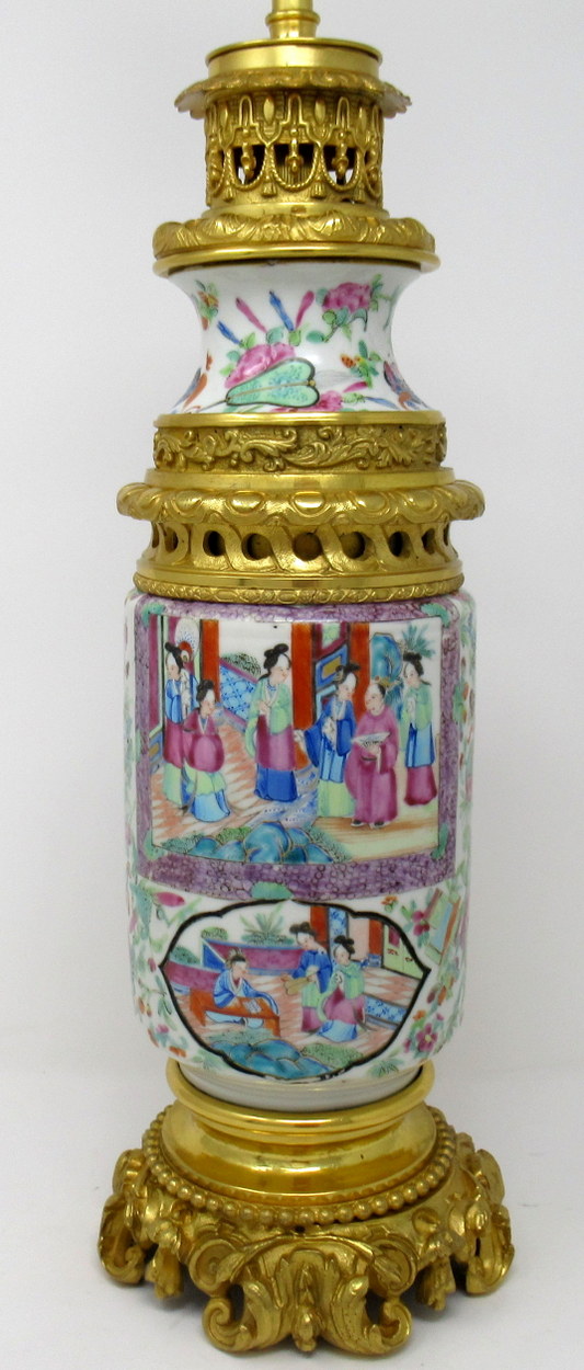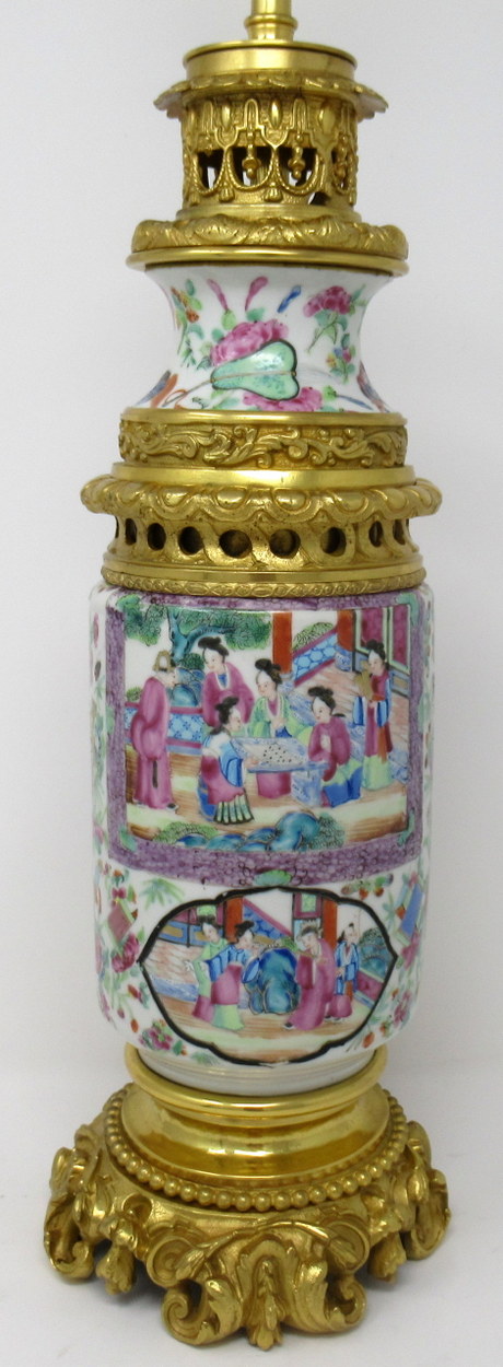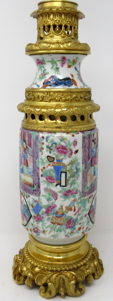 An Exceptionally Fine Example of a Cantonese Hand Decorated Chinese Export Porcelain Oil Lamp no converted to an Electric Table Lamp of good size proportions and outstanding quality, with its original highly ornate mounts and lavish cast footed base, mid Nineteenth Century.