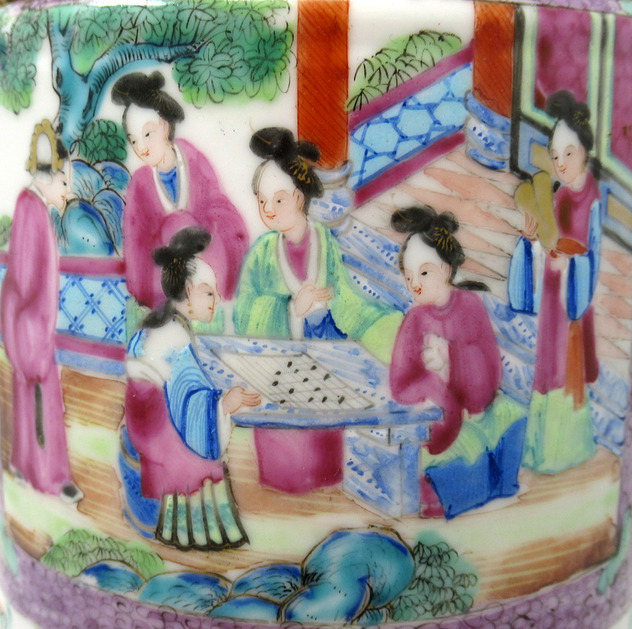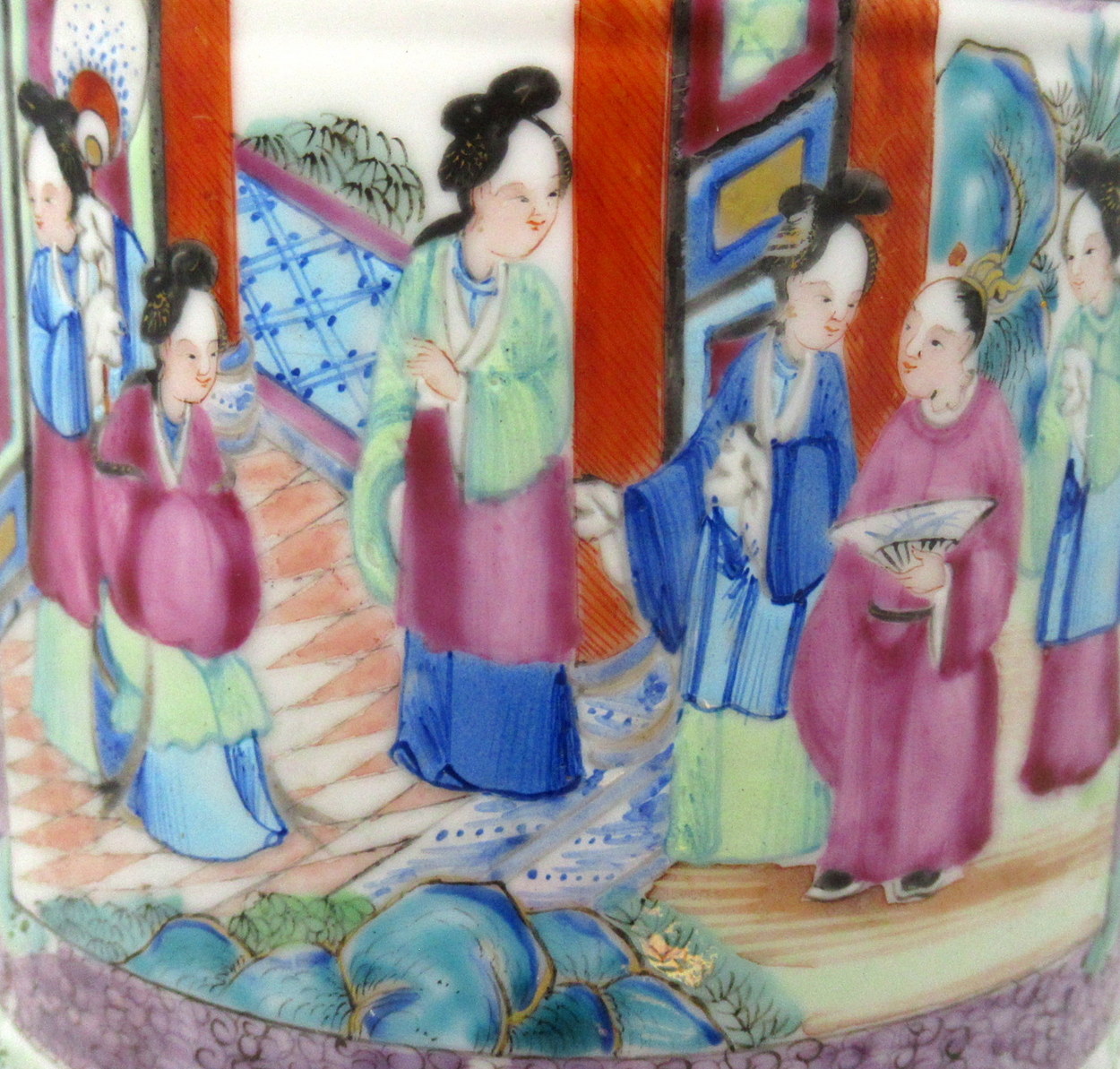 The main outer body of ovoid form, hand painted with brightly coloured enamels depicting panels of Chinese Figures within interior scenes.