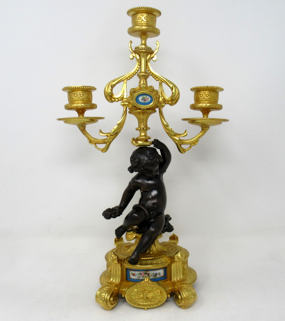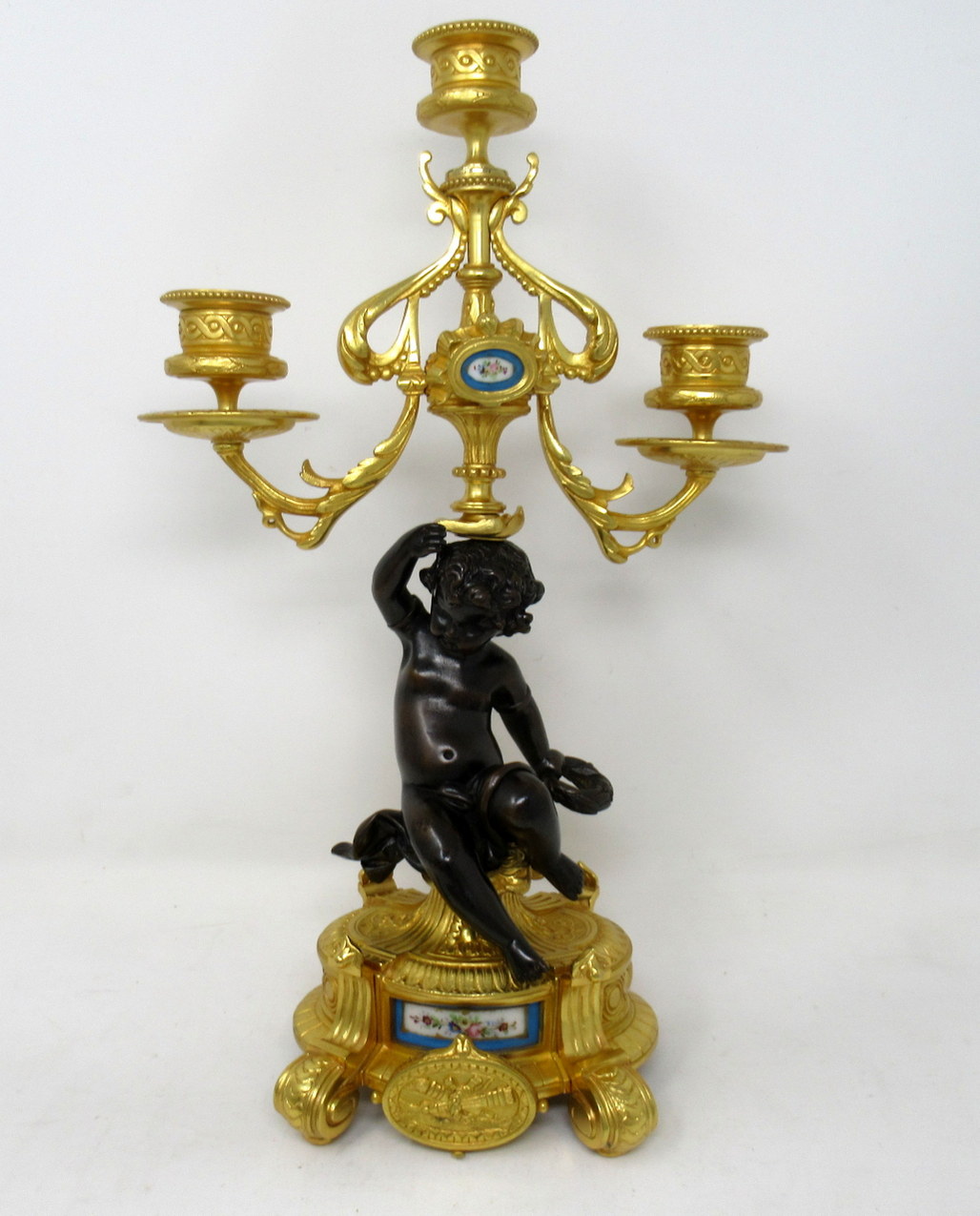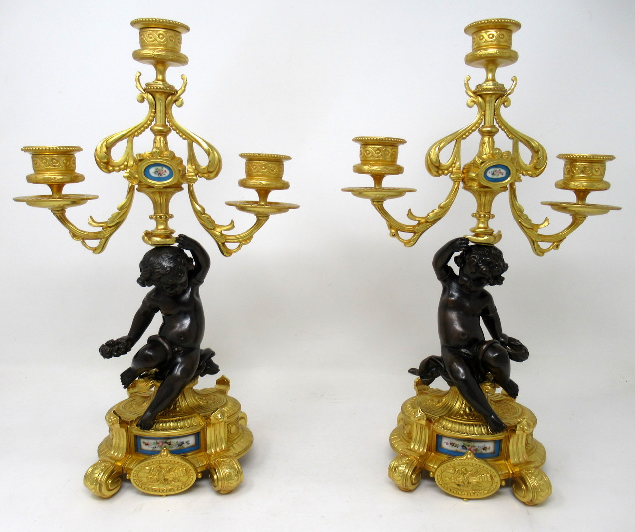 Each with a central seated patinated solid bronze Cherub holding a loft on one hand a three-branch candelabra and a naturalistic wreath on the other, ending on an ornate circular ormolu base with a hand decorated celeste blue porcelain inset and a superb oval central ormolu plaque depicting a pair of flame torches, supported on four scrolling feet.