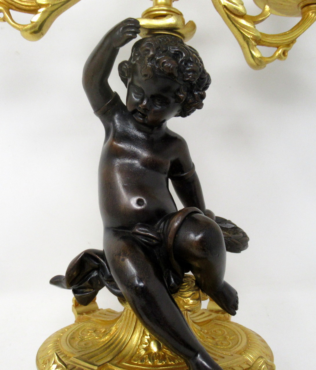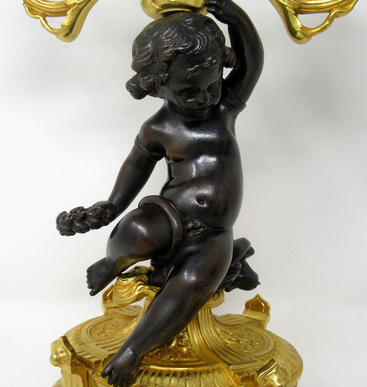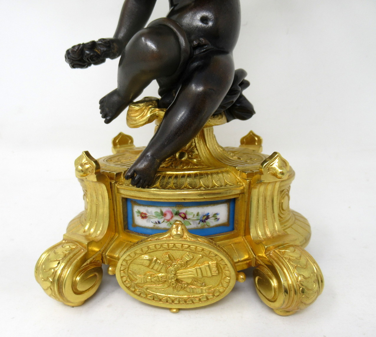 Each with a central seated patinated solid bronze Cherub holding a loft on one hand a three-branch candelabra and a naturalistic wreath on the other, ending on an ornate circular ormolu base with a hand decorated celeste blue porcelain inset and a superb oval central ormolu plaque depicting a pair of flame torches, supported on four scrolling feet.