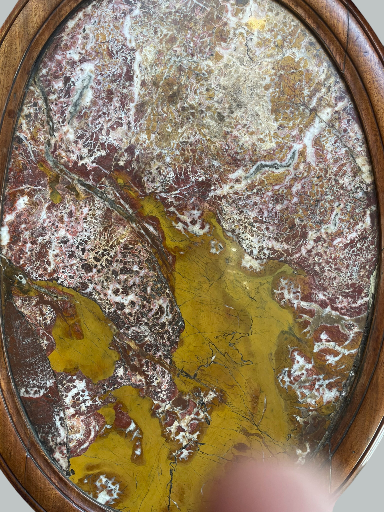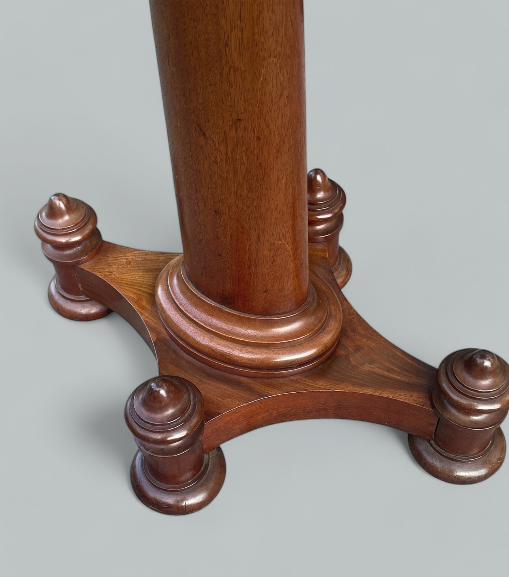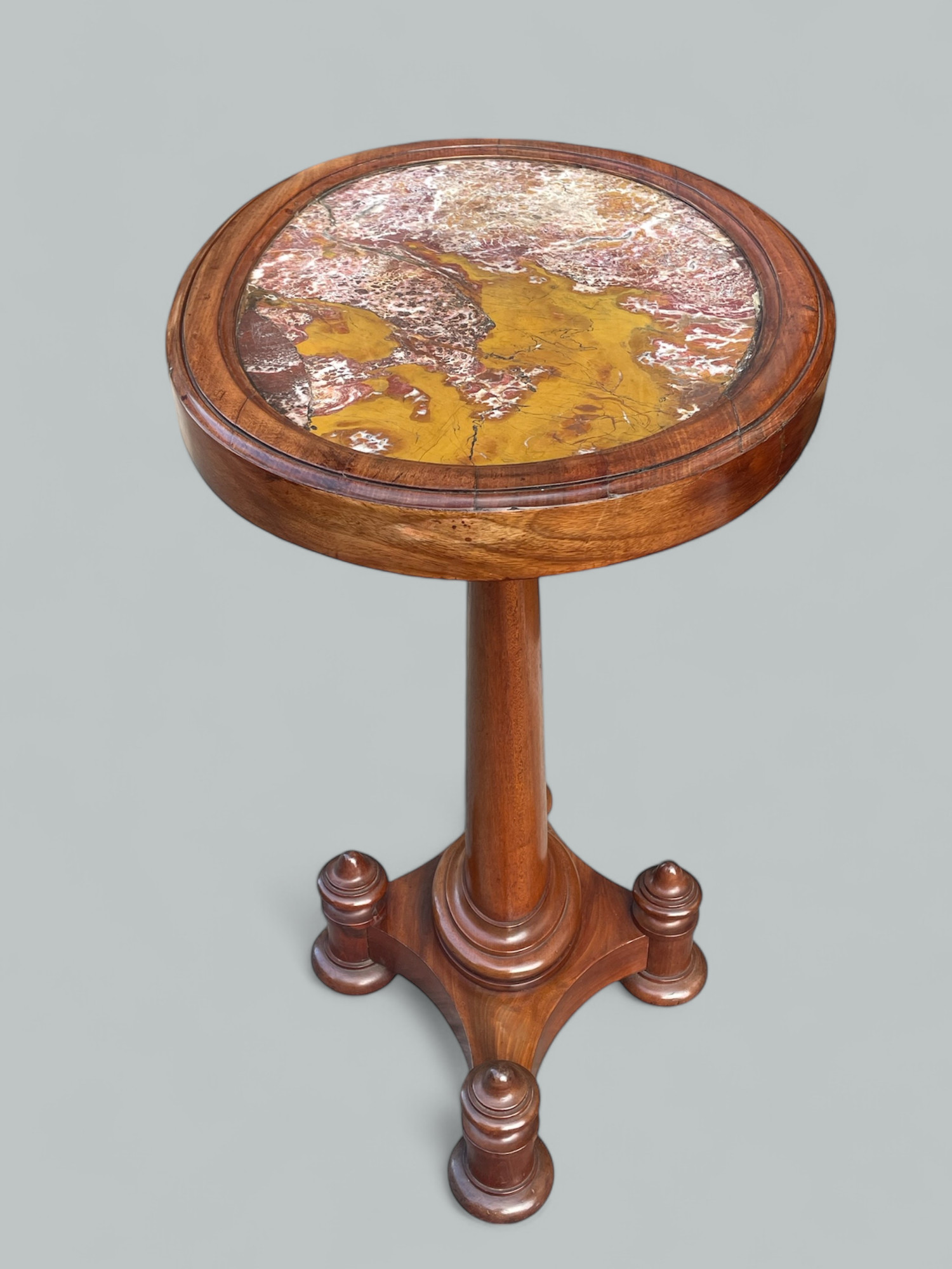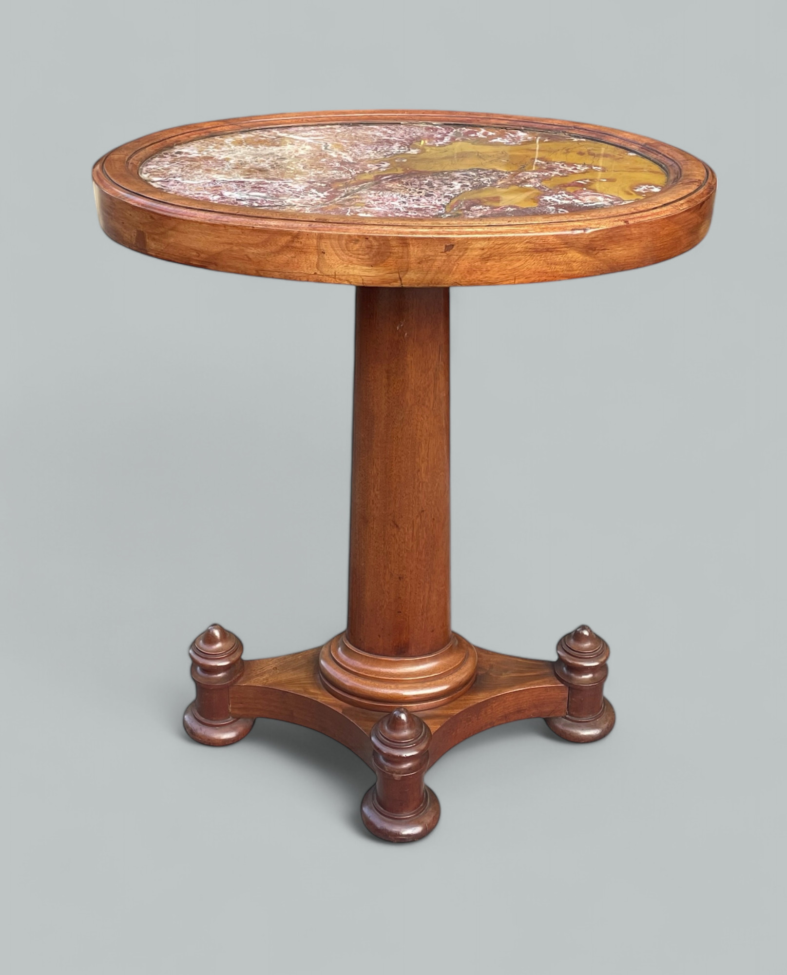 The encased red veined Marble top inside a mahogany turned frame above an oval solid spreading support column ending on a quarter formed base with turned bun supports.