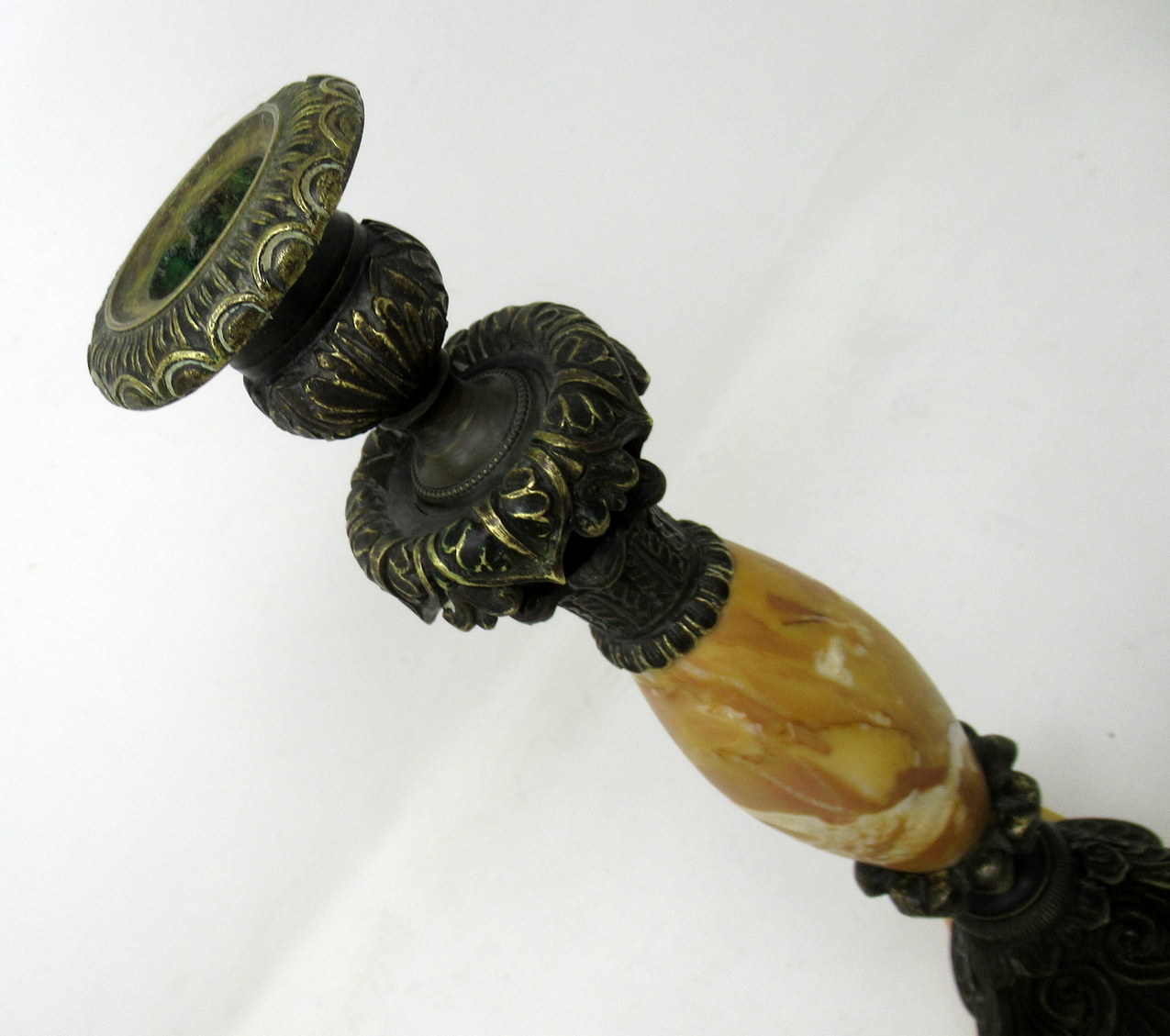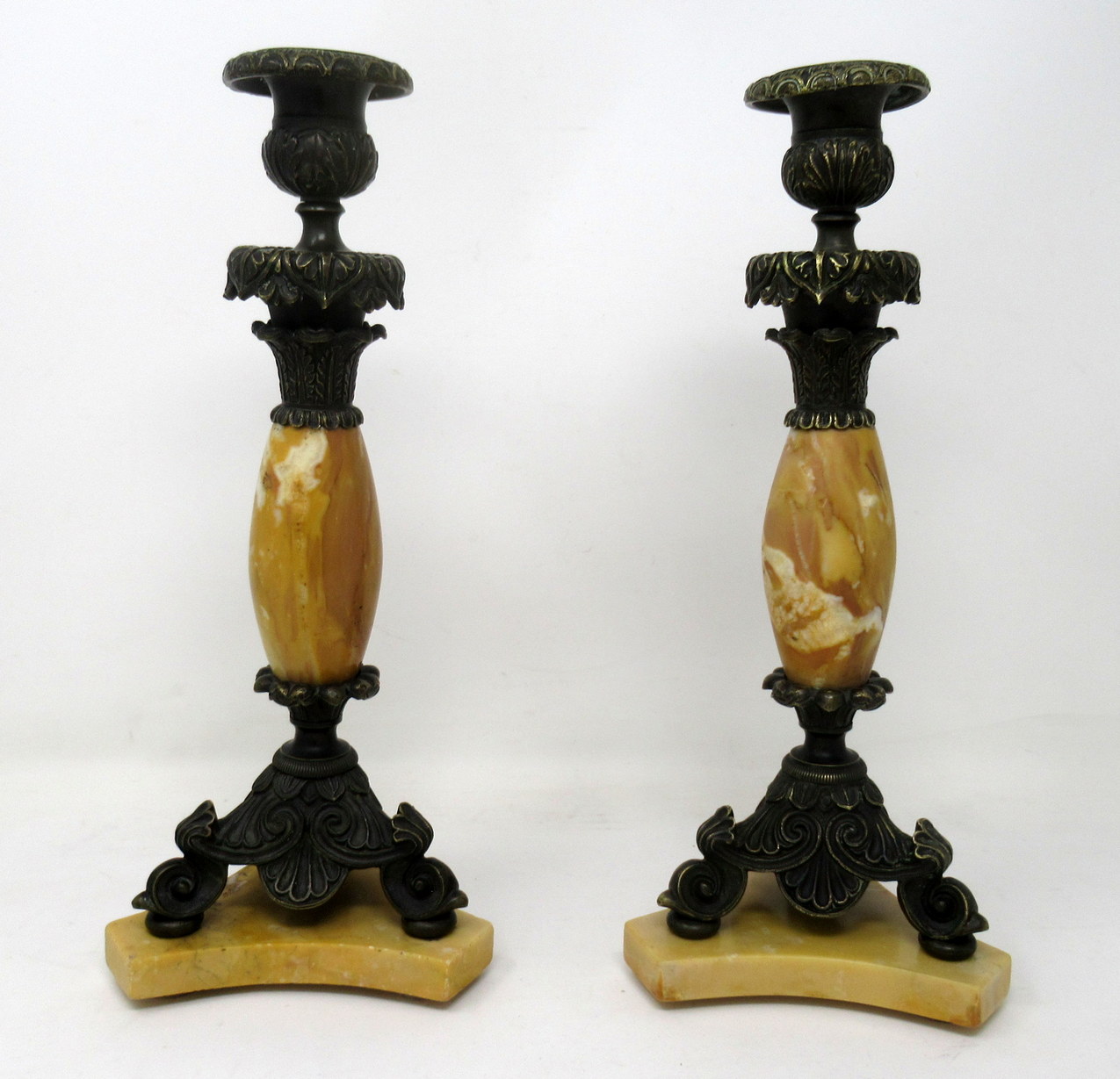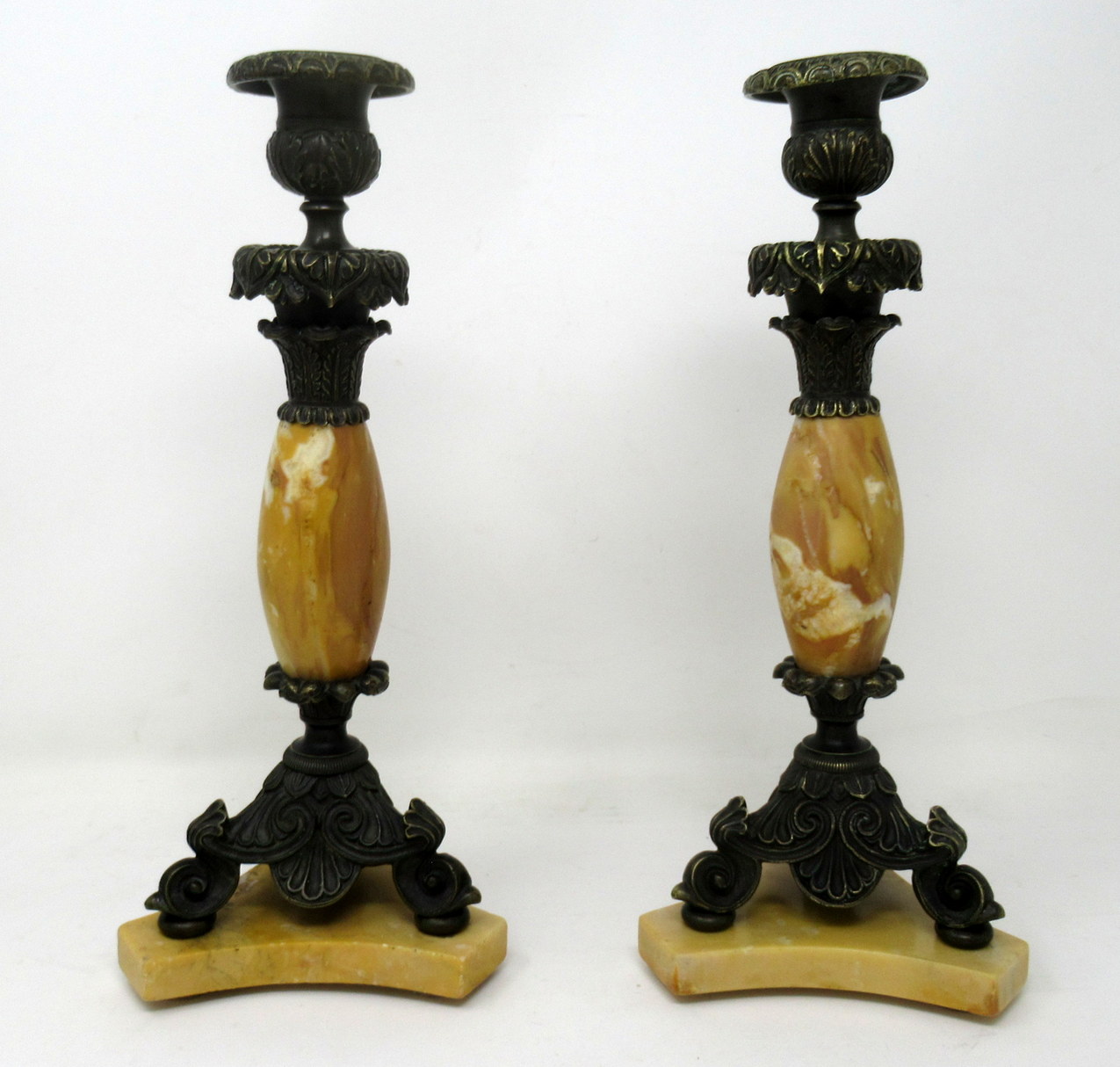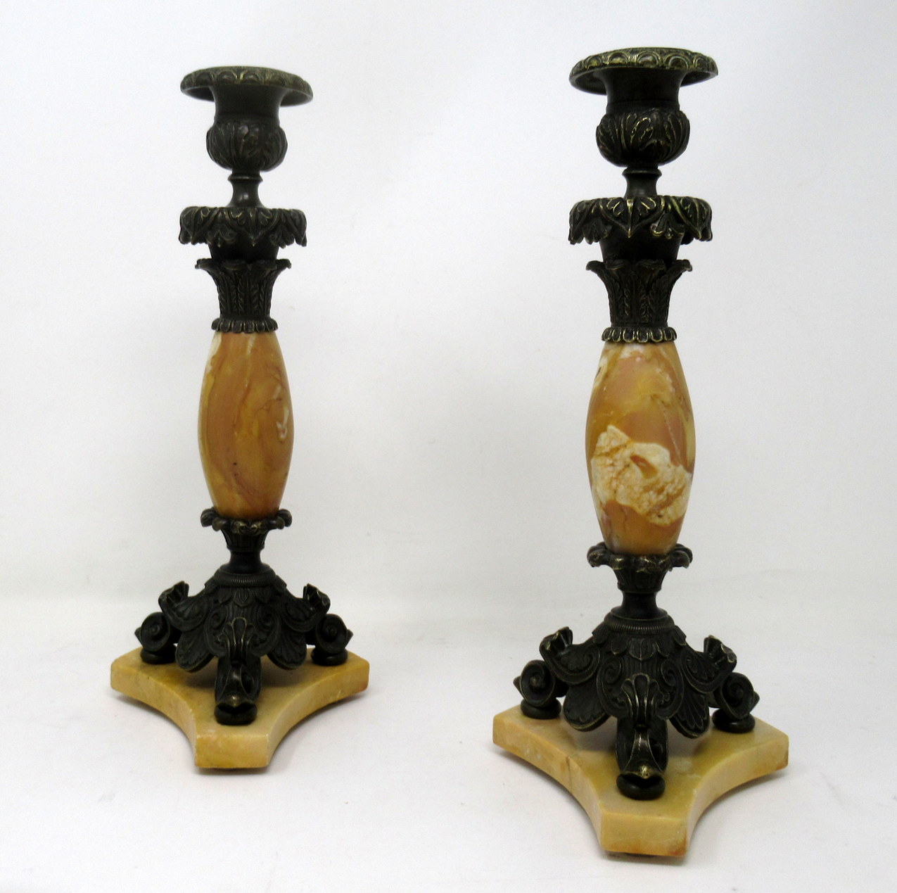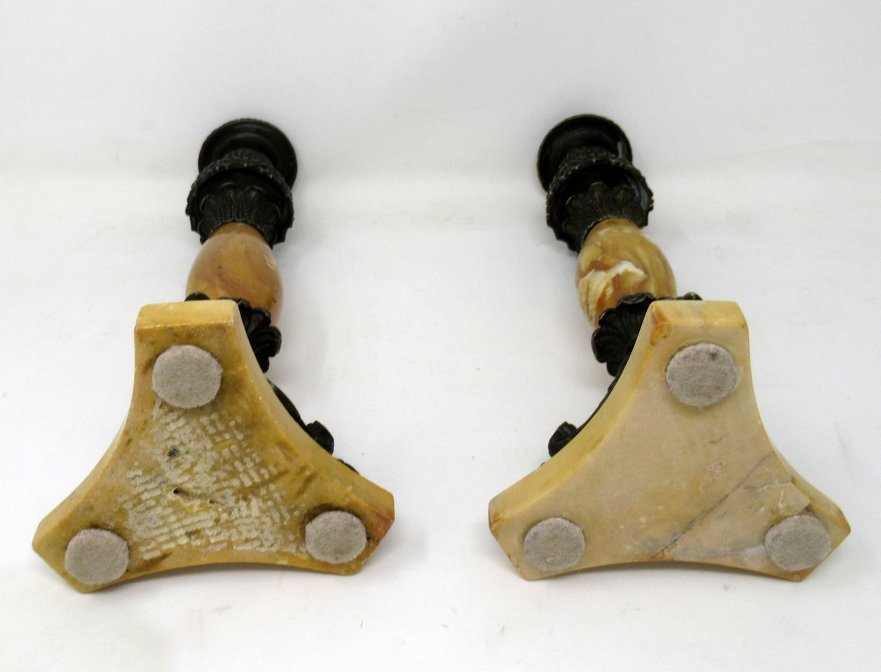 209. Antique Pair French Sienna Marble Grand Tour Bronze Candelabra Candlesticks 19Ct