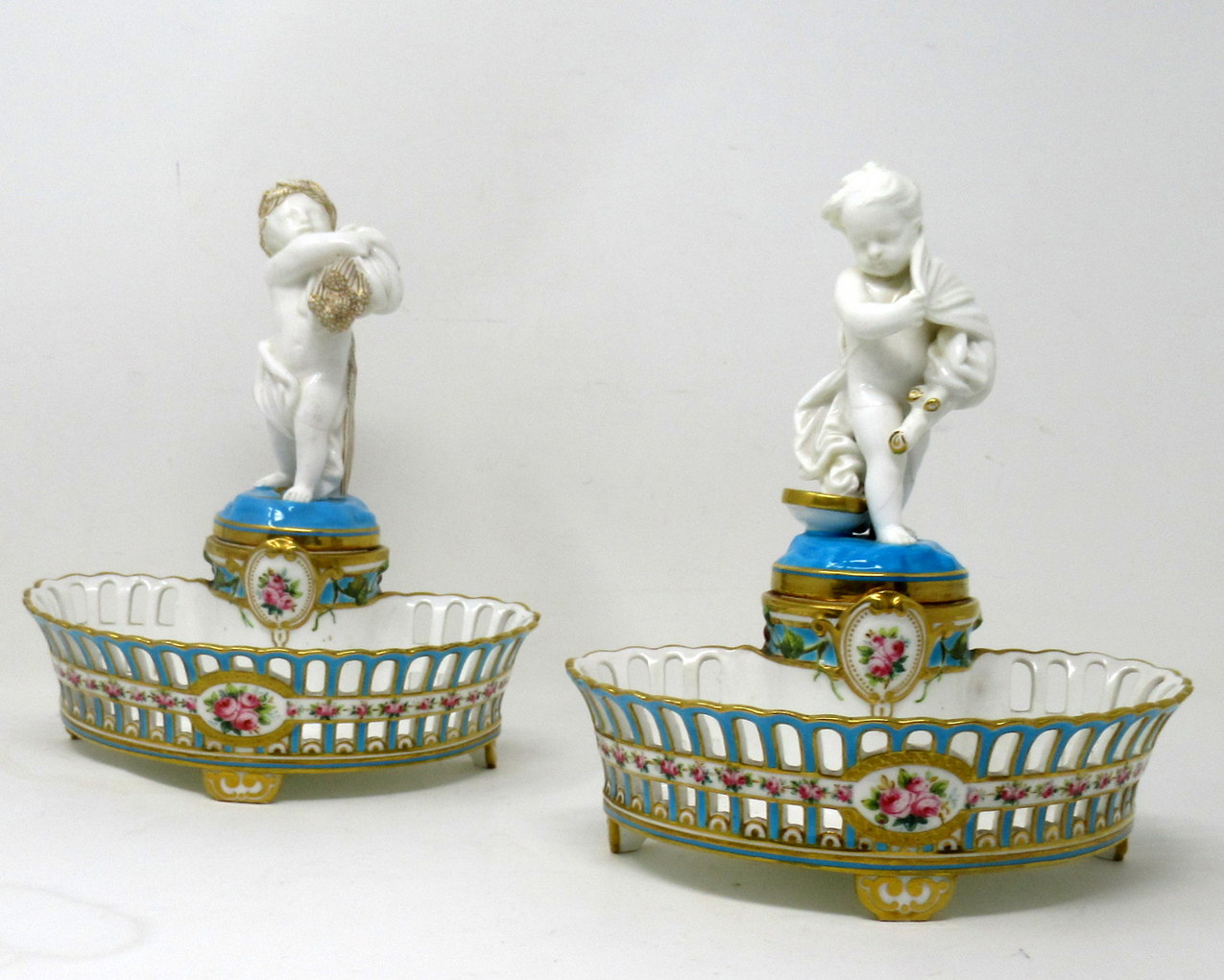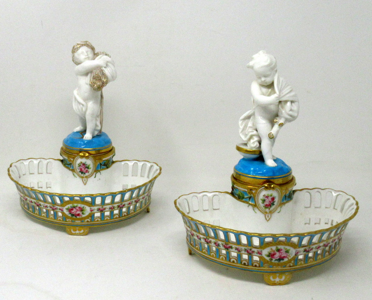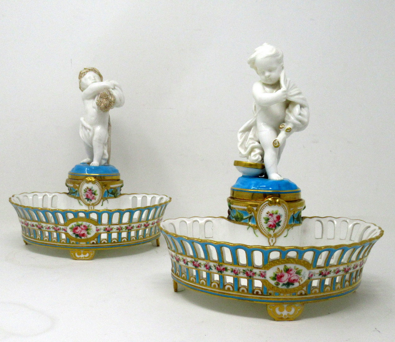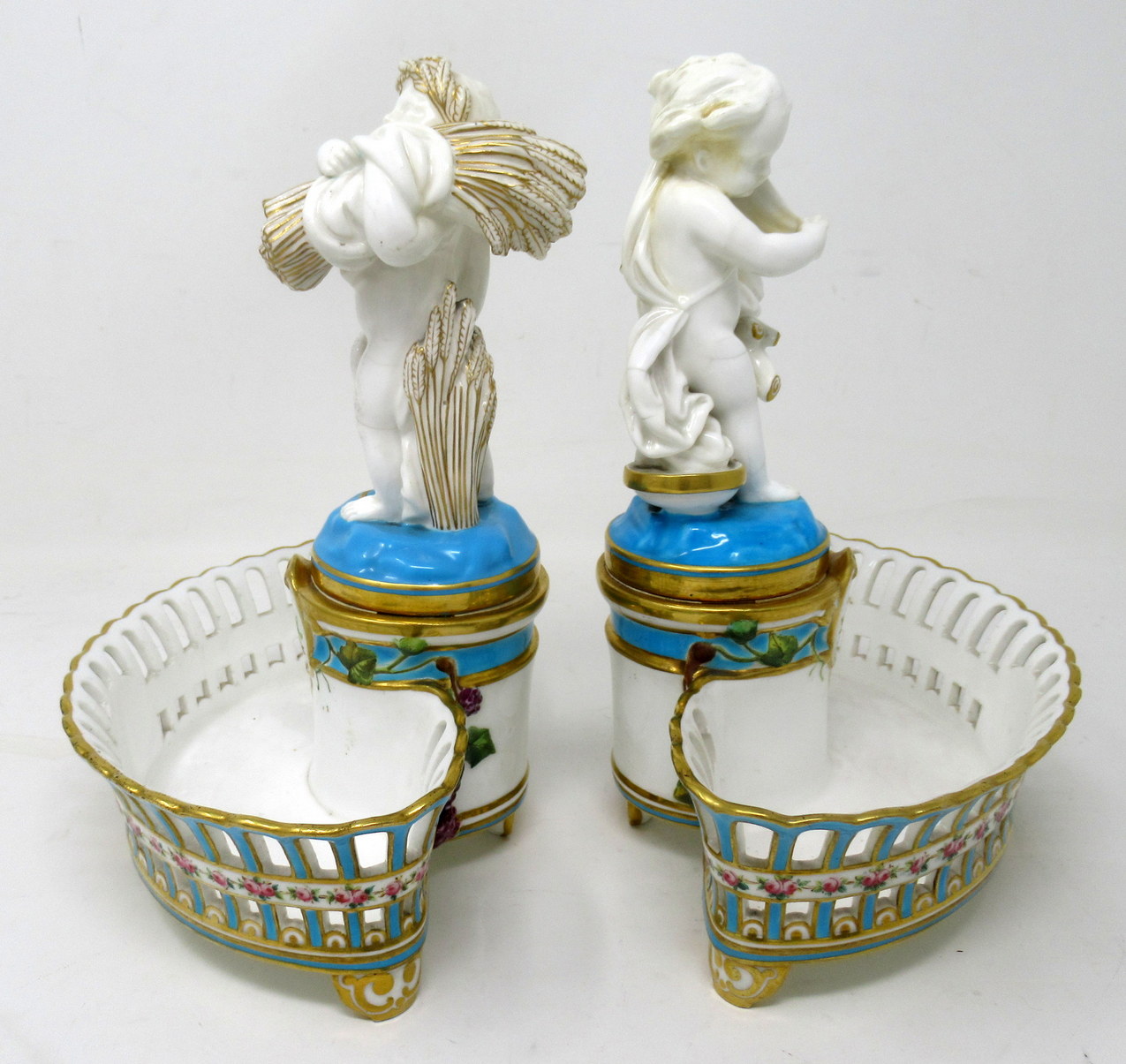 Stunning Example of a pair of English Minton Porcelain Centerpieces or Flower Vases, each modelled as a standing cherub one harvesting wheat, both ending with stunning pierced oval centerpieces on footed supports. Circa third quarter of the Nineteenth Century.