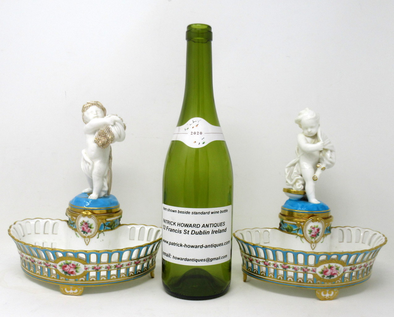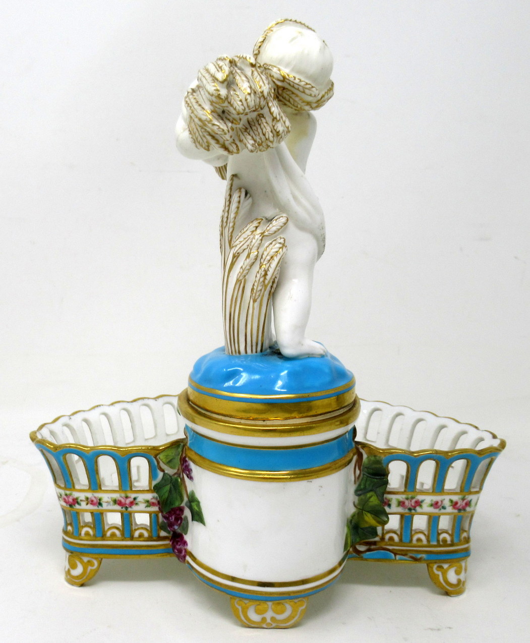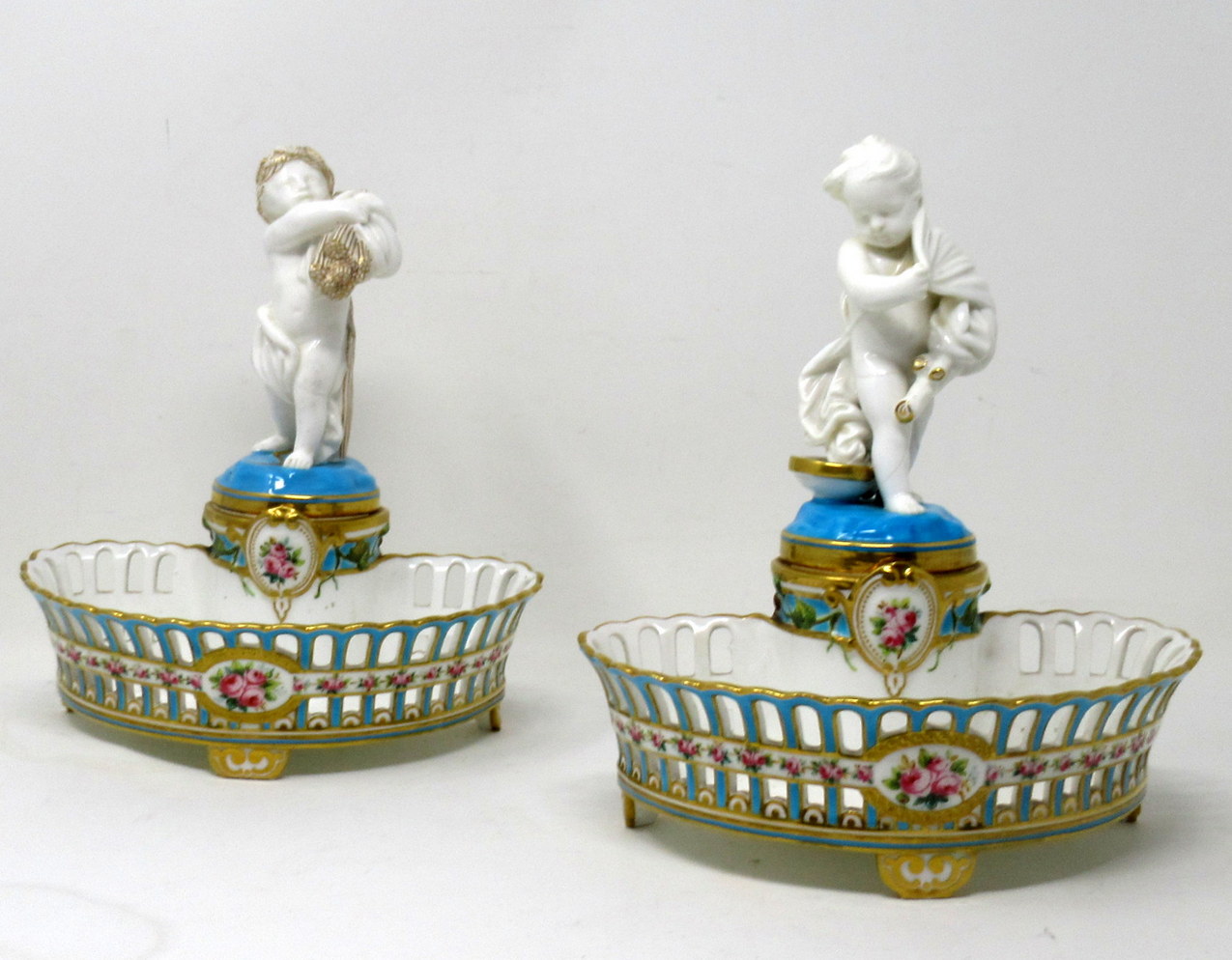 Stunning Example of a pair of English Minton Porcelain Centerpieces or Flower Vases, each modelled as a standing cherub one harvesting wheat, both ending with stunning pierced oval centerpieces on footed supports. Circa third quarter of the Nineteenth Century.