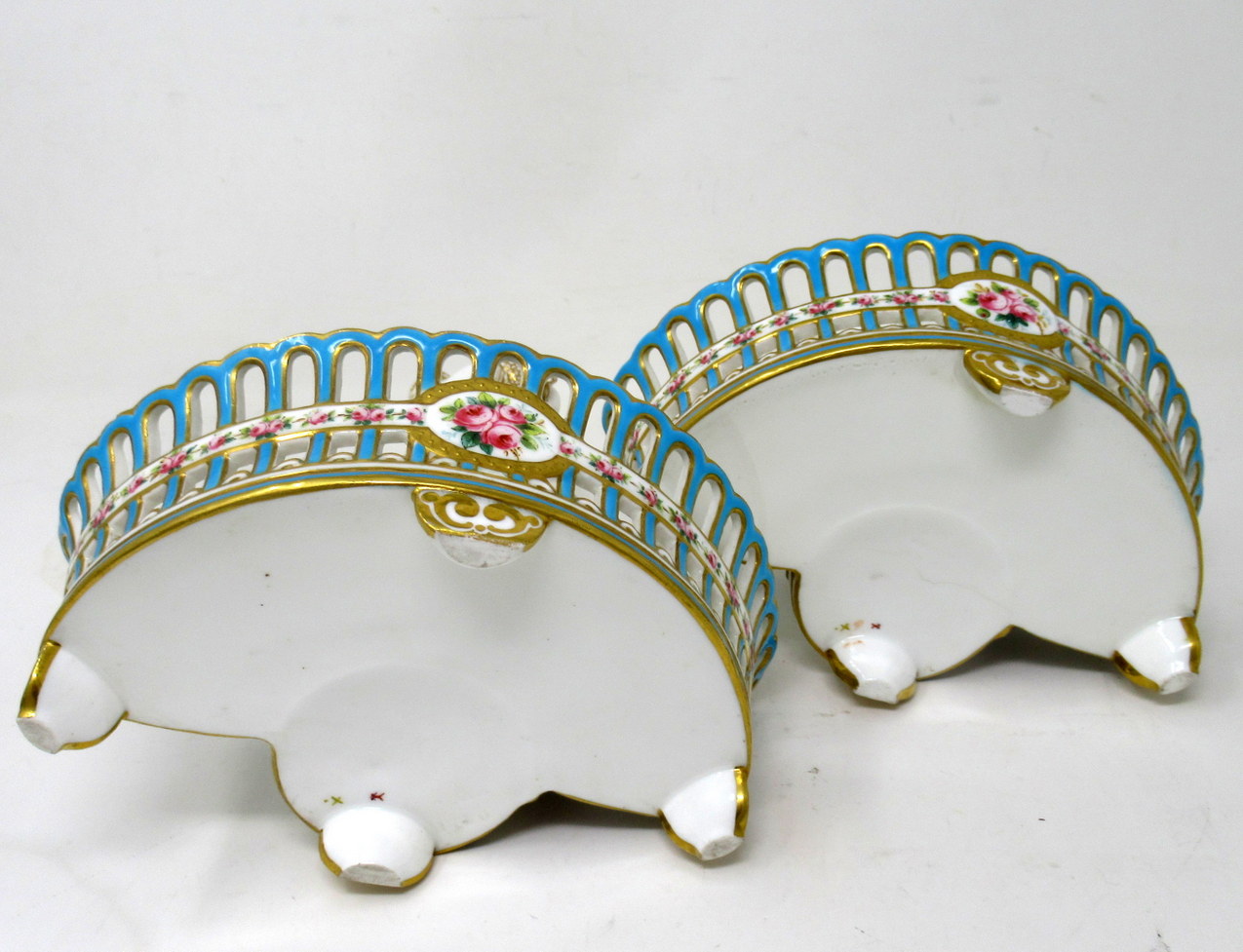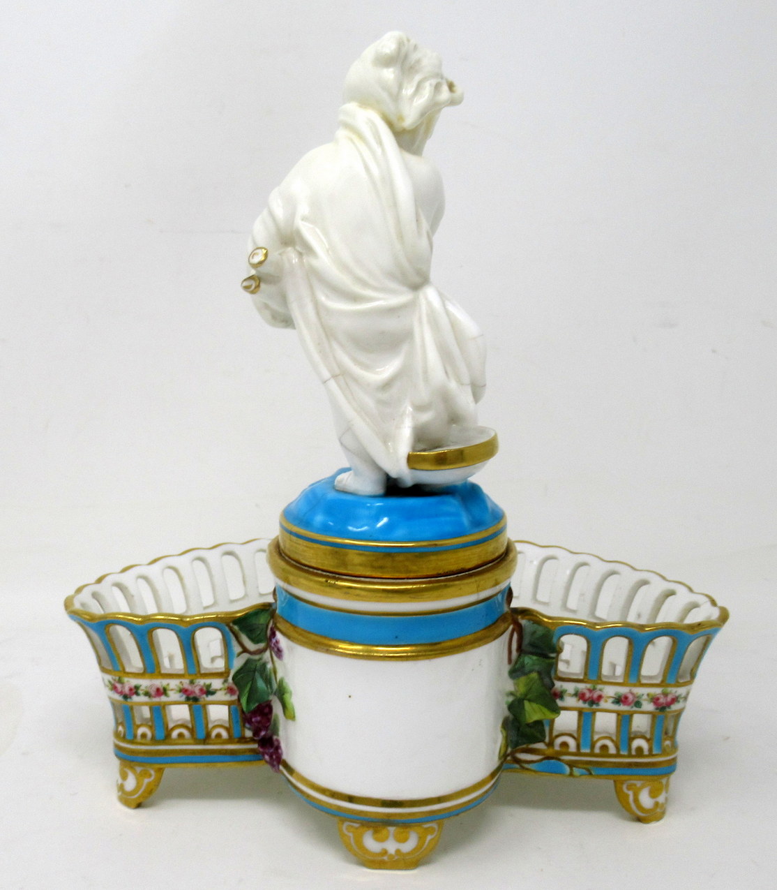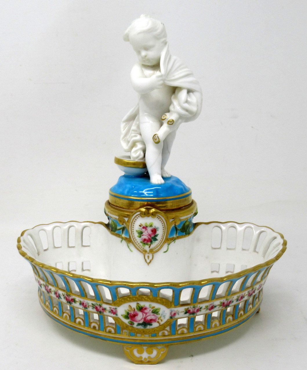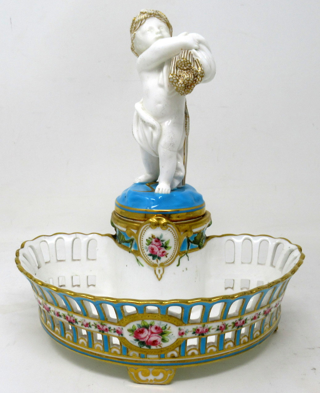 Stunning Example of a pair of English Minton Porcelain Centerpieces or Flower Vases, each modelled as a standing cherub one harvesting wheat, both ending with stunning pierced oval centerpieces on footed supports. Circa third quarter of the Nineteenth Century.
