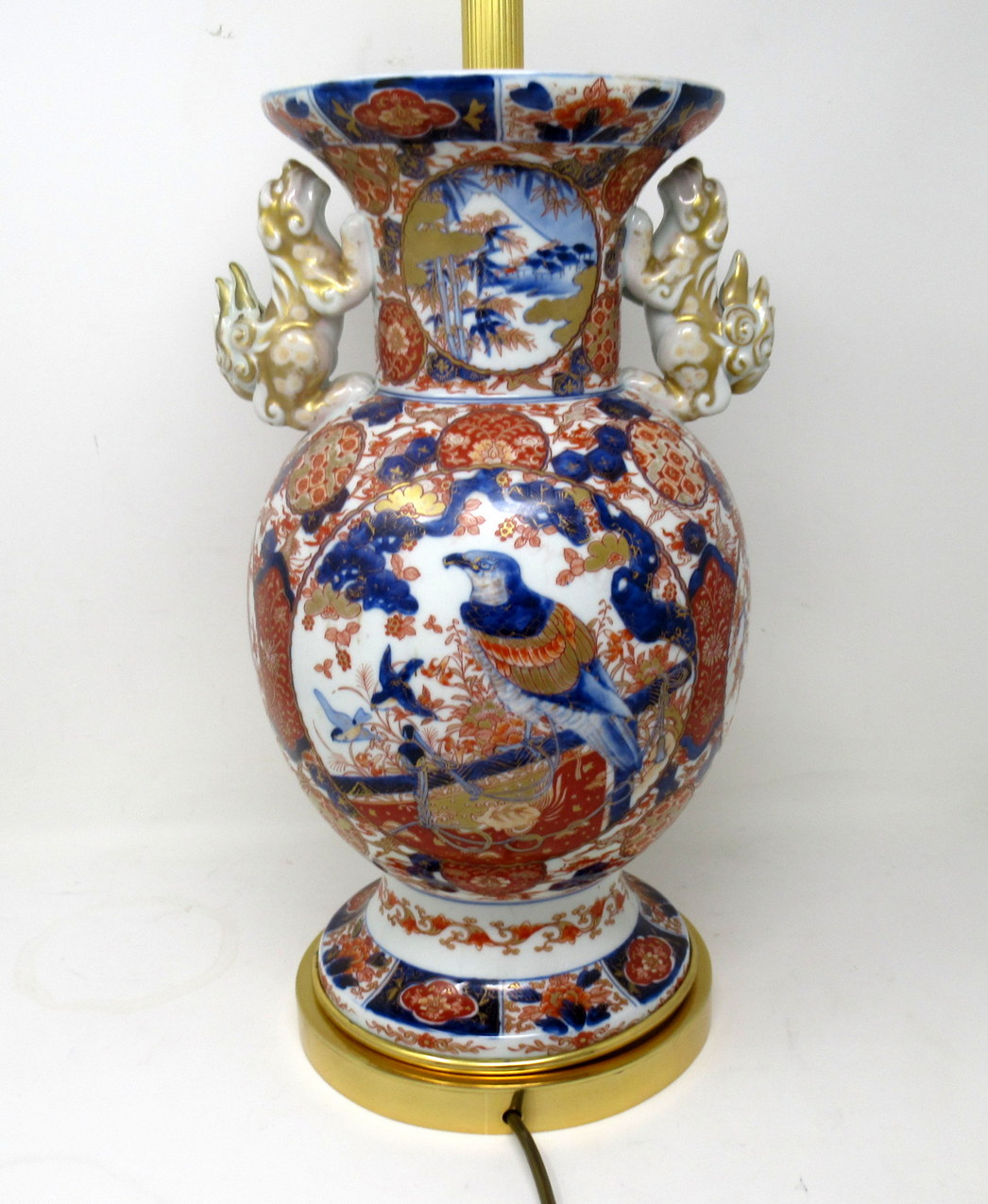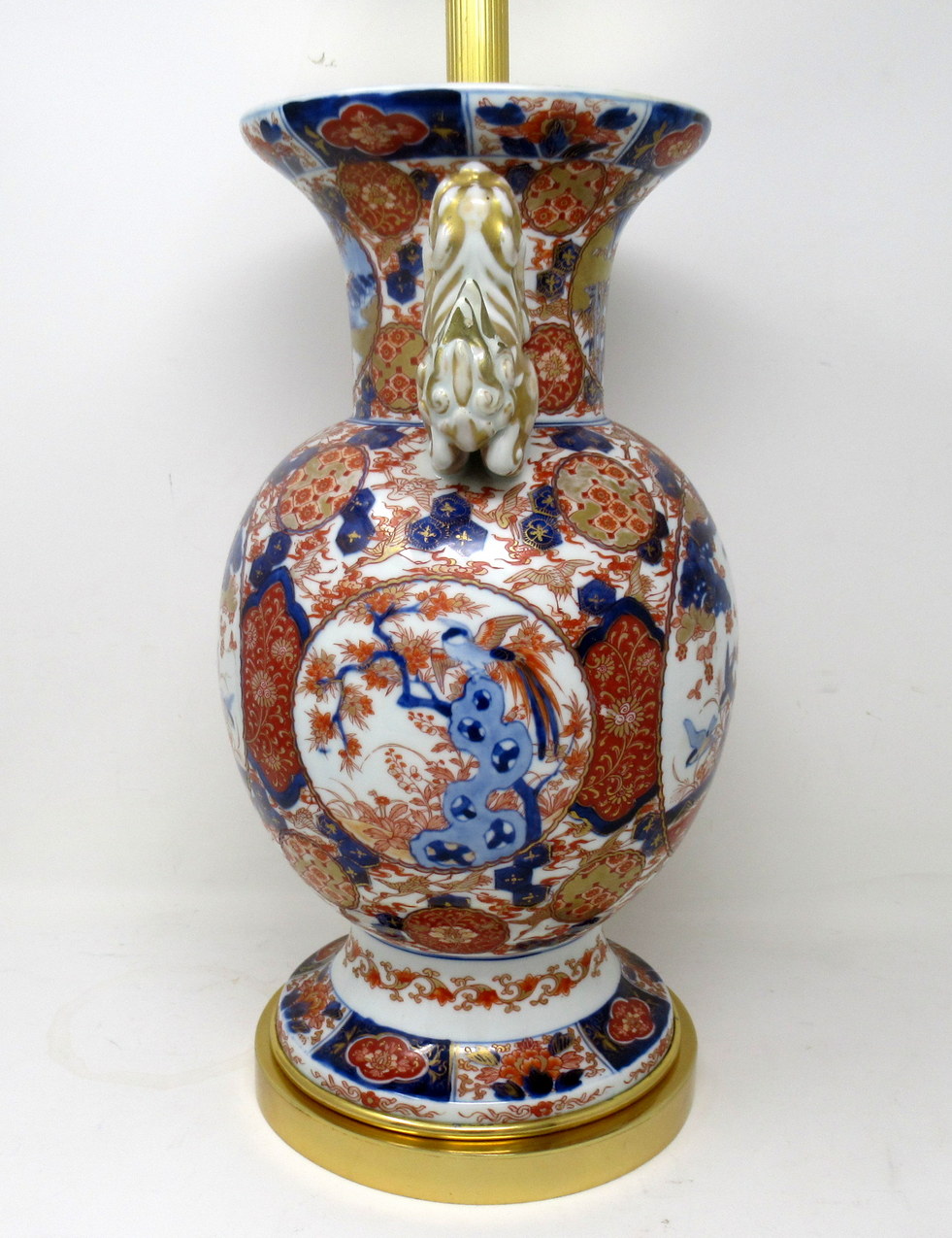 Stunning Single Traditional Japanese Imari Bulbous Form Porcelain Vase of quite large proportions, the twin handles modelled as Foo Dogs, now converted to an electric Table Lamp, complete with ormolu heavy gauge stepped circular base with attractive later ormolu circular mount. Second half of the Nineteenth Century.