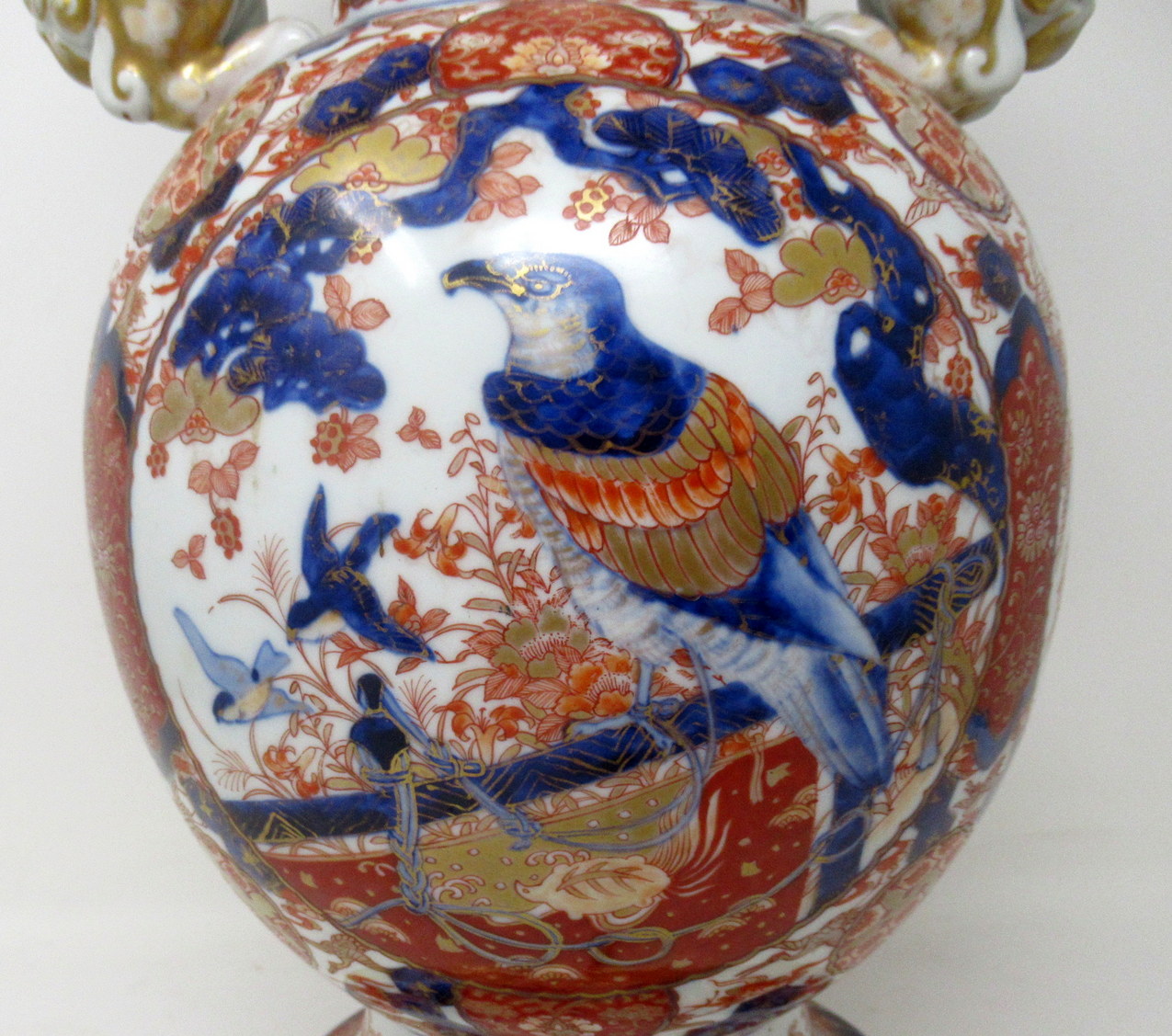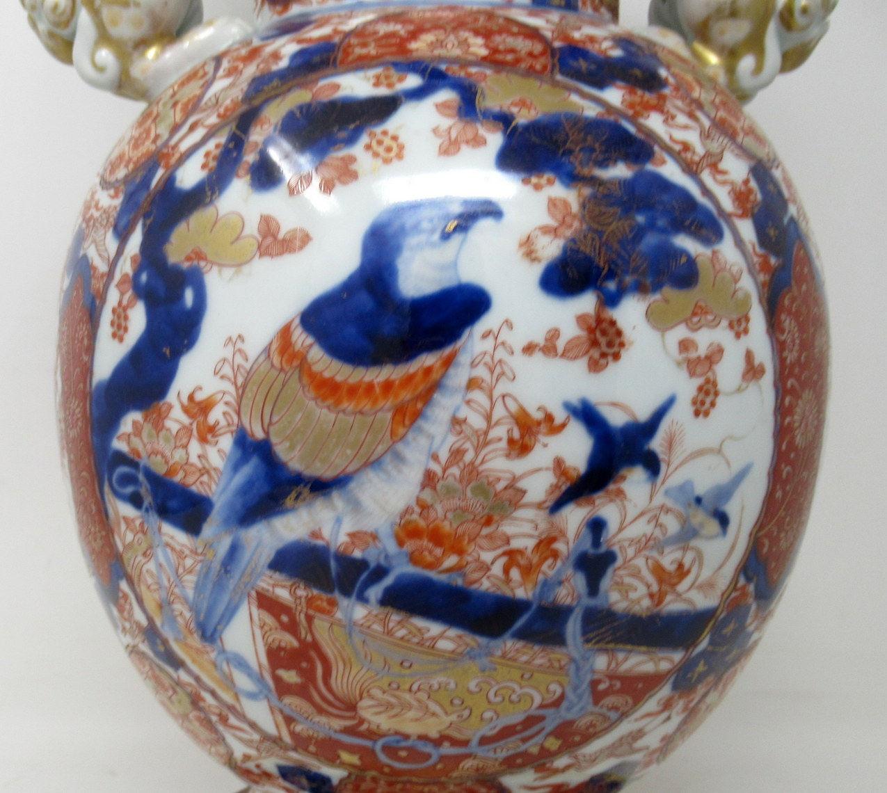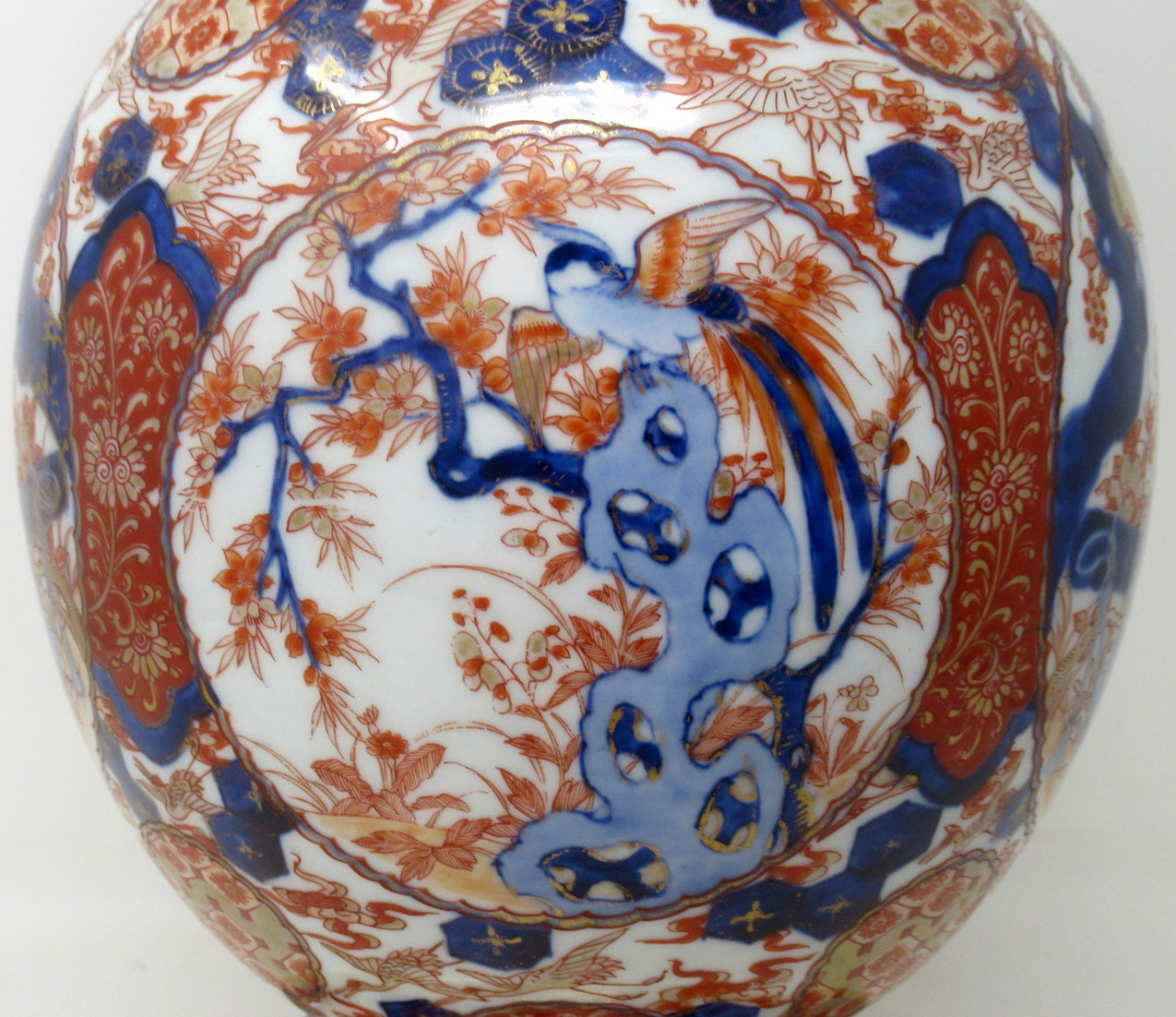 The main outer porcelain wide-neck body with stylish circular rim and plain glazed surface detail and all over typical decorative Imari palette in colours of iron red and cobalt blue tones on an off-white ground. The four circular reserves depicting exotic perched and flying birds