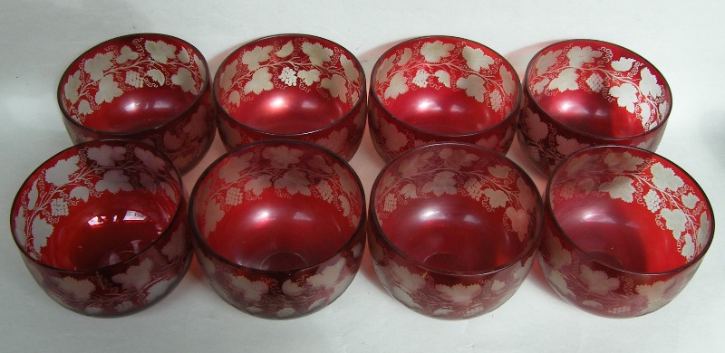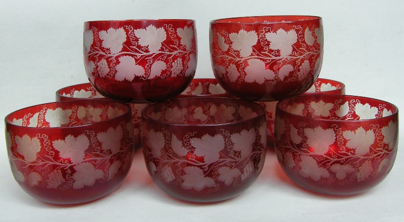 246. Set Eight Bohemian Ruby Etched Finger Bowls 19th Ct