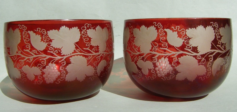 A Very Fine Quality Early Bohemian Clear and Dark Ruby Hand Etched Crystal Circular Finger Bowls, late Nineteenth Century, each with lavish leaf and vine decoration.