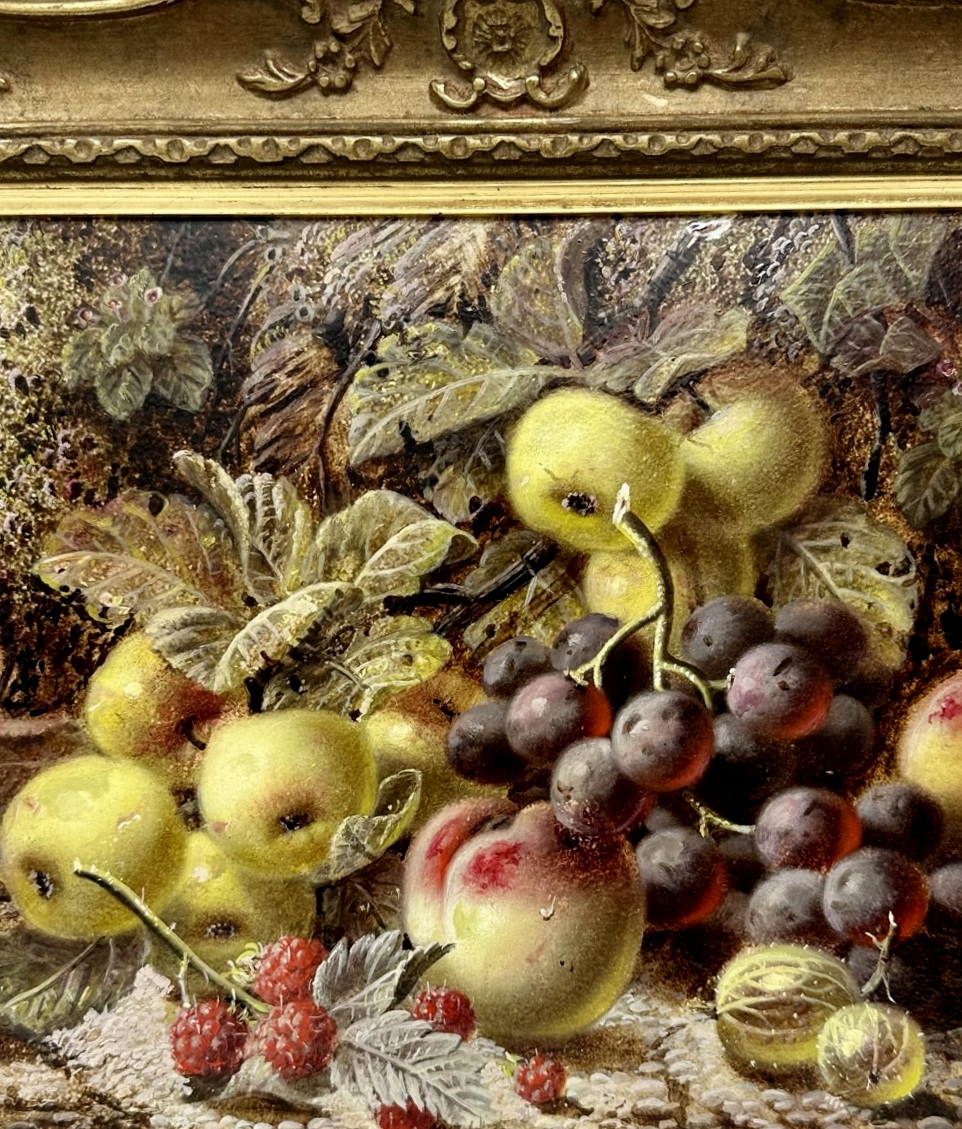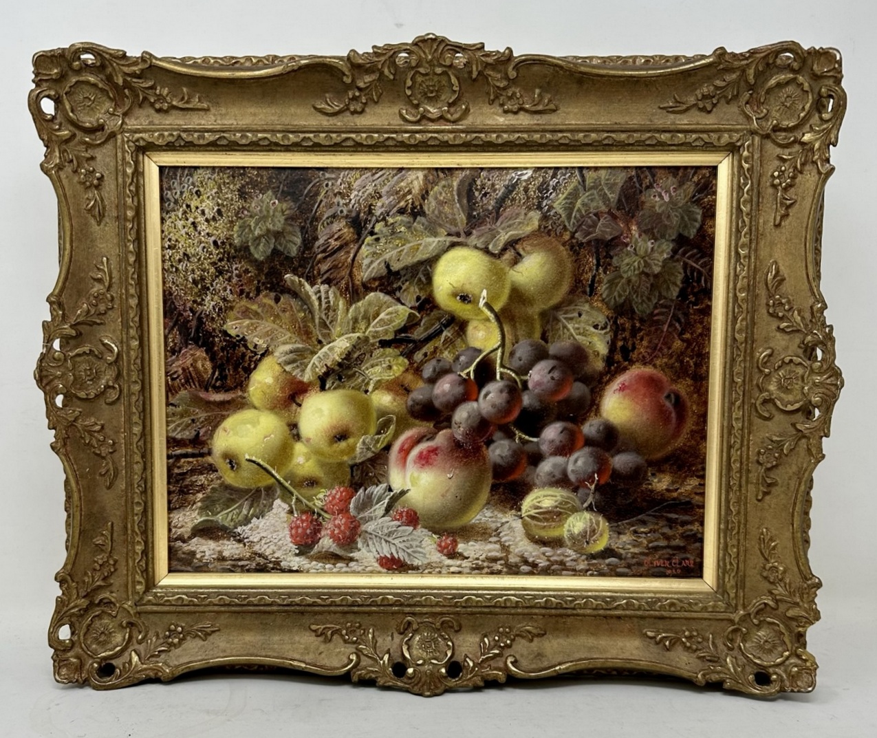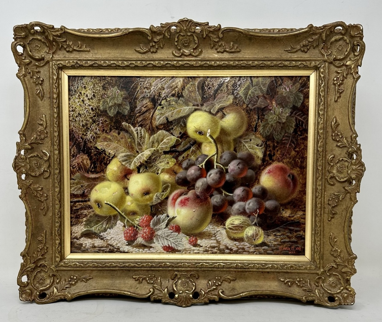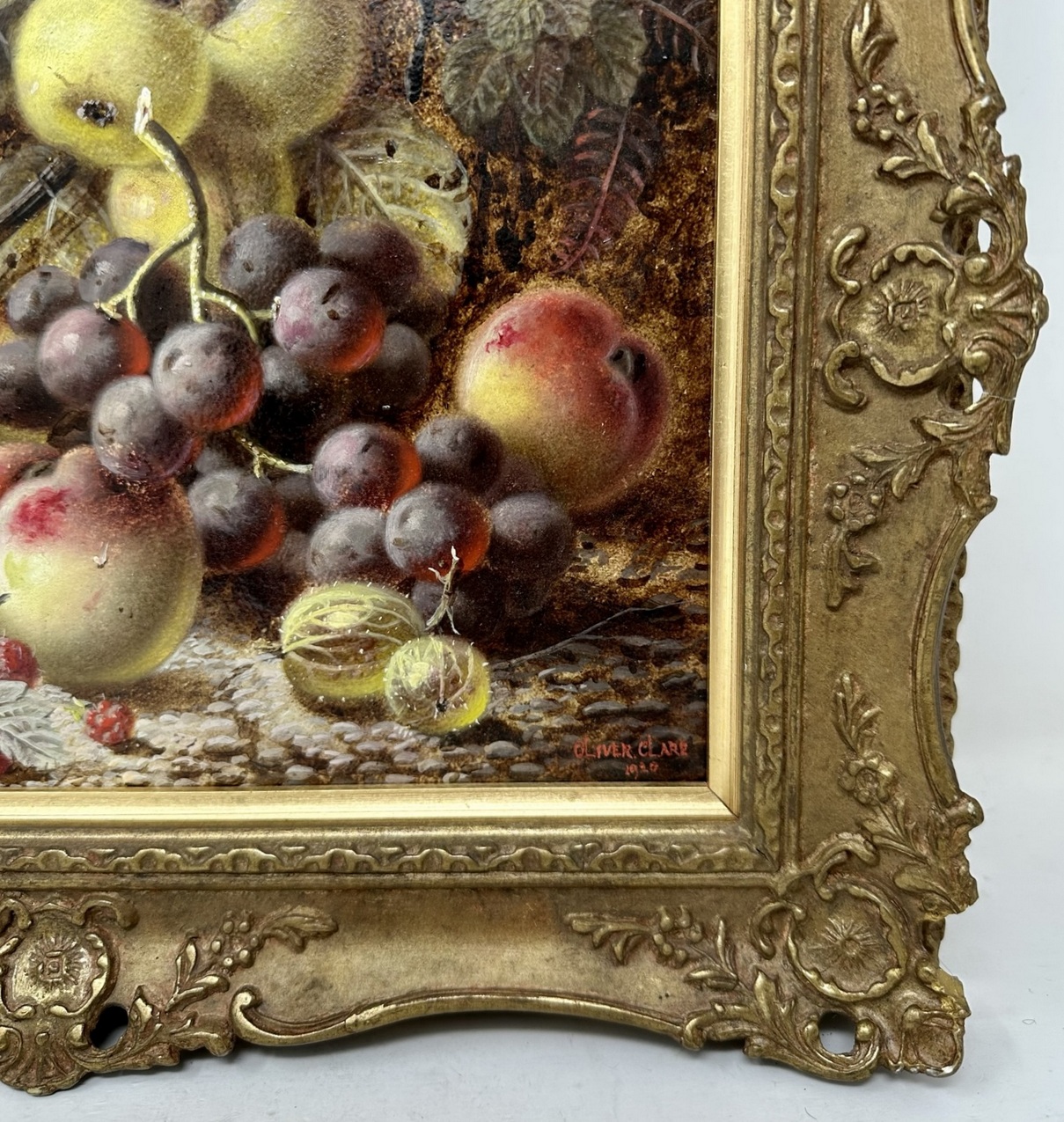An exceptionally fine quality example of a framed Still Life of fruits Oil Painting on Artists board by well documented English Artist Oliver Clare, first quarter of the Twentieth Century. Complete with its original good giltwood frame, signed lower right Oliver Clare and dated 1920