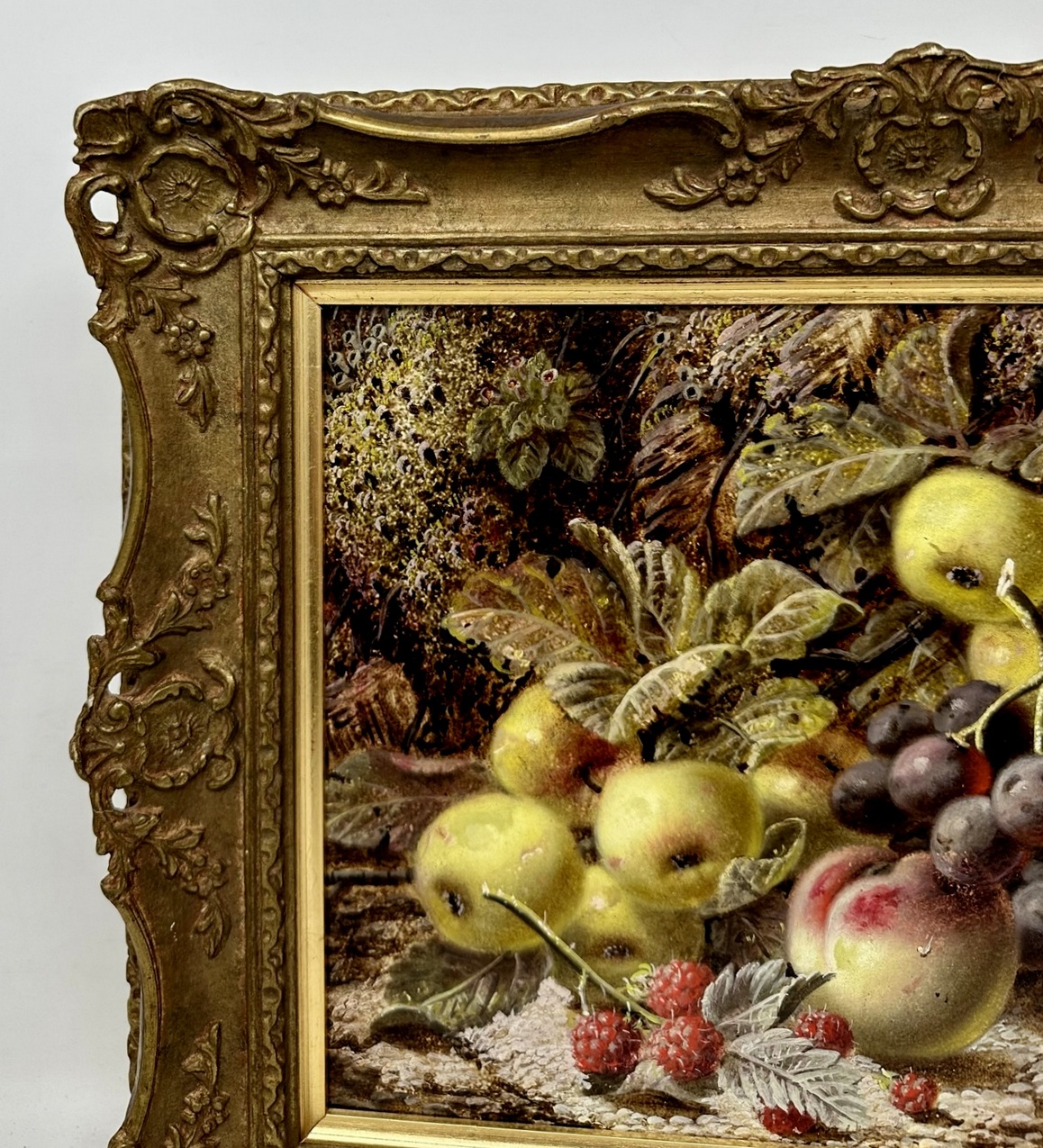 Typical Clare views depicting Still Life of fruits to include apples, peaches, strawberries and black grapes all within foliage on a mossy ground.