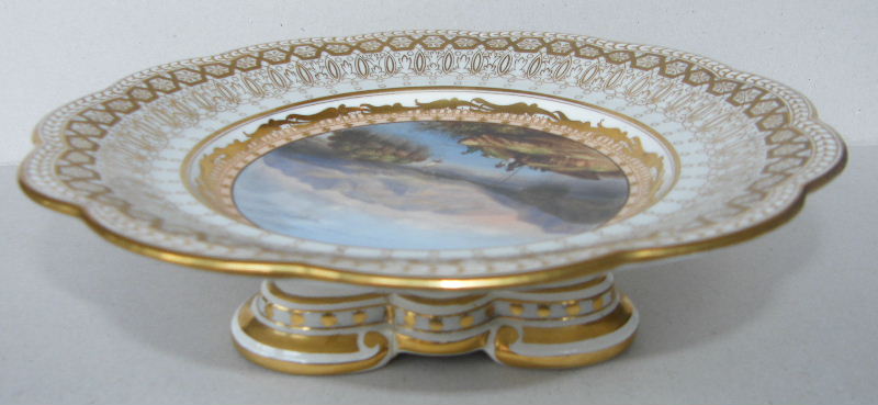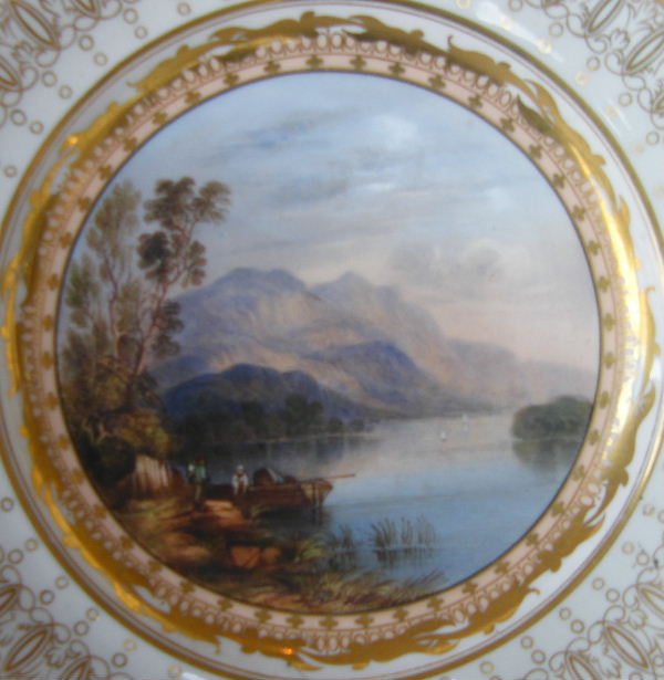 Rare Pair of Hand decorated Cabinet Porcelain Plates raised on ornate supports, each central reserve with fine quality hand painting depicting a view of the Irish Killarney Lakes with fishermen and their fishing boats. Mid Nineteenth Century.