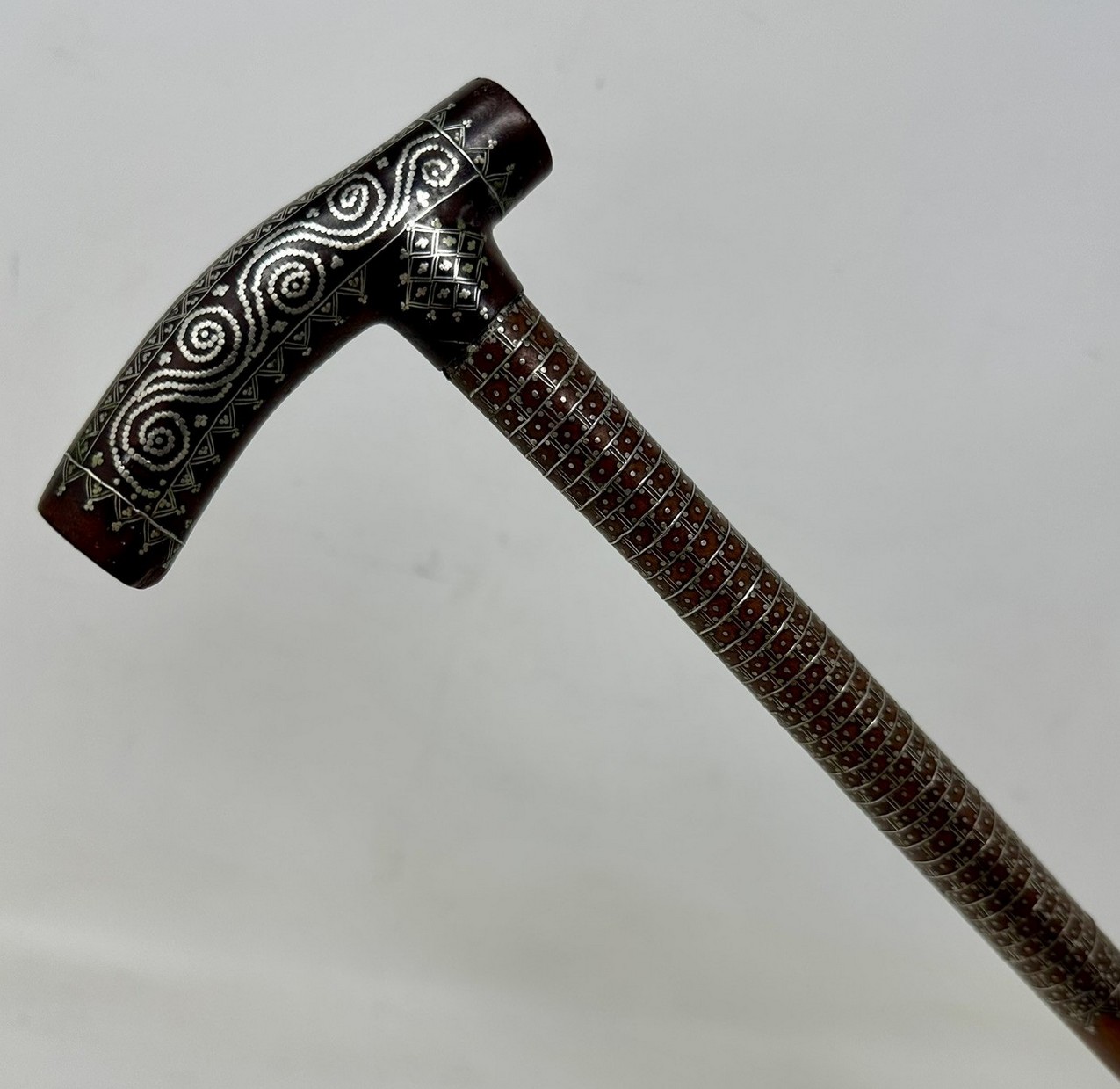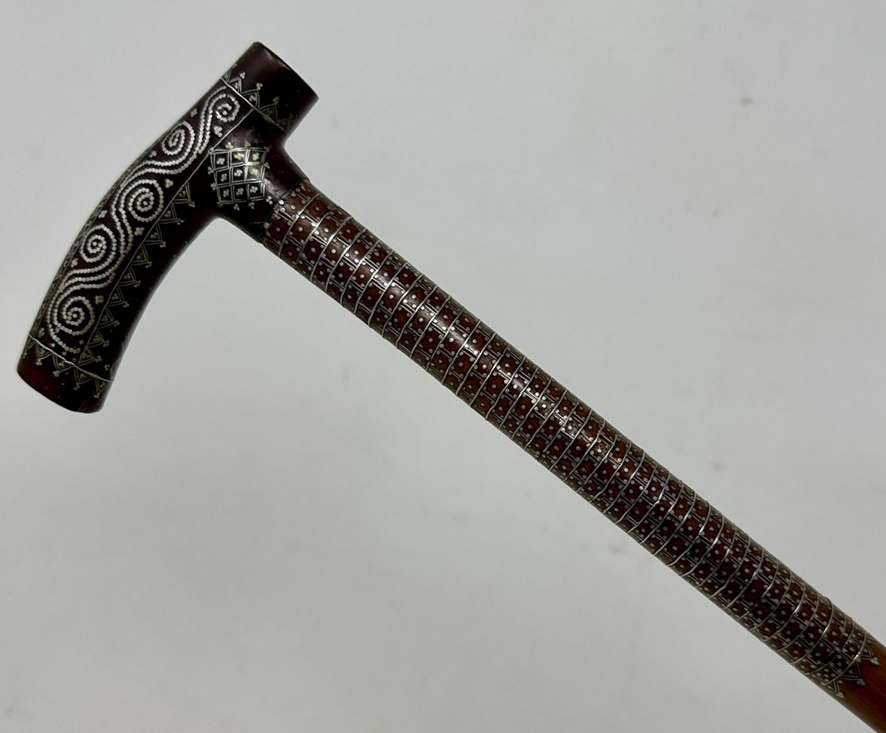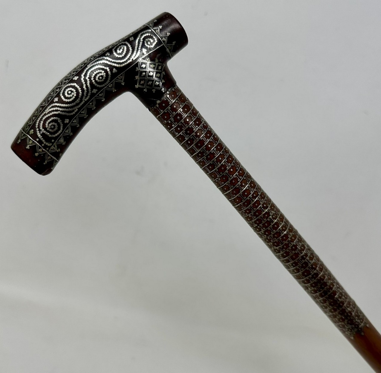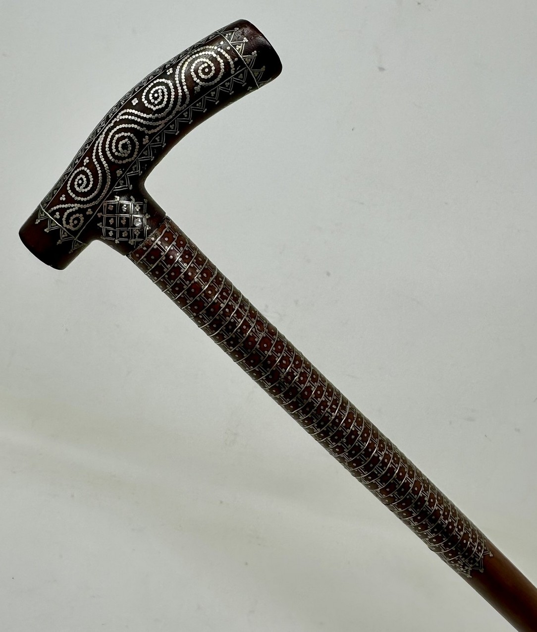 The Tau shaped handle with unusual silver claute pique inlaid decoration depicting scrolling and diamond detail above a tapering shaft with similar decoration towards the upper area, complete with its original bi-metal polished ferrule.