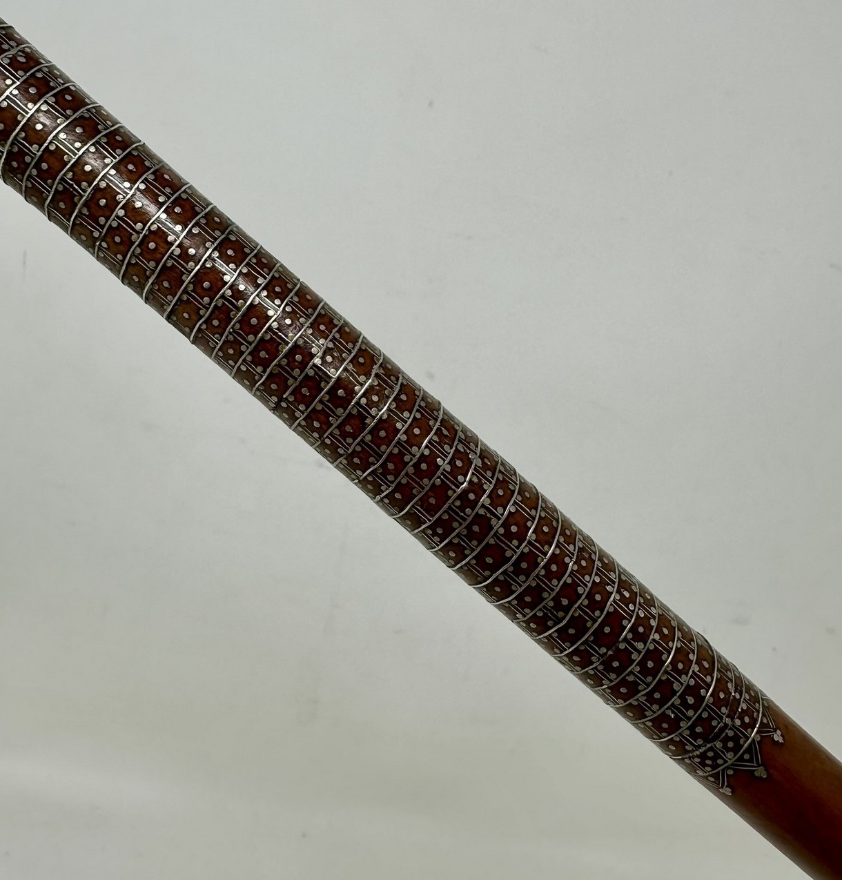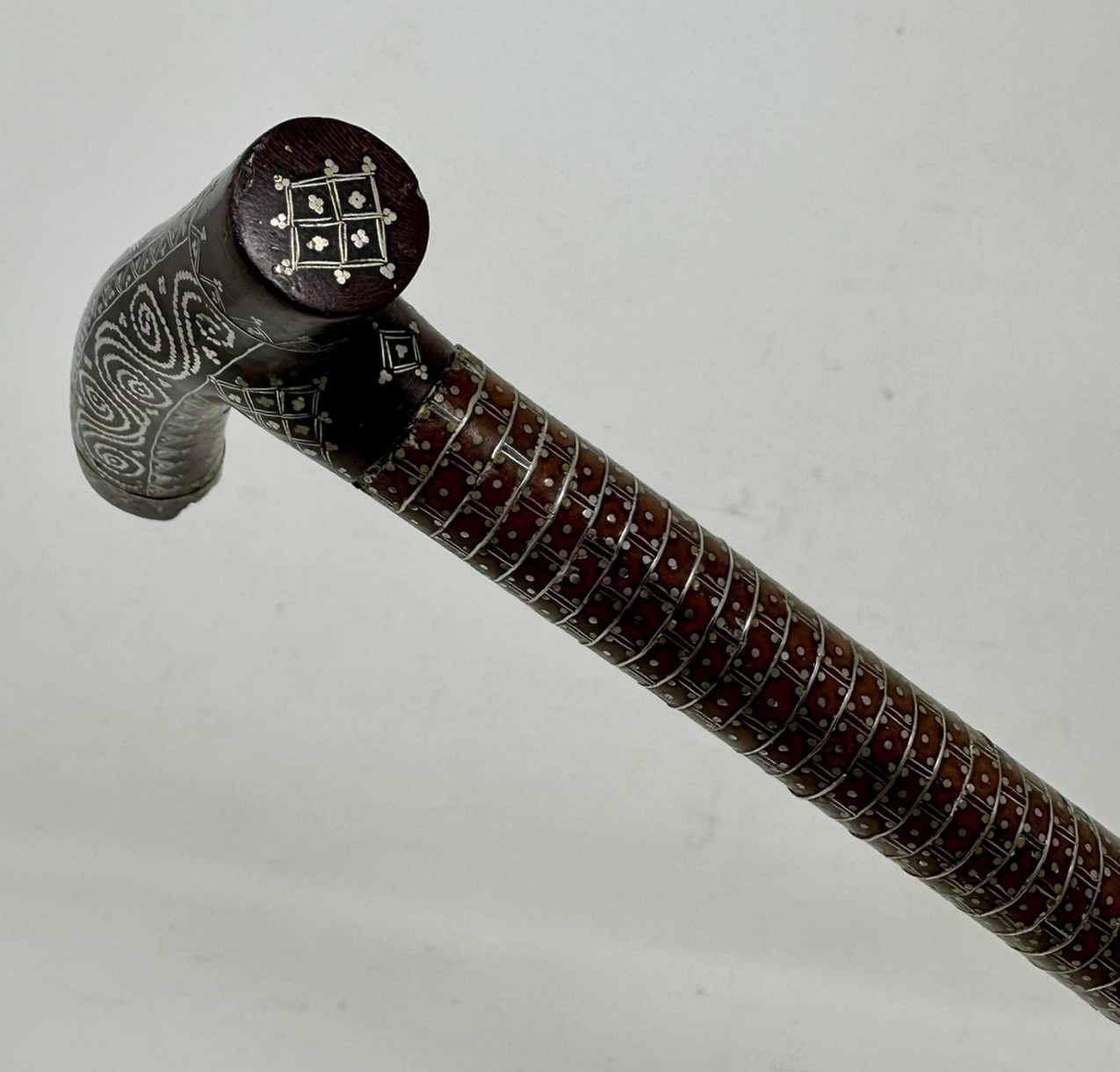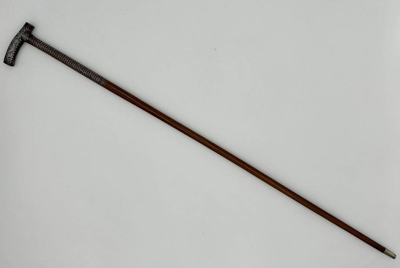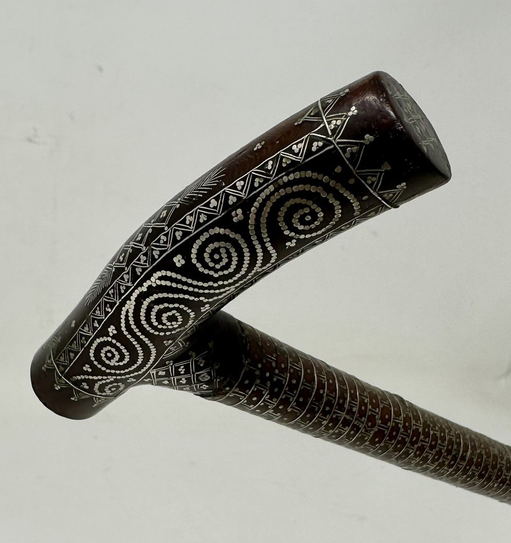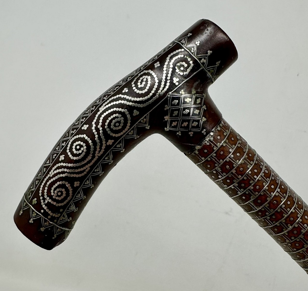 The Tau shaped handle with unusual silver claute pique inlaid decoration depicting scrolling and diamond detail above a tapering shaft with similar decoration towards the upper area, complete with its original bi-metal polished ferrule.