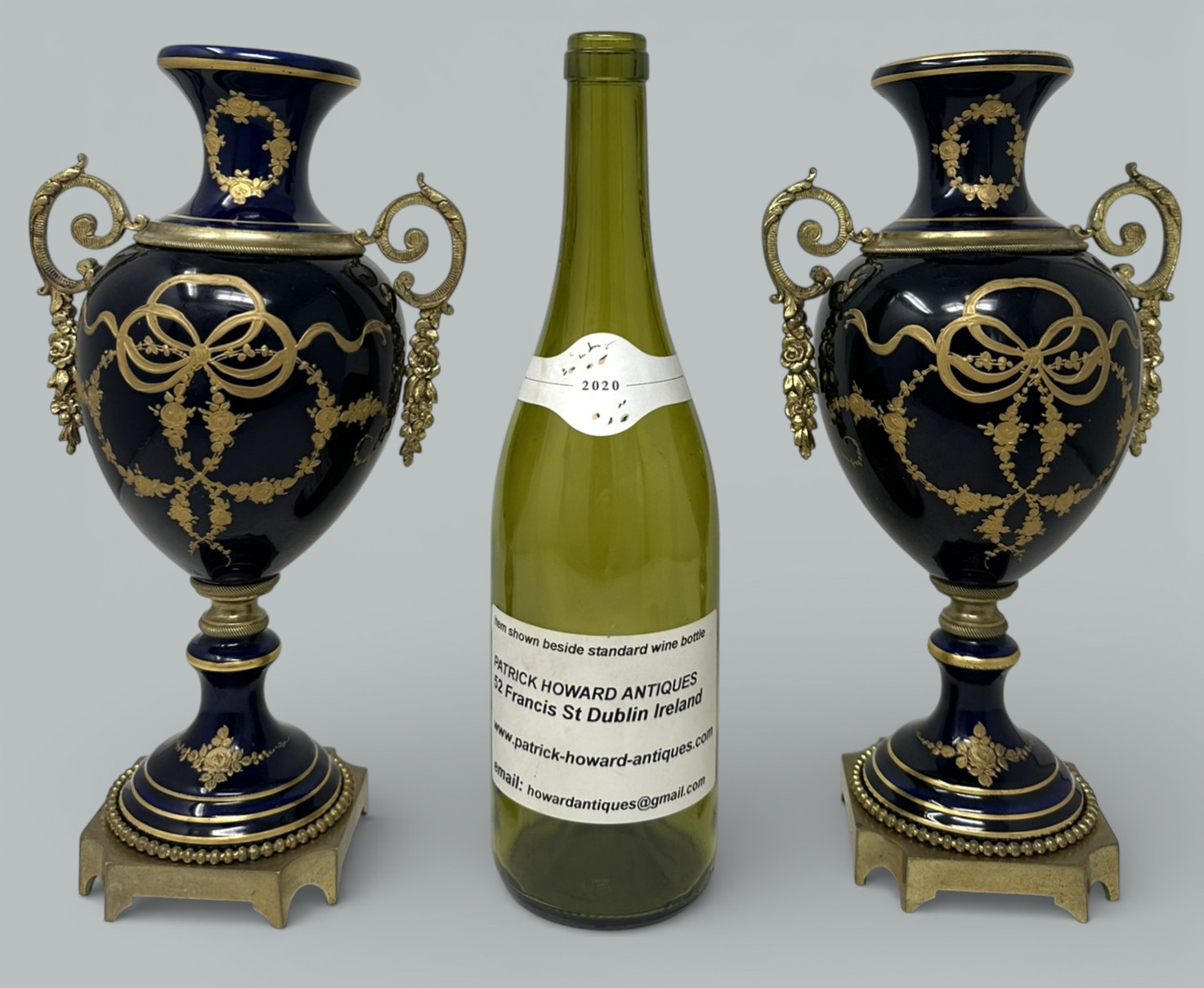 289. Antique Pair Cobalt Blue French Sèvres Porcelain Ormolu Urns Vases Garnitures