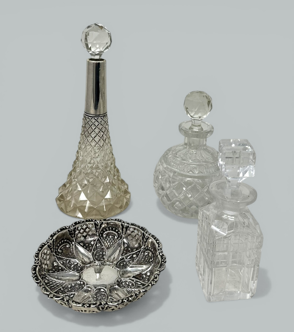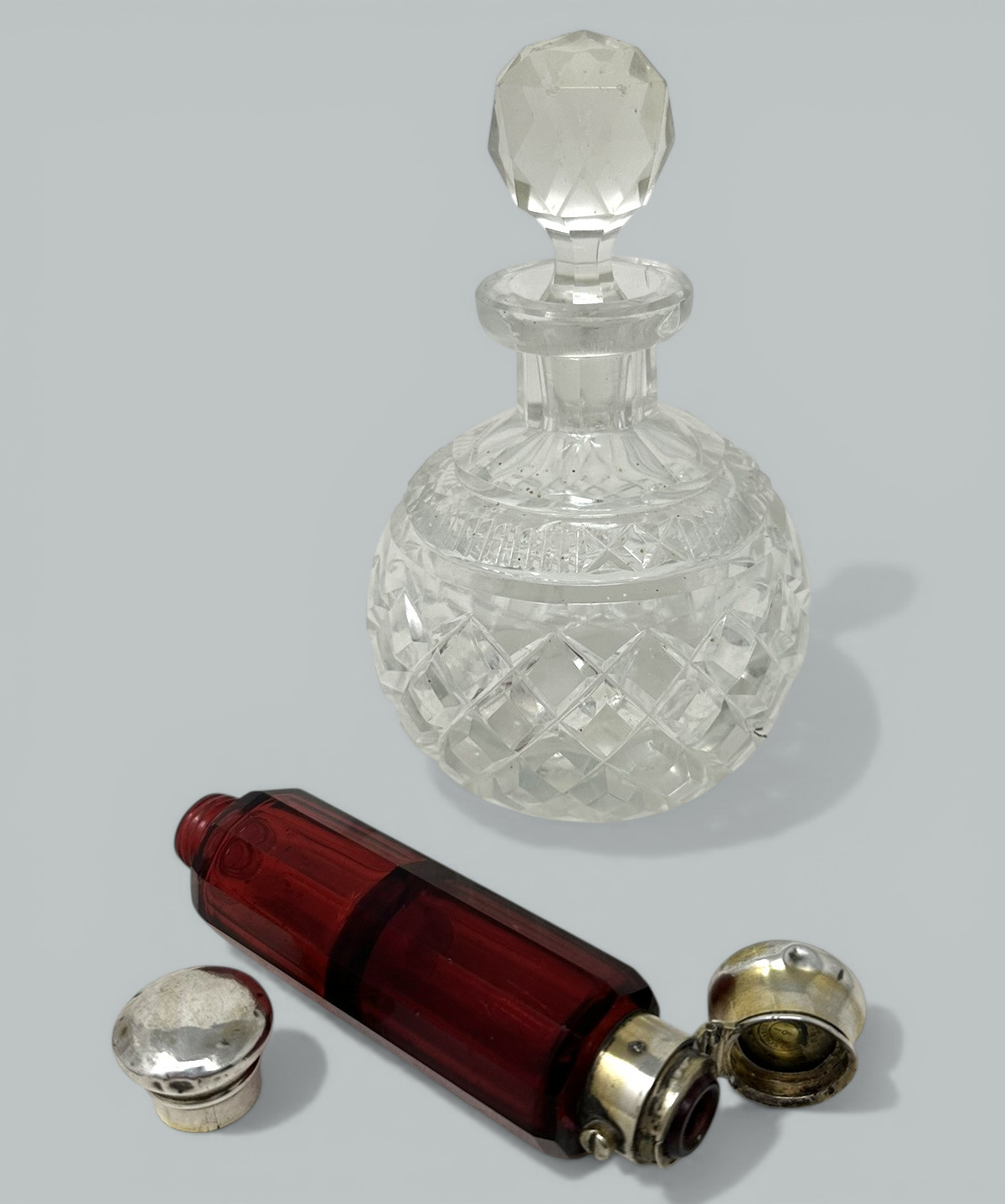 / 303. Collection English Crystal Sterling Silver Cranberry Toilet Scent Perfum Bottles