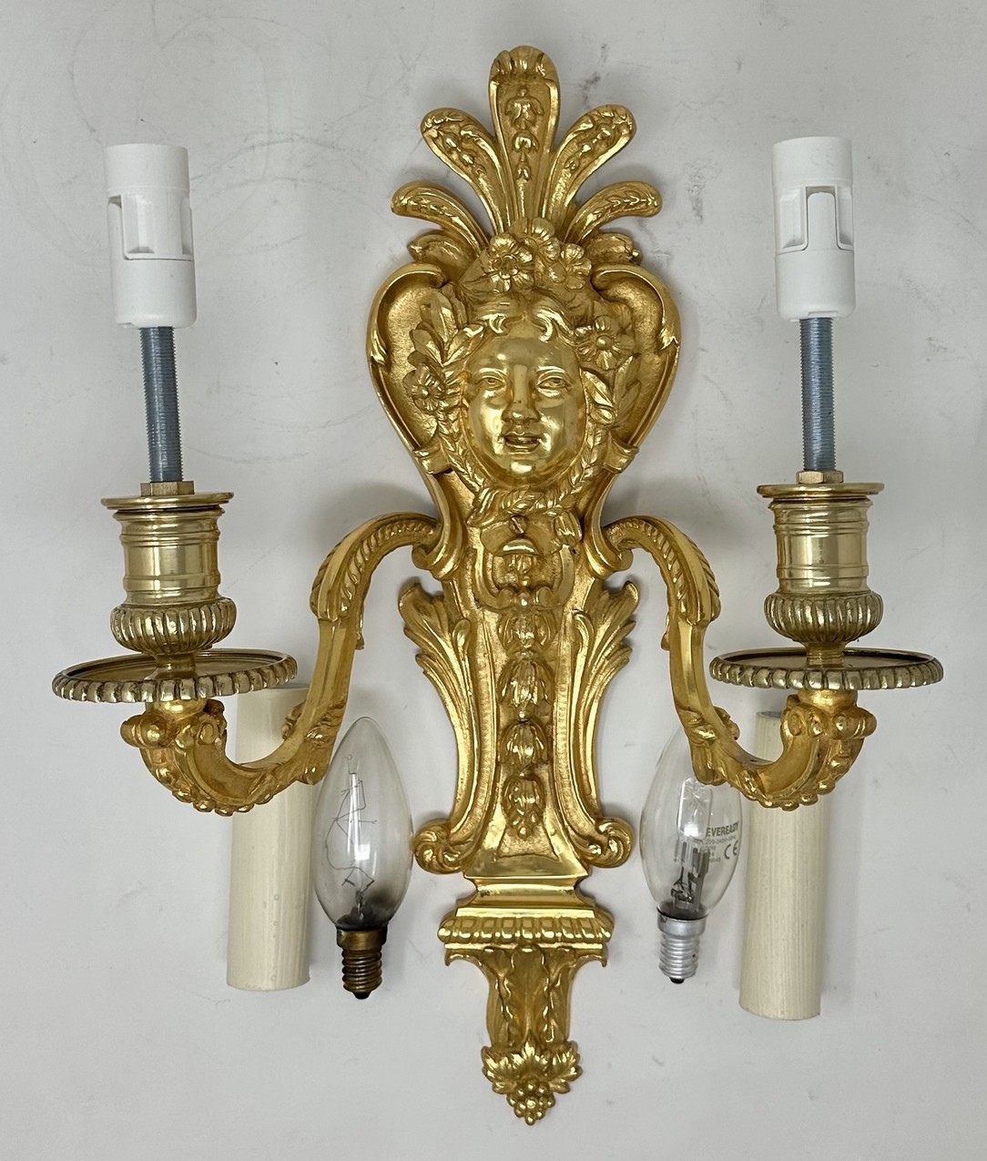 Each two leaf capped scroll arms issuing from a single solid back plate which depicts an Egyptian style female face surrounded with flowers below a very unusual feathered opening fan head dress ending with acanthus leaf detailing. The circular arm plates with beaded rim detail and their original drip pans.