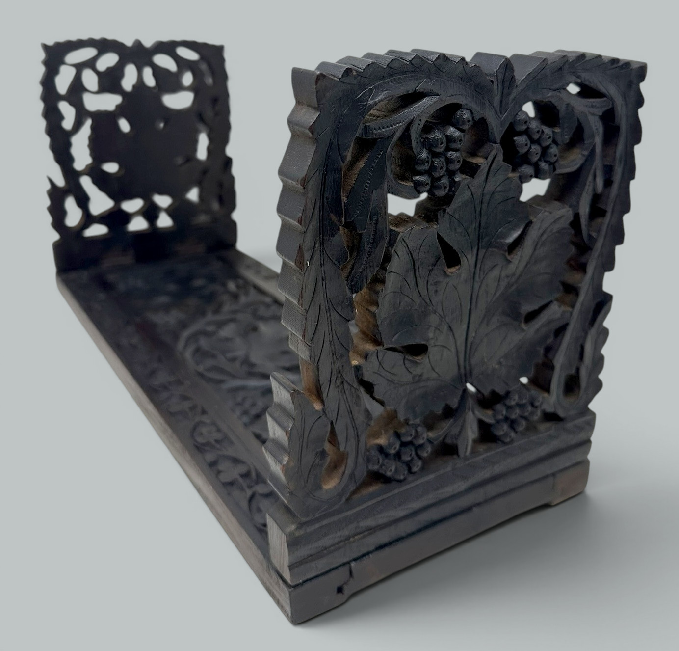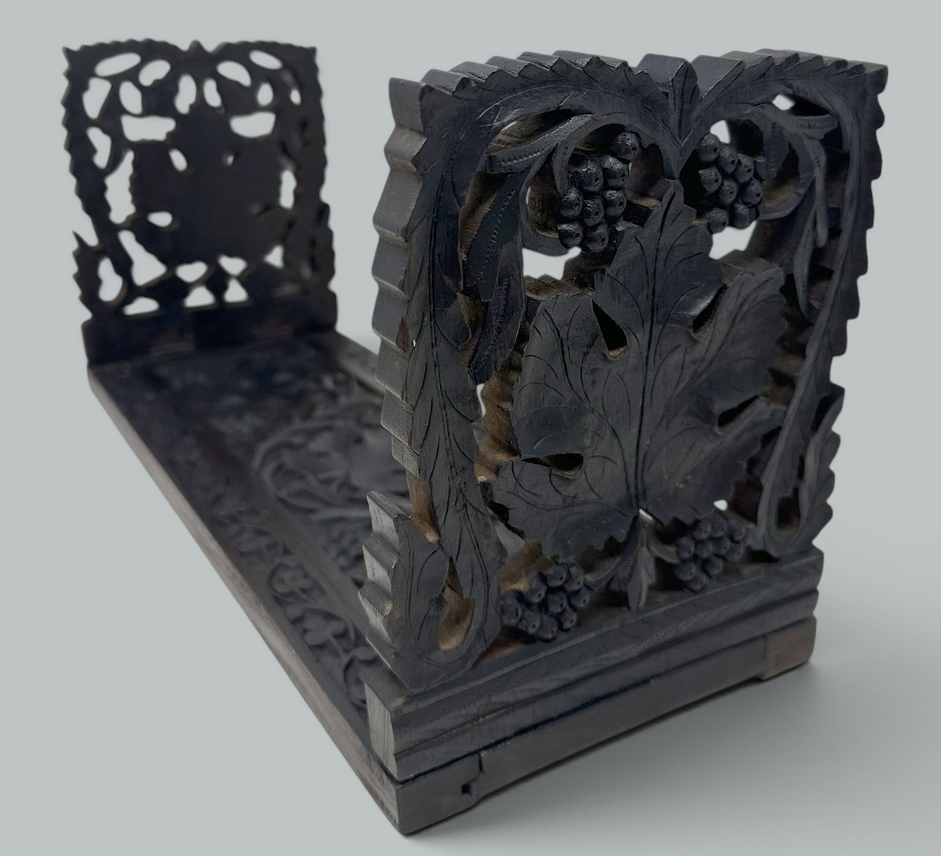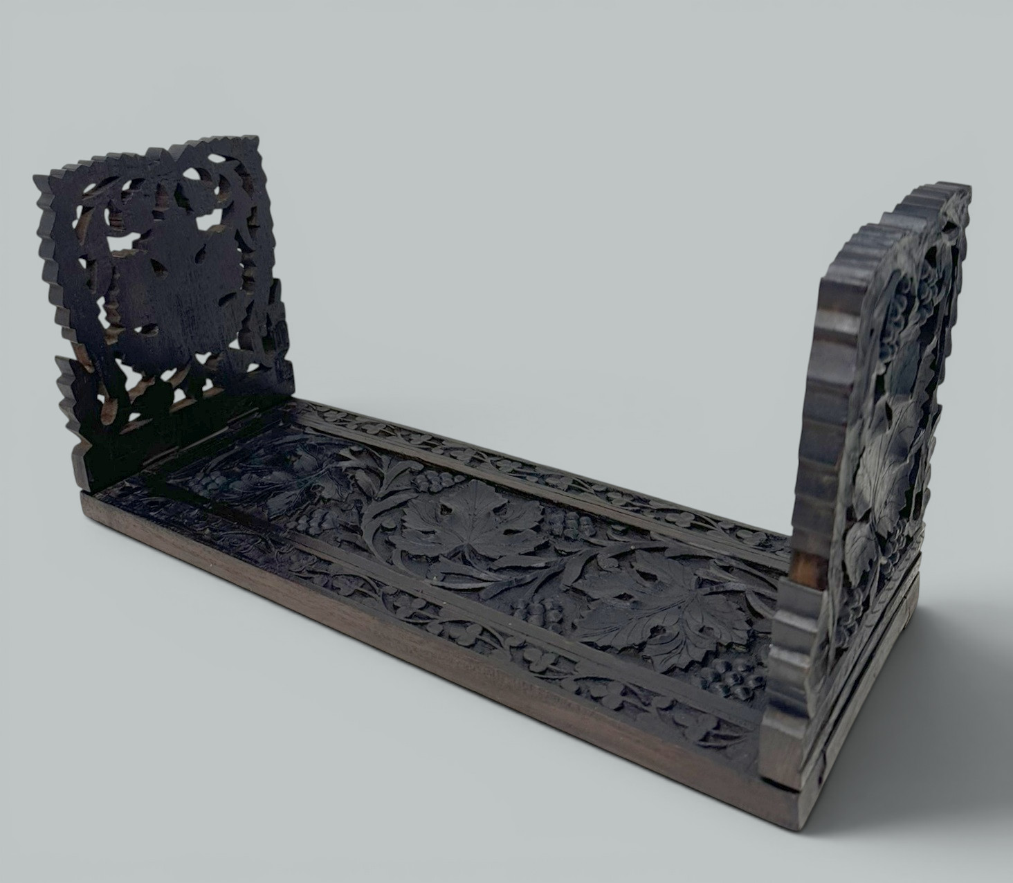 Absolutely stunning hand carved Swiss Black Forest very dark brown possibly Walnut wood (sometimes confused with Irish Bog Oak from Ireland) foldable Bookslide of exceptional quality and traditional form. Mid to late Nineteenth Century.