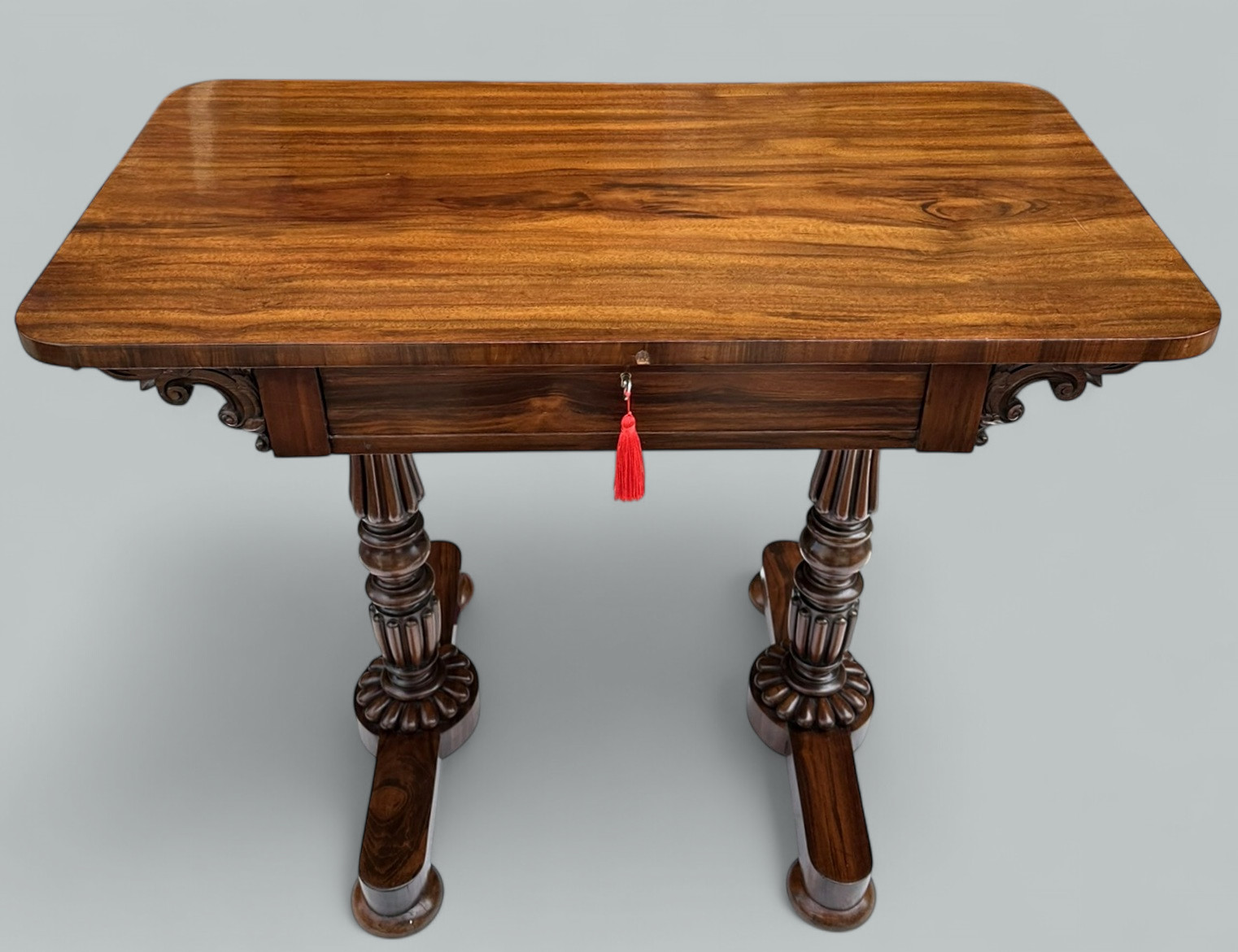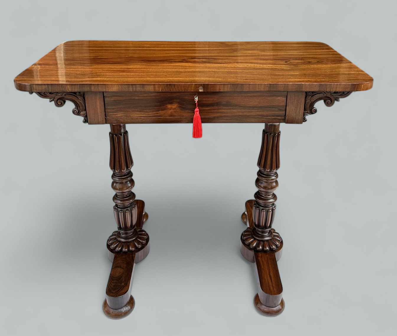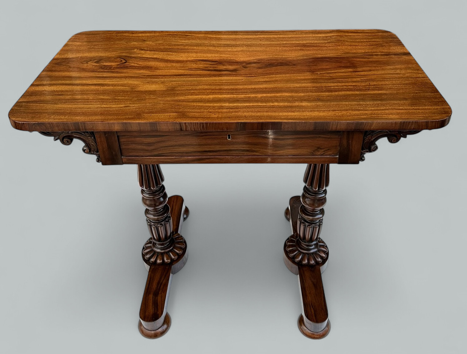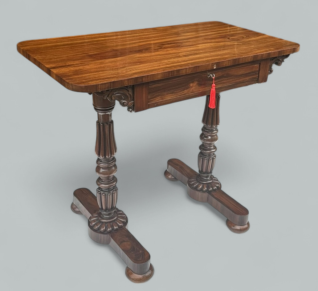 A Very Imposing example of an English well figured Rosewood Regency Period rectangular Lady’s single drawer Desk or occasional side table of compact proportions, in the manner of renowned Cabinet Makers Gillows of Lancaster and London. Circa 1815-20.