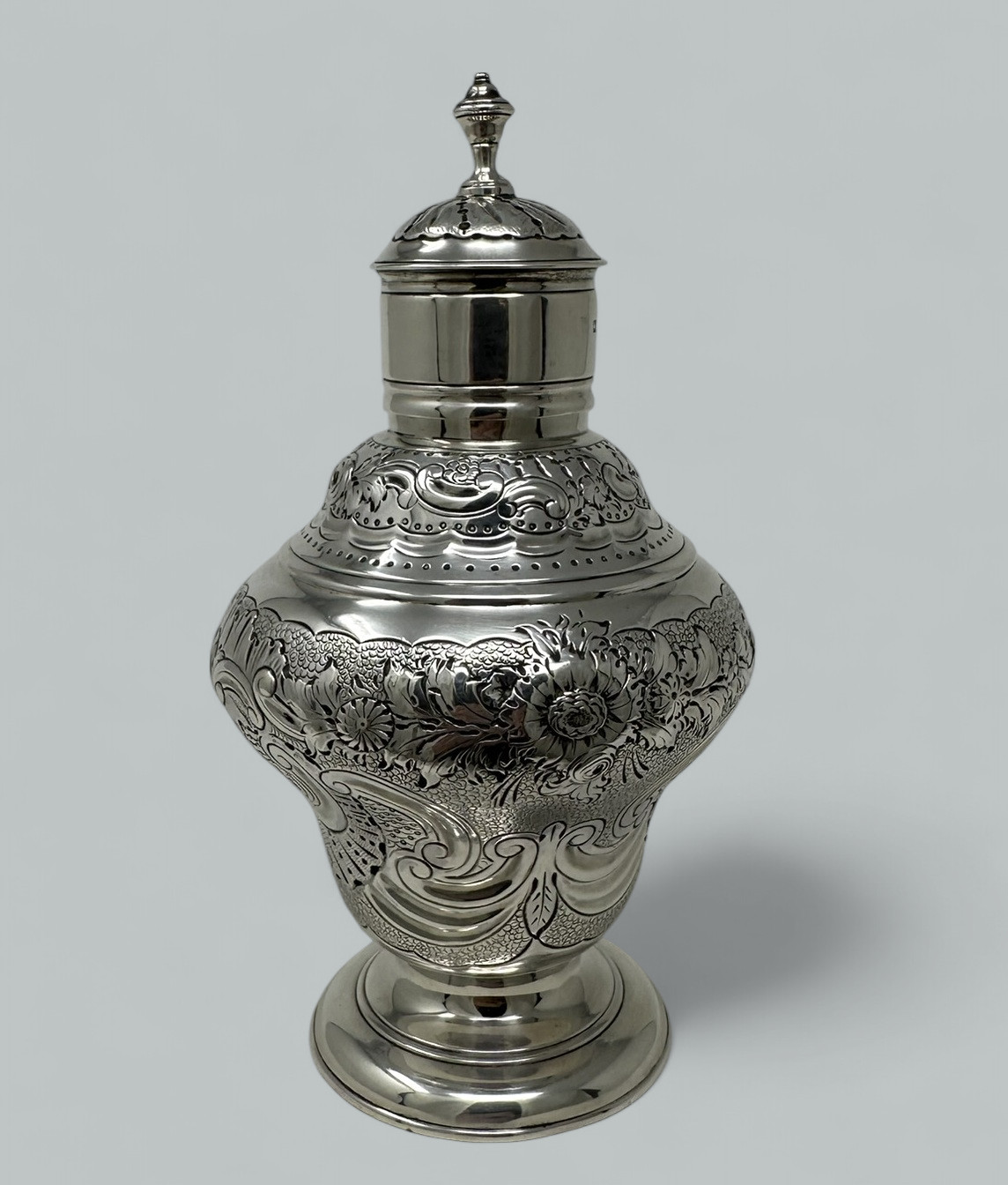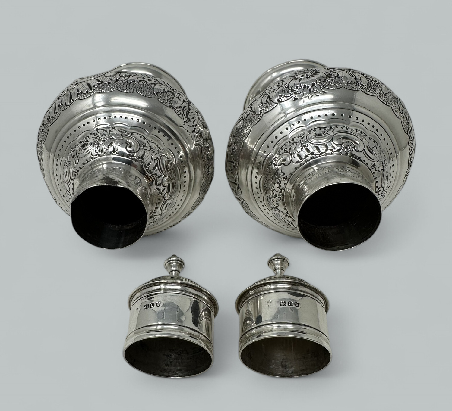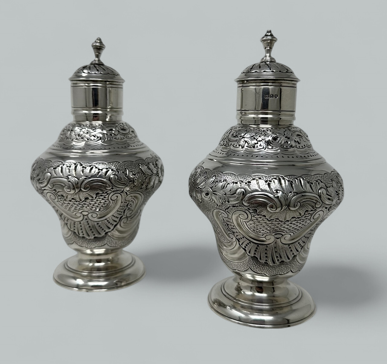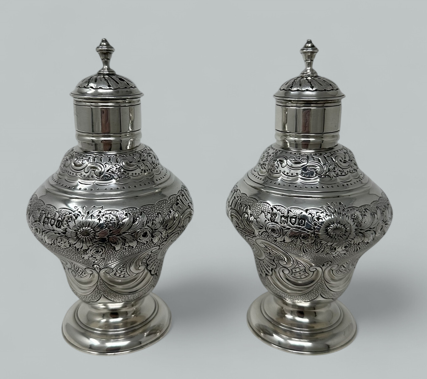 An Absolutely Stunning Identical Pair of English Sterling Silver Eighteenth Century style Tea Caddies early Twentieth Century after an Eighteenth-Century model.