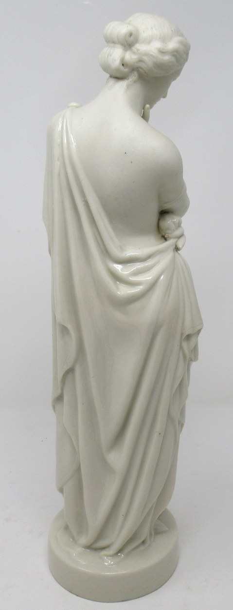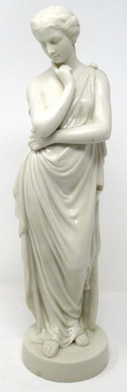This rare standing female figure depicts a lady in deep thought, draped in a wonderful glazed cloth and wearing sandals, the body is unglazed porcelain known as parian.