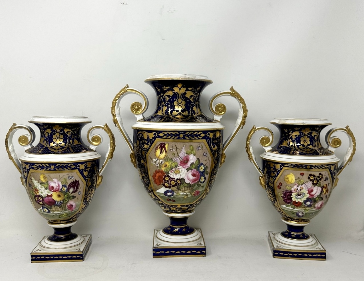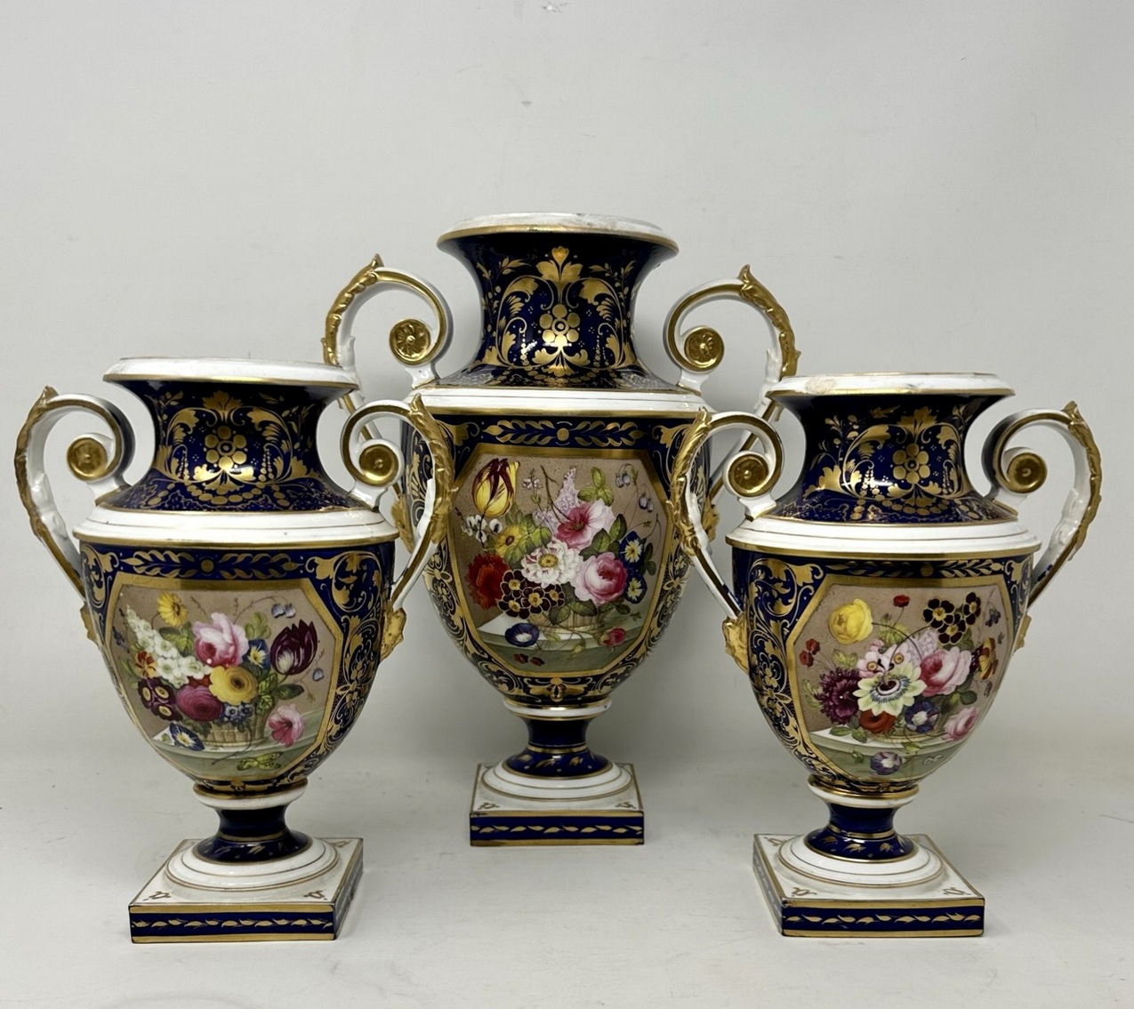 An exceptionally fine quality rare example of an early Bloor period Royal Crown Derby hand painted porcelain Garniture of generous proportions by Thomas Steel. First quarter of the Nineteenth Century, Regency period.