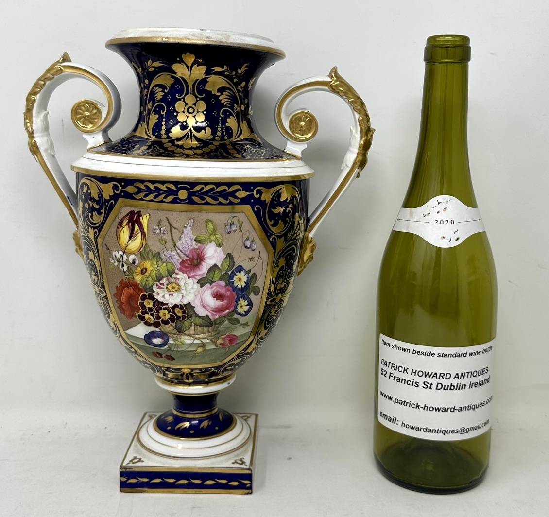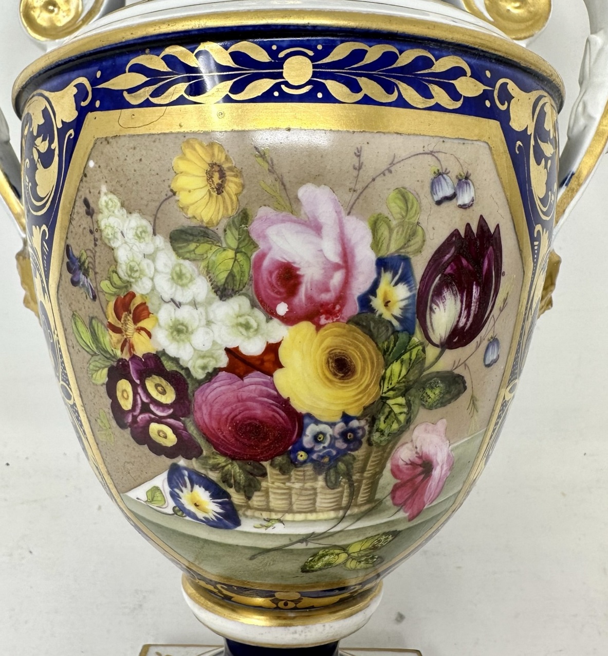 Each vase finely painted on the front of the shield-shaped body with a colorful cluster of Summer Flowers and old-fashioned Roses beneath a gilt neoclassical motif on the waisted neck, affixed on each side with a gilt acanthus leaf-molded handle terminating in a gilt satyr’s head and raised on a circular foot and square base.