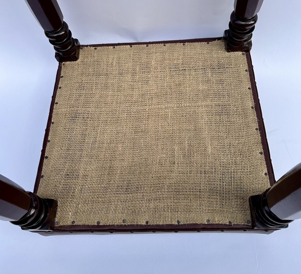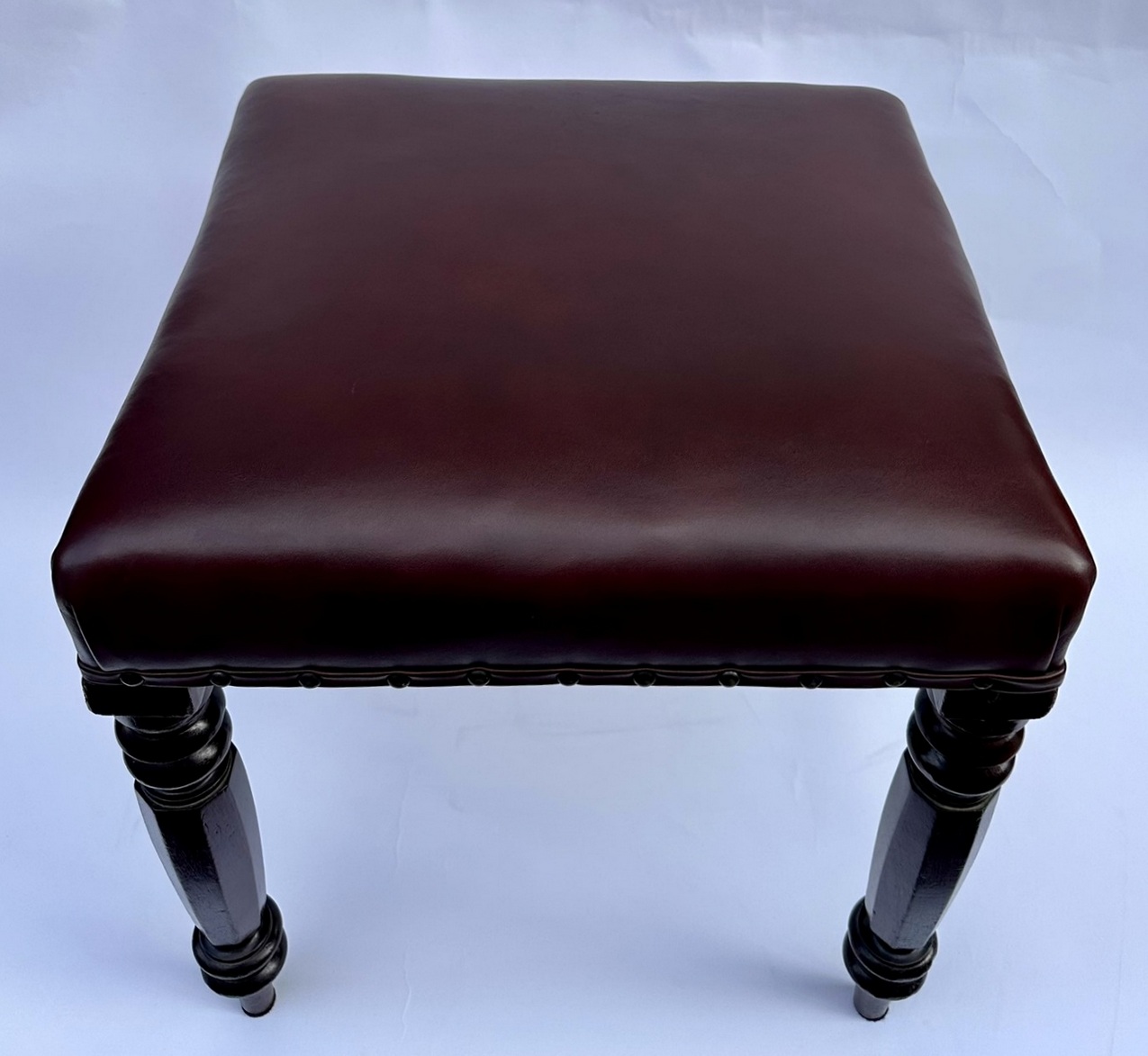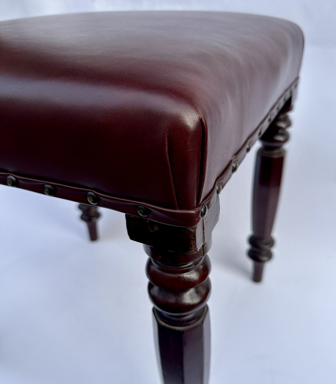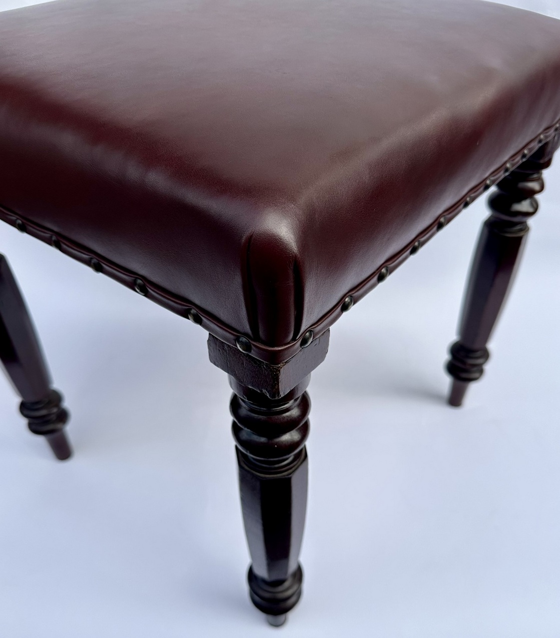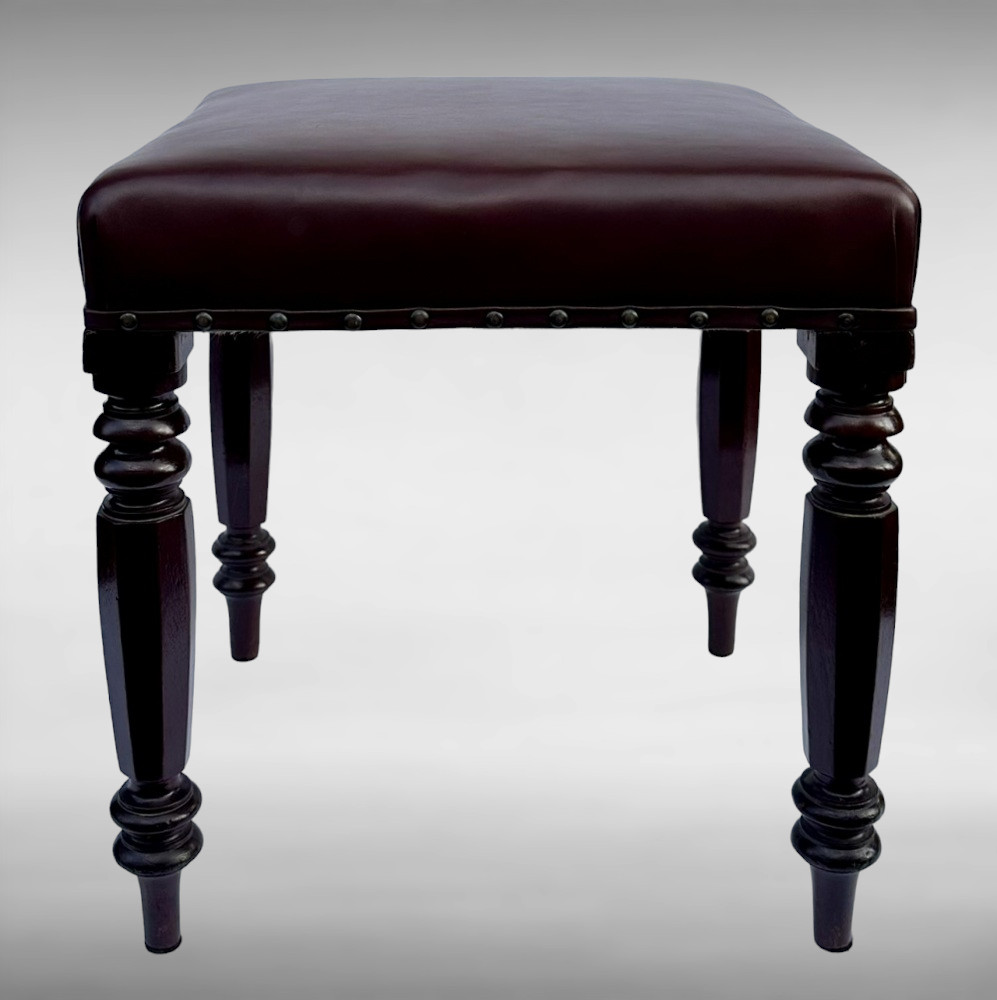 Each solid frame constructed in figured mahogany, the rectangular seat above four attractive hand carved supports of hexagon form with ring turned details at upper and lower areas.