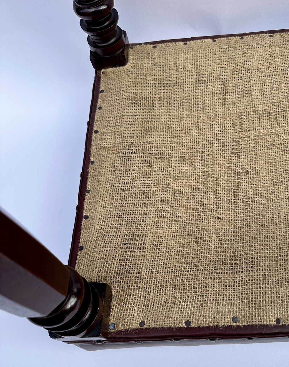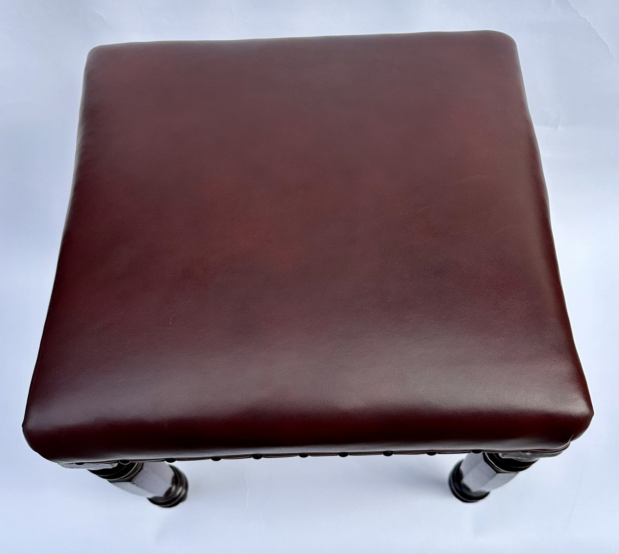 Condition: Good condition, nice surface patination, professionally re-upholstered in a dark burgundy cowhide leather which is very nicely done.