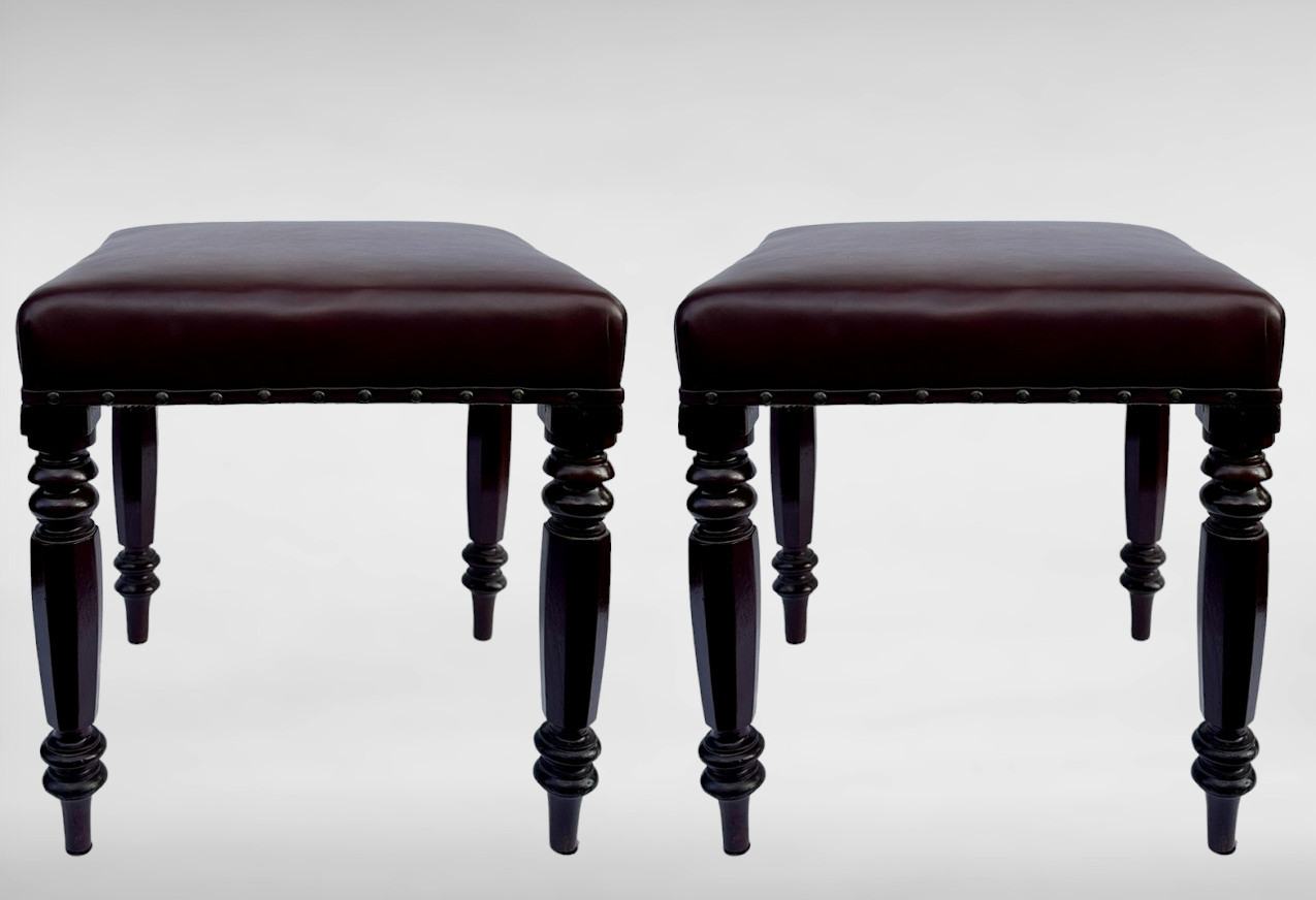 378. Pair Antique English Victorian Carved Mahogany Leather Upholstered Stools 19 Ct