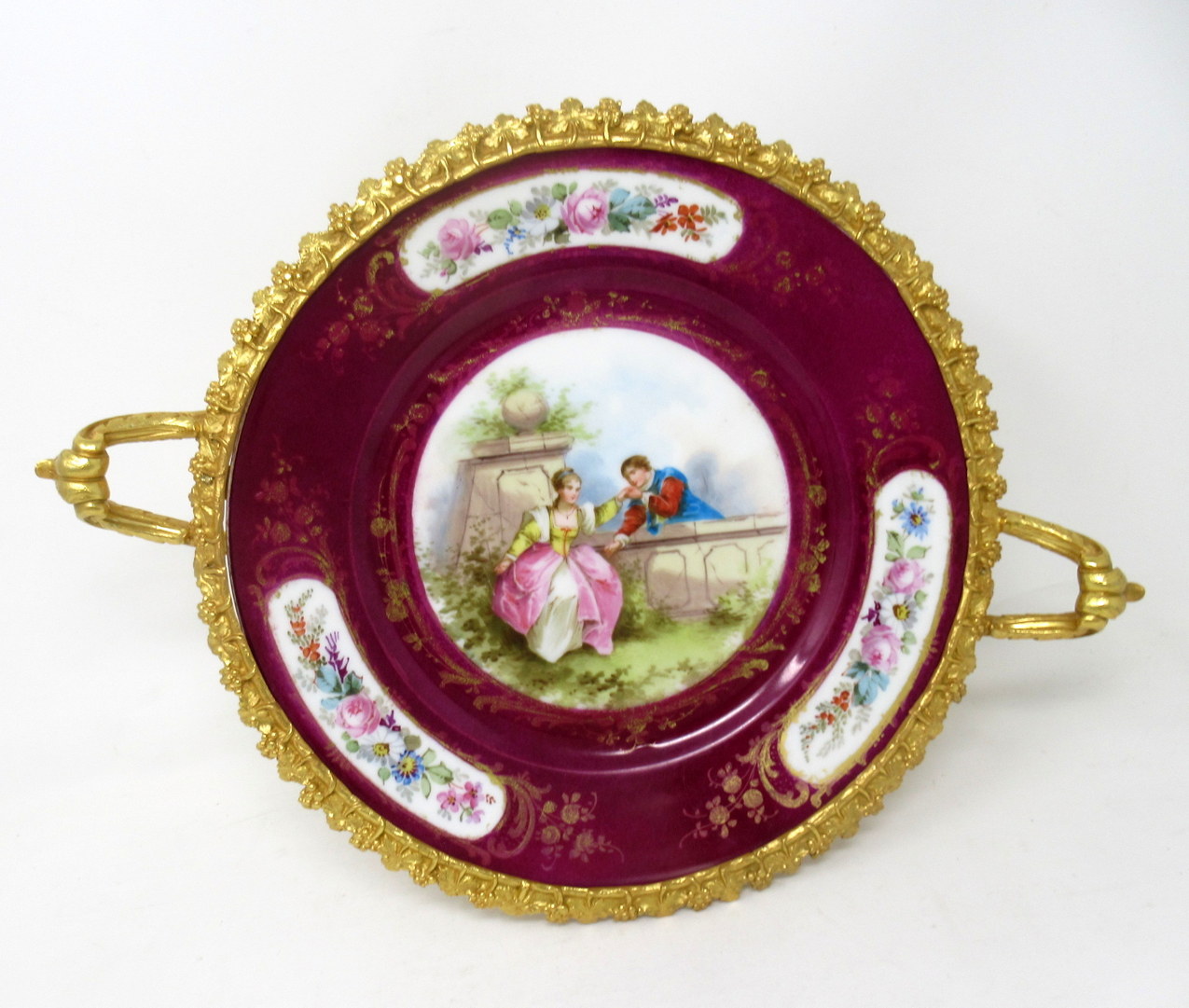 The central reserve with hand painted decoration depicting a Romantic Couple in Eighteenth Century Dress on a burgundy ground with segments of floral decoration.