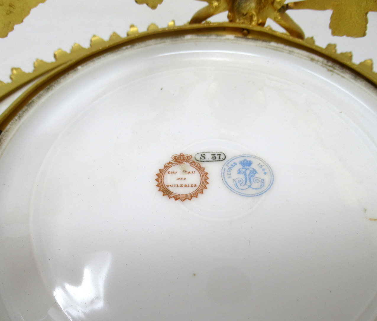 Condition: Professionally re-gold plated, some surface wear to gilding on the porcelain plate, no restoration or losses. Base marks as shown on last image.