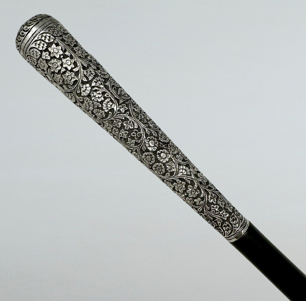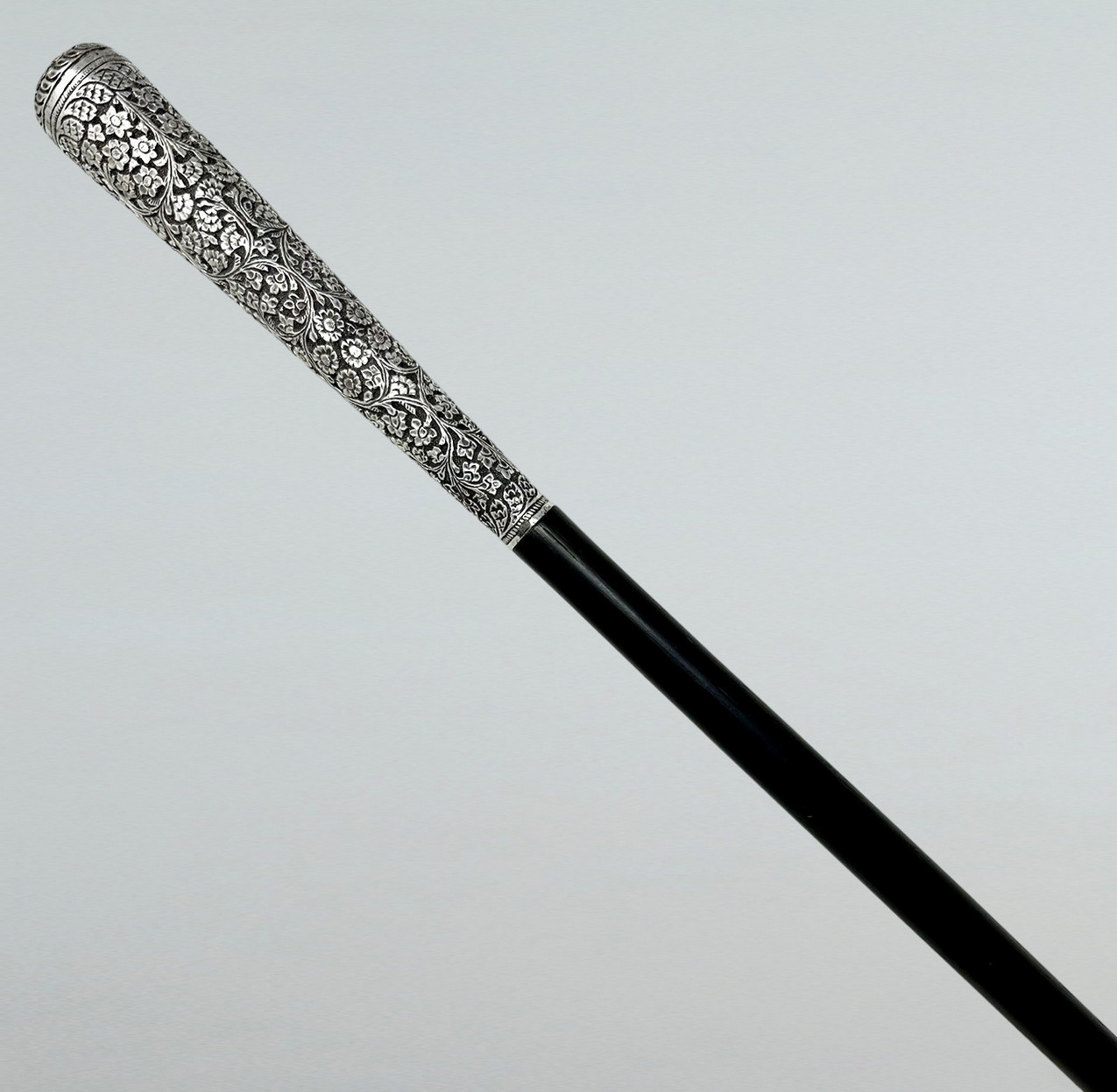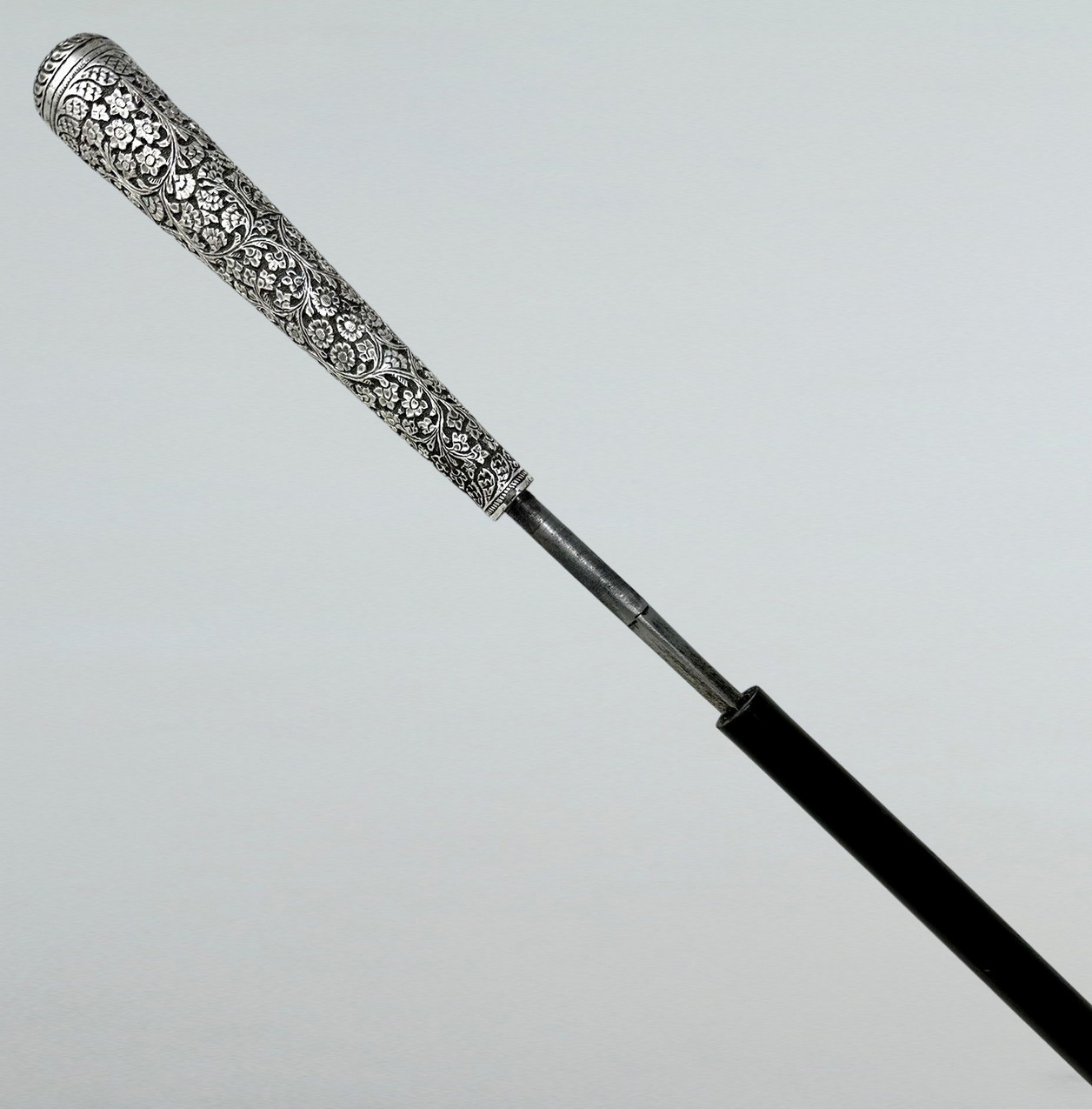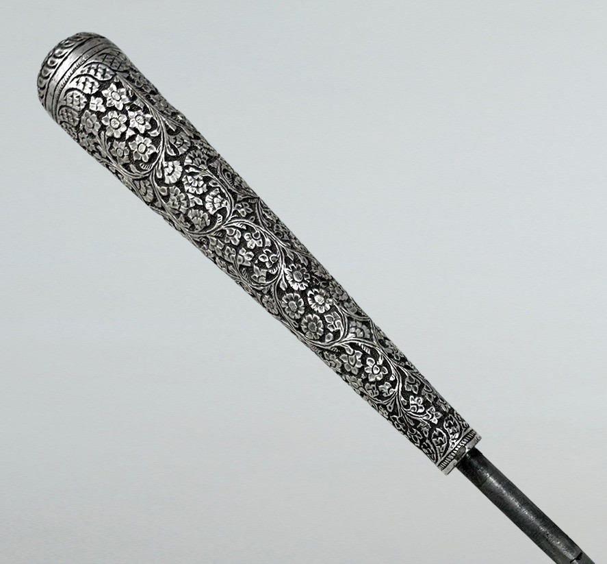 The Sterling Silver six inch long grip with lavish embossed silver floral decoration above a tapering shaft with original three inch bi-metal (polished brass and steel) unusually long ferrule.