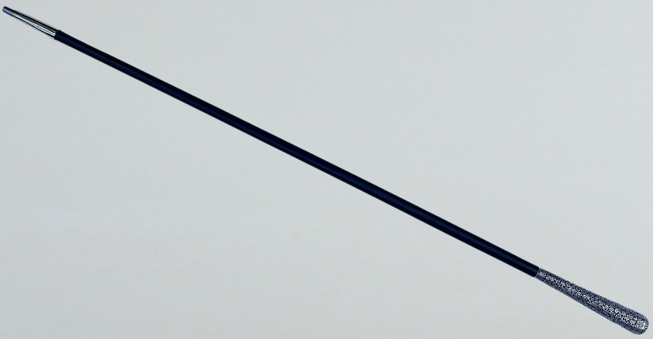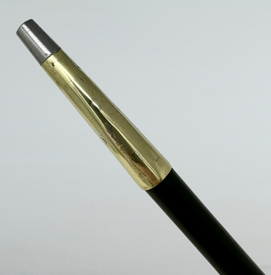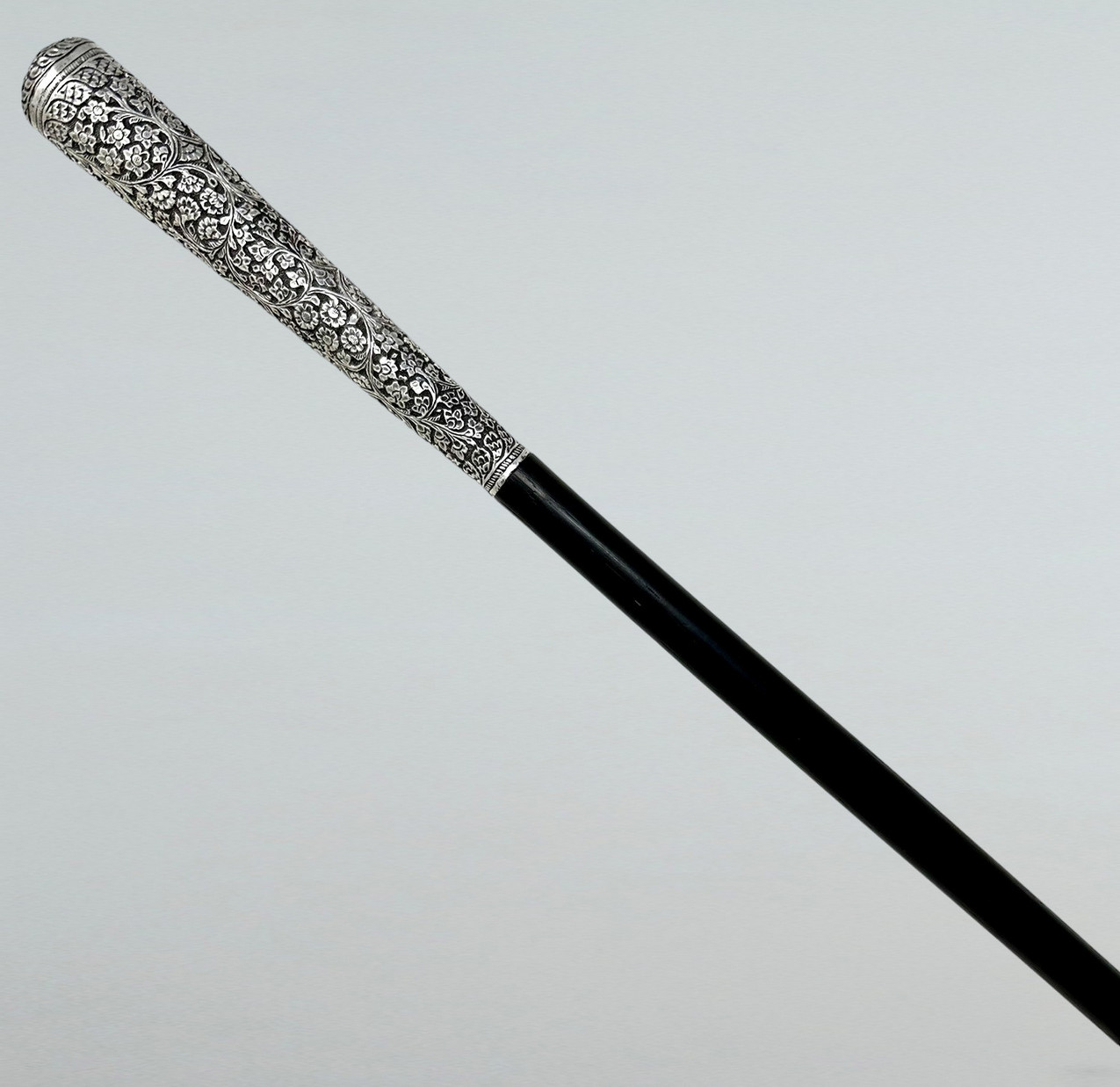 The Sterling Silver six inch long grip with lavish embossed silver floral decoration above a tapering shaft with original three inch bi-metal (polished brass and steel) unusually long ferrule.